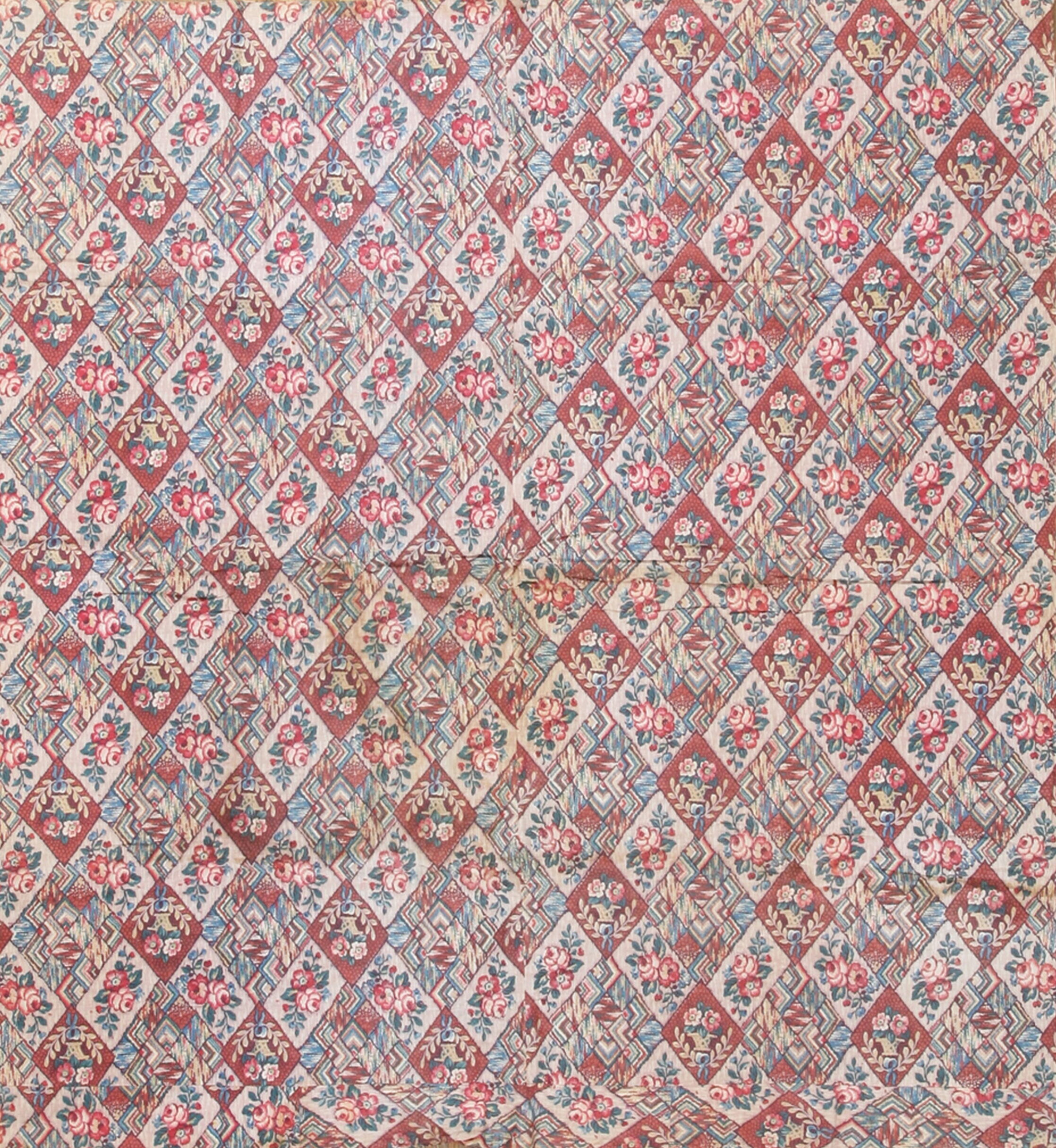 The design utilizes a dense, repetitive diamond lattice, giving the impression of a meticulously pieced quilt. Each diamond frame alternates between stylized floral bouquets—often containing roses and smaller filler flowers—and complex geometric segments composed of chevrons and angular lines. This dense coverage creates a truly captivating visual field, characteristic of allover rugs that fill the entire surface without relying on a central medallion.