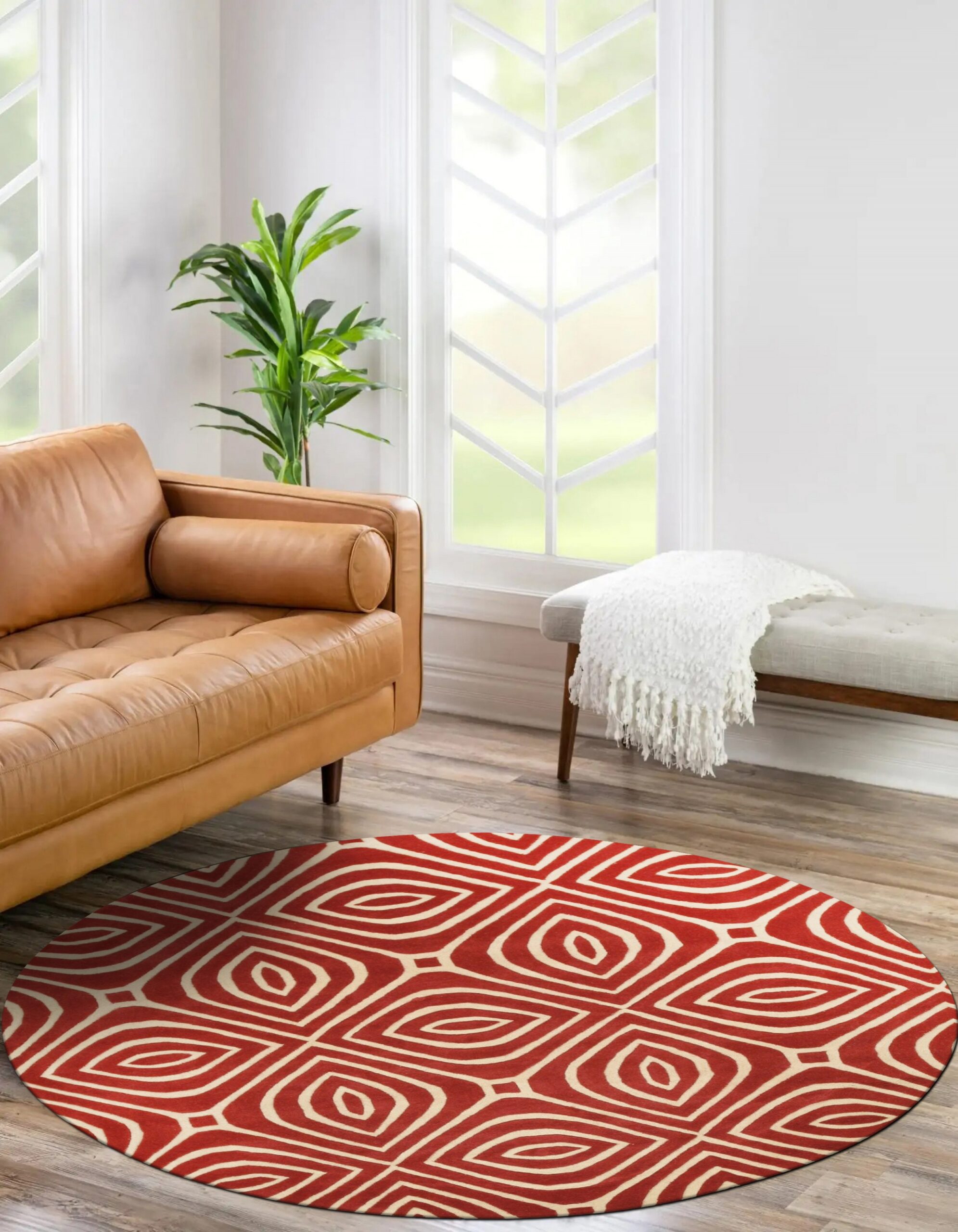 A rich, saturated primary color—a deep, earthy red—dominates the field, outlined sharply by thick, creamy ivory lines. While the hue is decidedly red, its warmth borders on the sophisticated tones found in salmon and coral rugs, ensuring it introduces warmth without overwhelming the space.