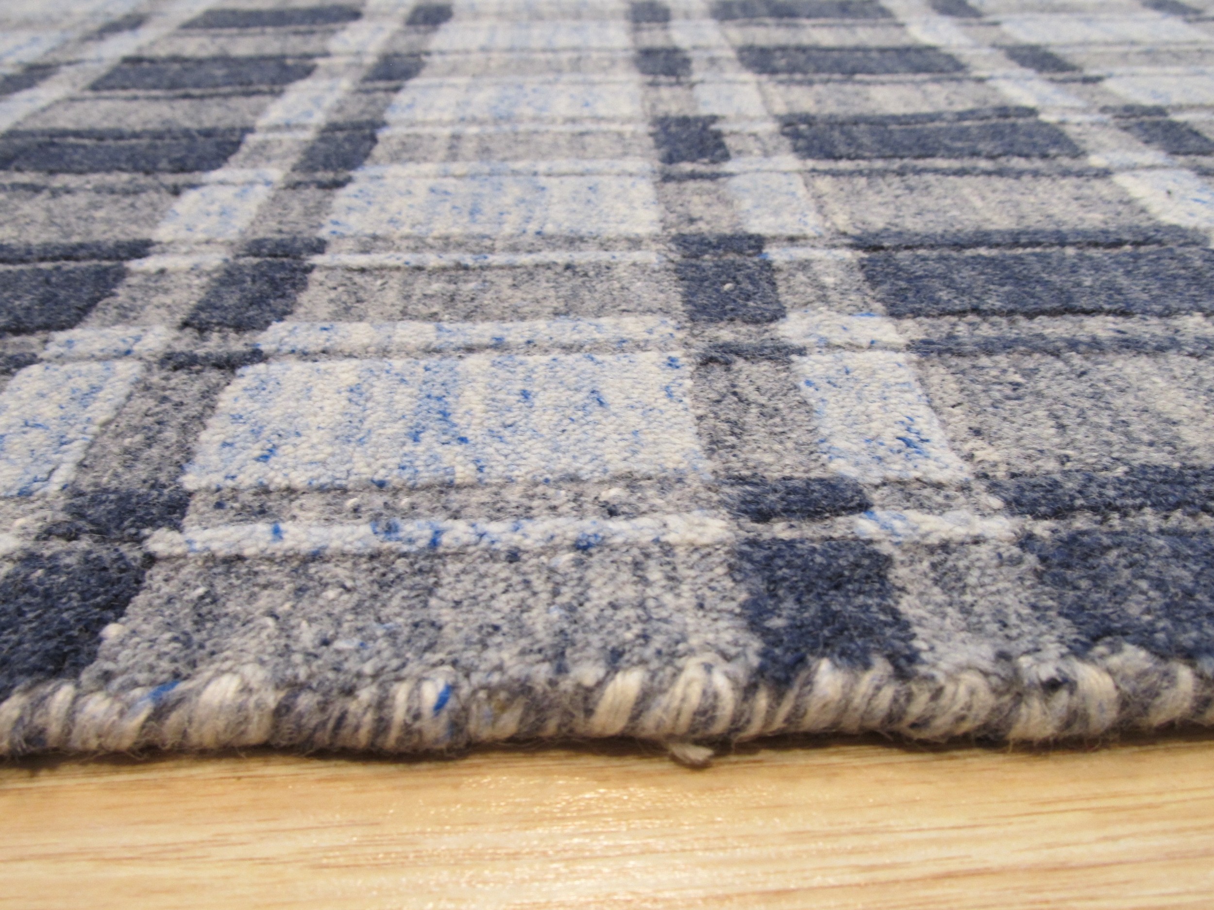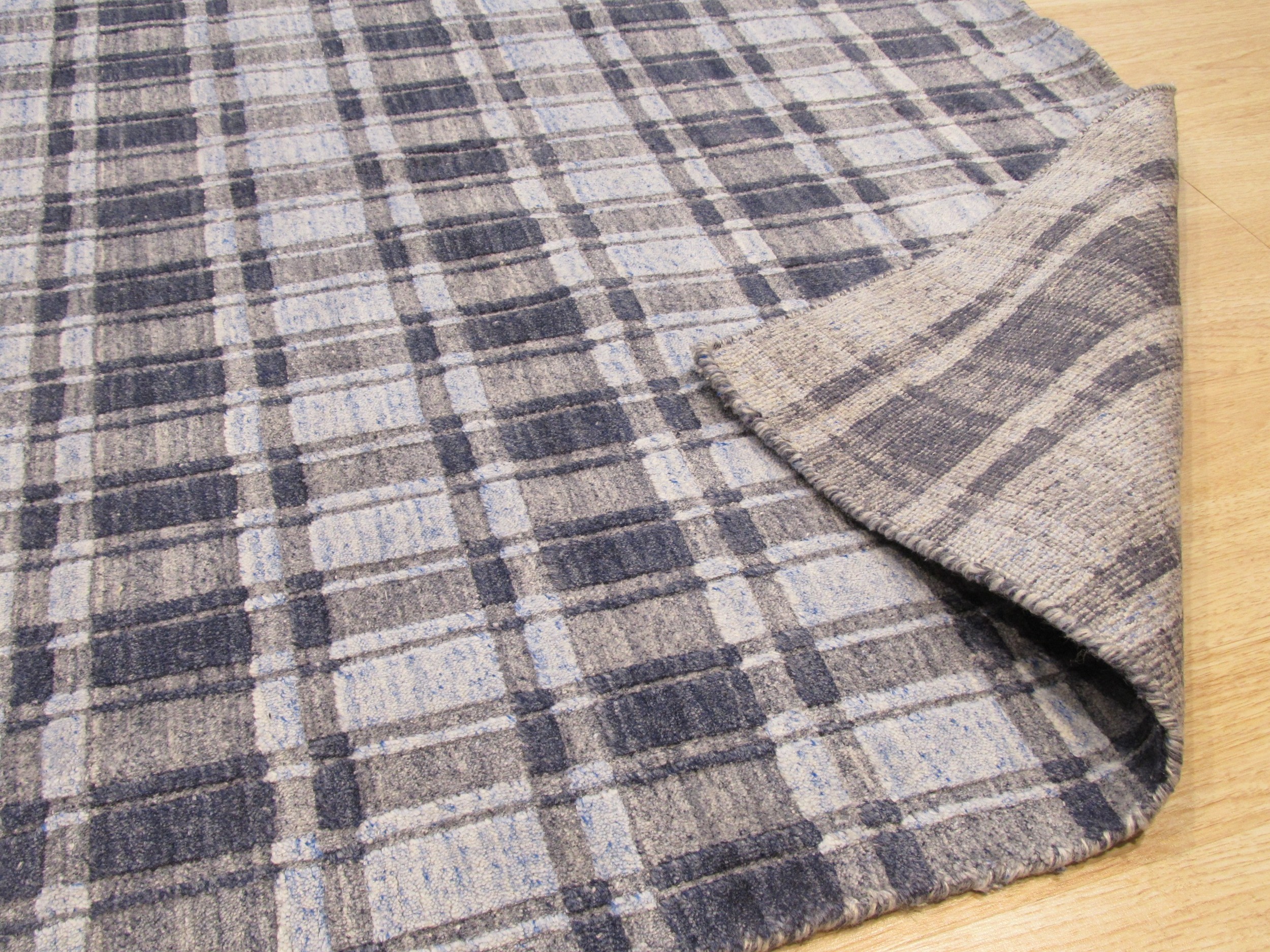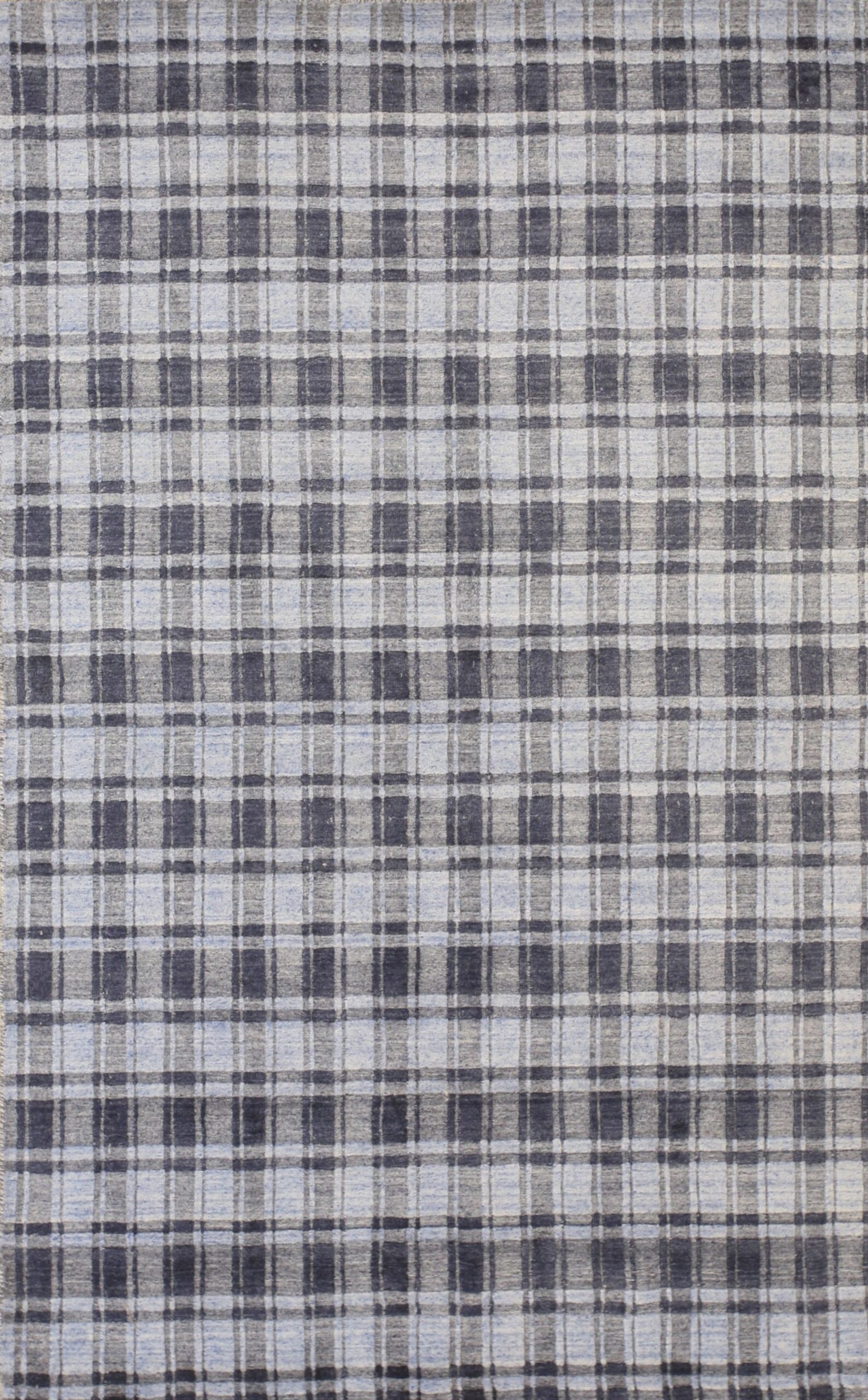 The design employs a subtle, blurred tartan motif, moving away from traditional rigid lines to create a soft, transitional aesthetic. The primary palette utilizes sophisticated shades of slate and dove grey, punctuated by pale, icy tones characteristic of the finest blue color rugs that provide depth and visual interest without overwhelming the space.