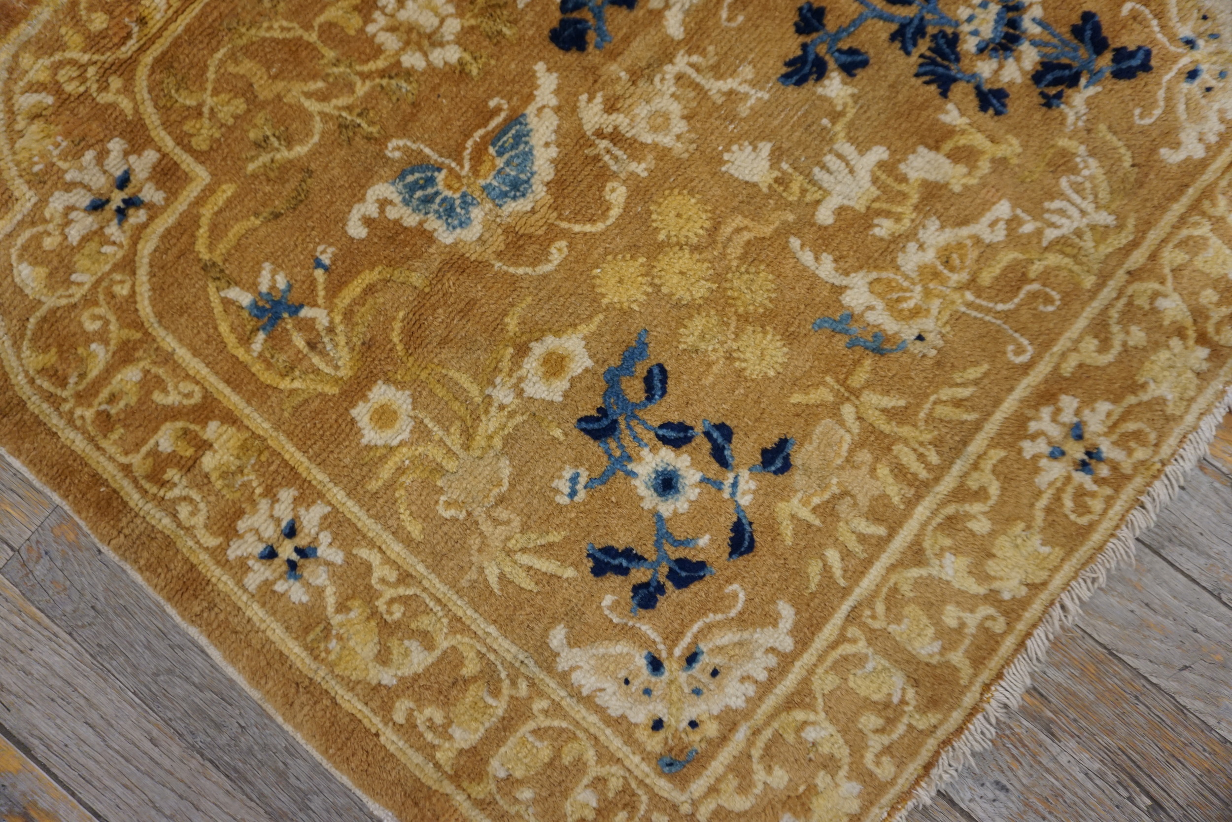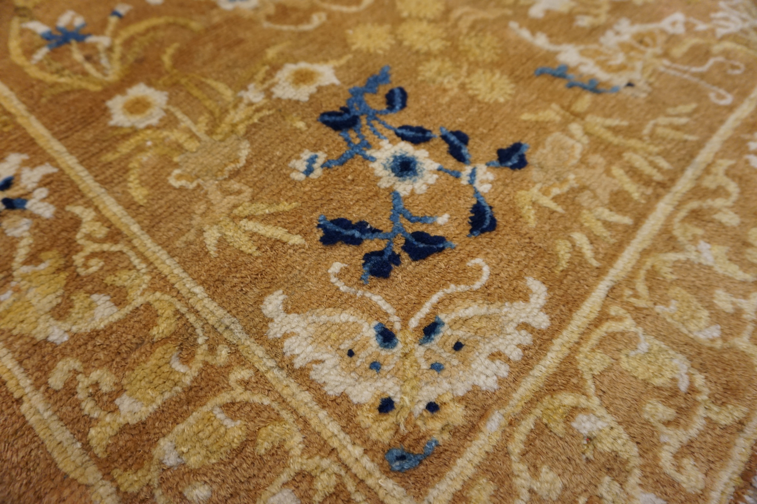 The field is dominated by a rich, warm camel hue, subtly shifting between shades of gold and tan, providing a luminous backdrop for the complex allover floral design. Delicate sprays of stylized blossoms, interspersed with traditional Chinese iconography like the butterfly, float across the surface without a central medallion, creating visual harmony.