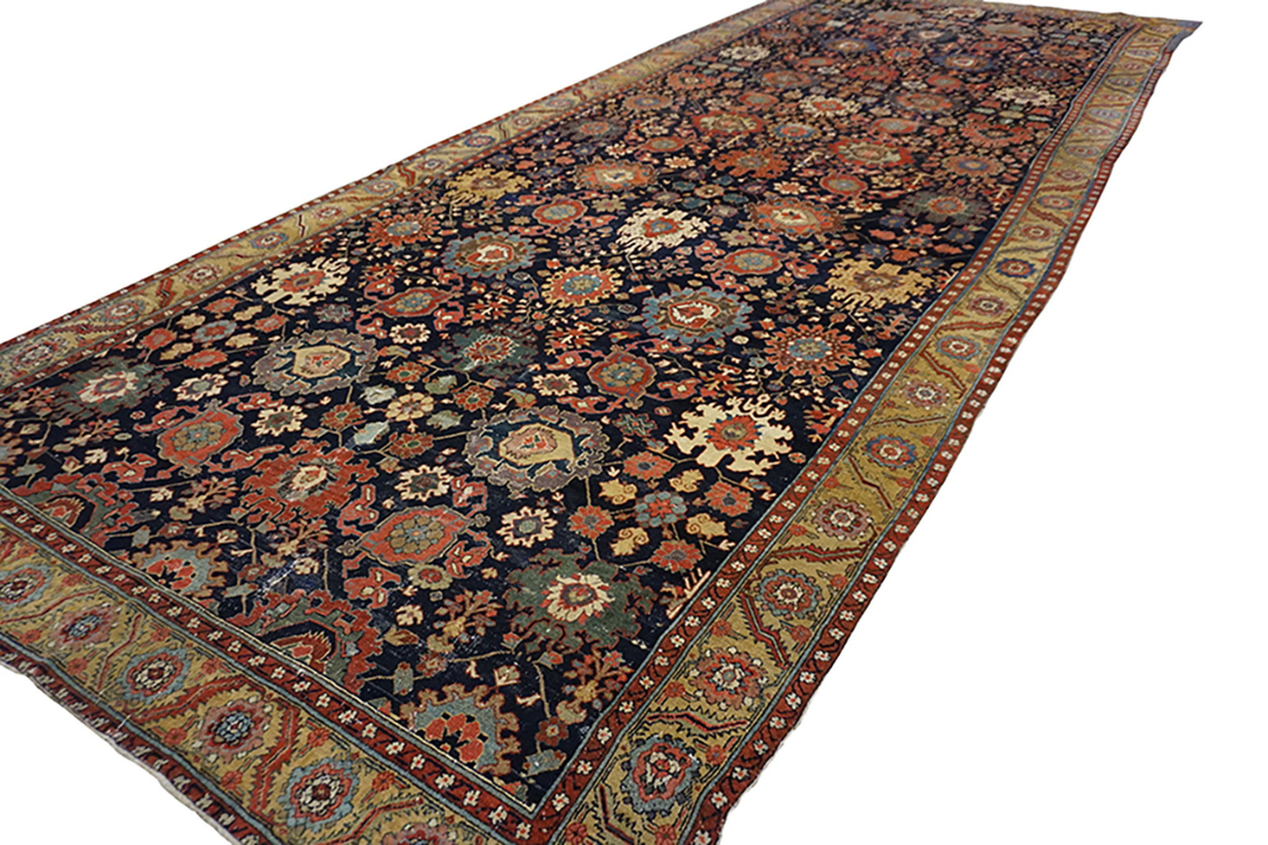 Tones of madder red, ochre, and soft celadon green are skillfully integrated into the design, providing vibrant contrast against the dark ground. The remarkably preserved condition of this piece, given its age, confirms its status as a highly sought-after example among true antique rugs.