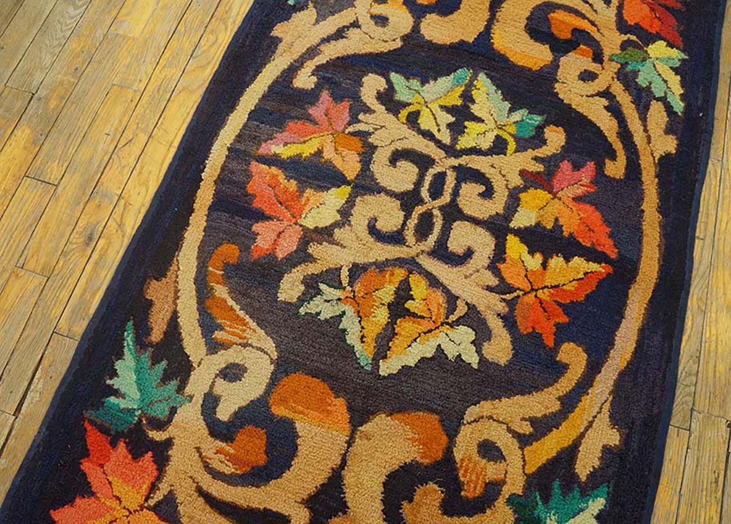 The composition is centered upon a charmingly asymmetric arrangement of autumnal or botanical leaves. In the American folk tradition, these motifs were often “drawn” by hand onto a burlap foundation using items from the home—like a plate for circles or a leaf from the yard—resulting in a design that feels organic, spontaneous, and deeply personal. The small scale of this captivating antique American folk art design area rug suggests it was intended for an intimate space, perhaps as a “hearth rug” to bring color and warmth to a bedroom or entryway.