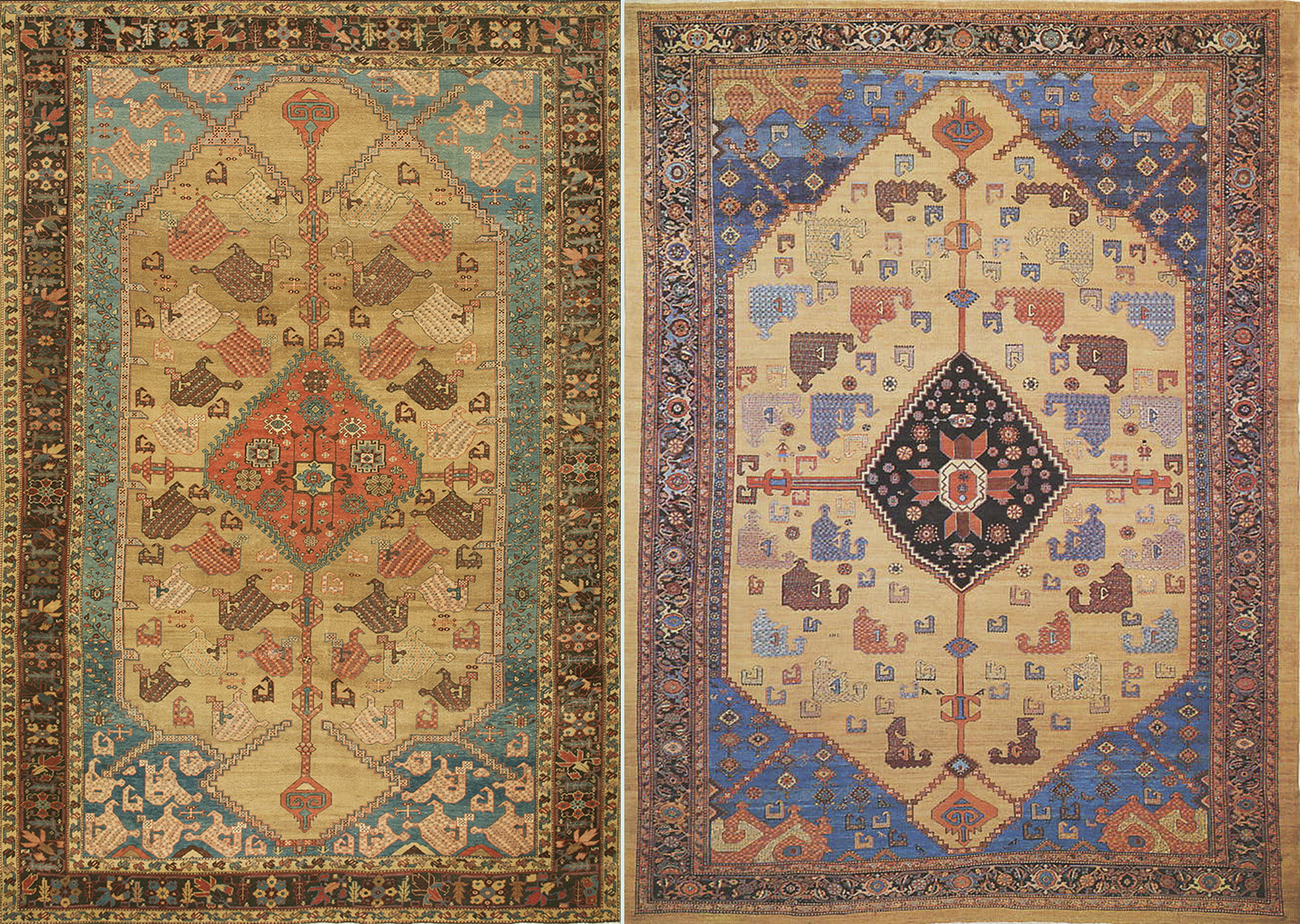 The major border frames the composition with dense, abstract floral and stylized animal motifs set against a rich, dark ground, contrasting sharply with the expansive, open field. The geometric figures populating the main field—often interpreted as stylized animals or primitive boteh—add a layer of narrative complexity, confirming this Bakshaish as a magnificent example of tribal weaving tradition.
