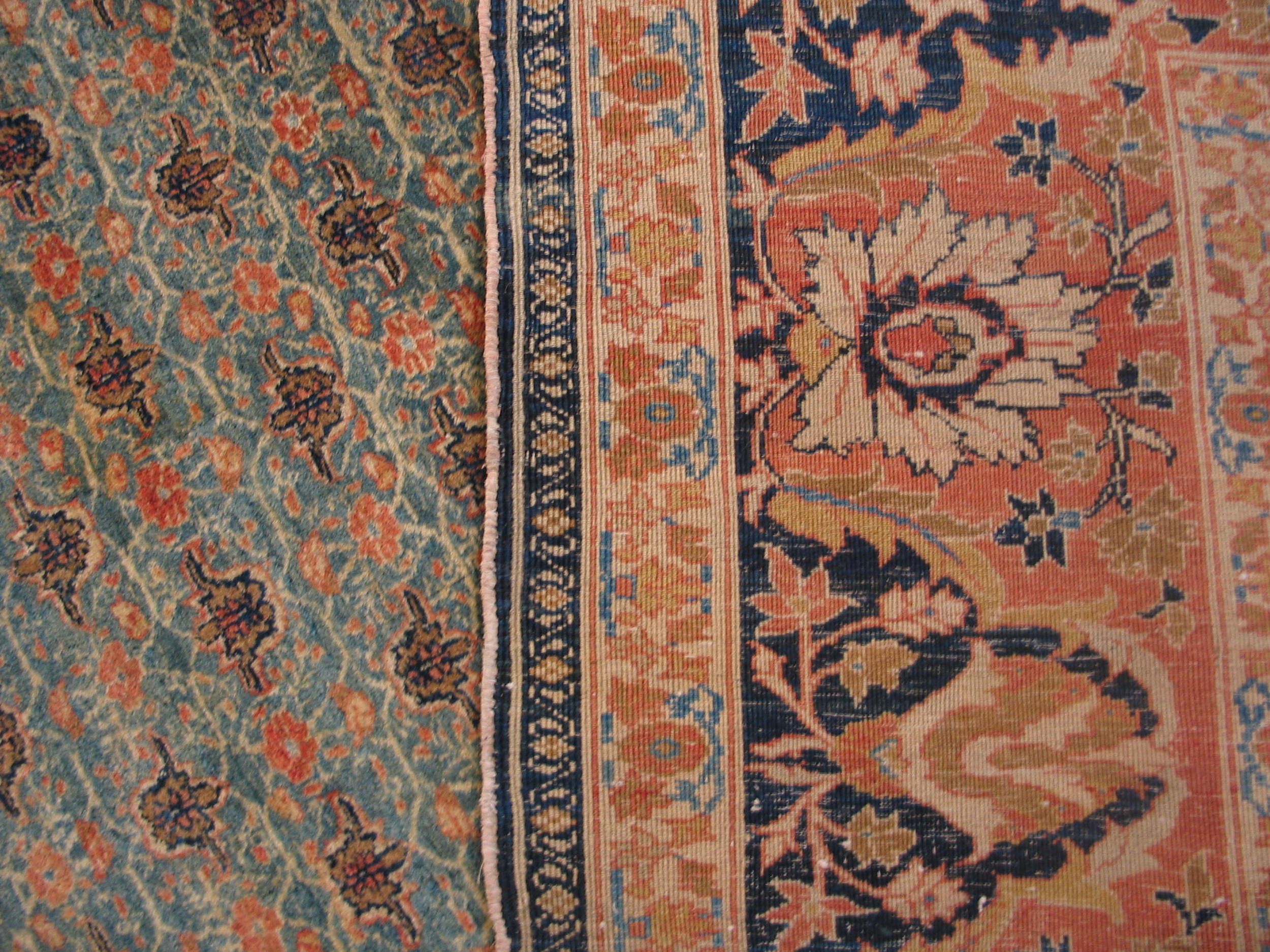 The dominant hue is a soft, faded robin’s egg or slate, defining this as a superb example of blue color rugs, achieved through natural dyes that have mellowed beautifully over time. This cool background provides a striking contrast to the warm ochres, tans, and deep browns found in the repeating blossoms and the ornate, multi-banded border. The aged palette speaks to over a century of history and refinement.