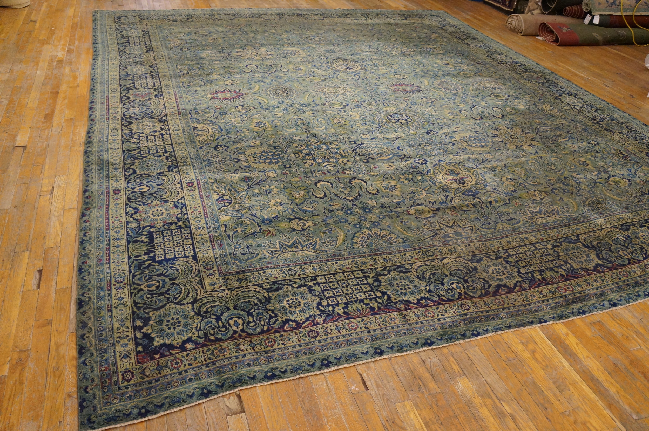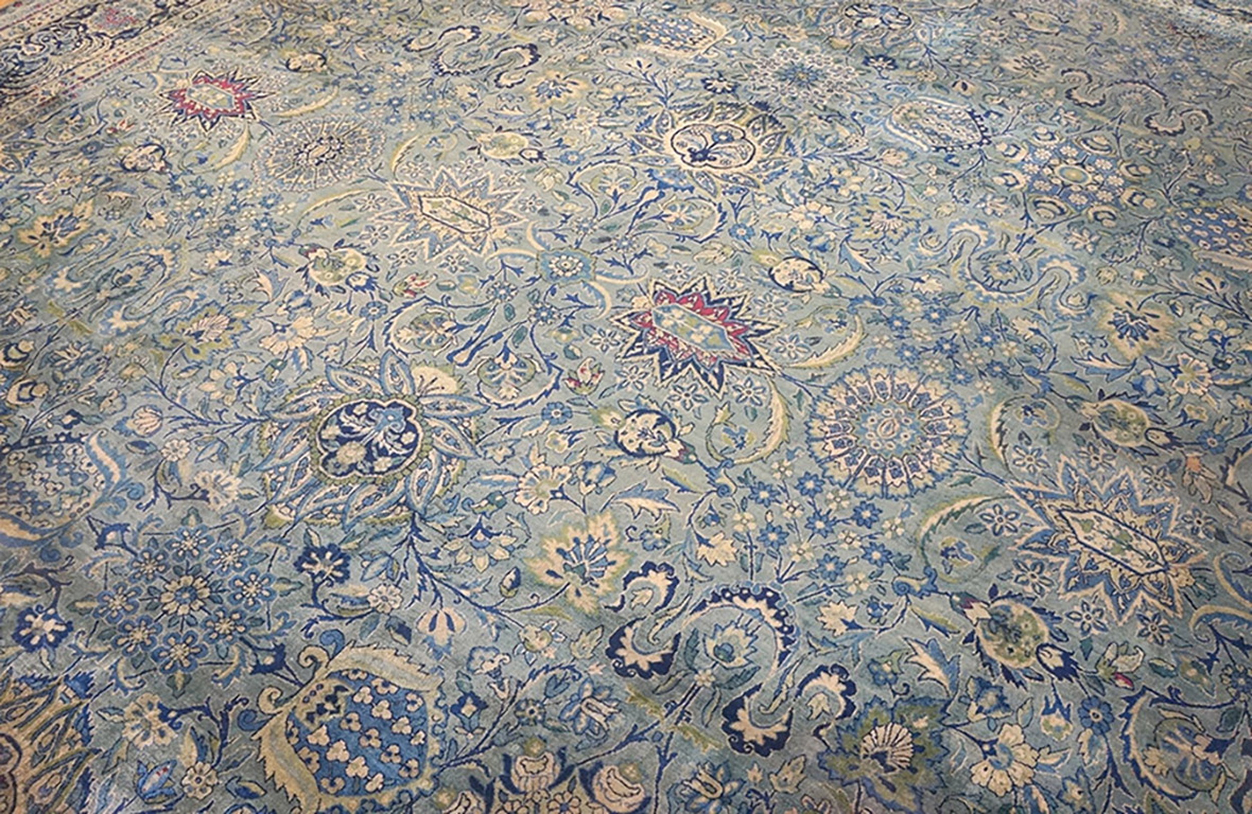 Antique Kerman Persian Blue 1900s Rug, Circa Date: 1900s. This magnificent example of a Persian textile originates from the renowned weaving centers of Kerman. The sophisticated design and fine knotting are characteristic of Kerman rugs produced during the Qajar era, showcasing a delicate balance between tradition and emerging European influences.