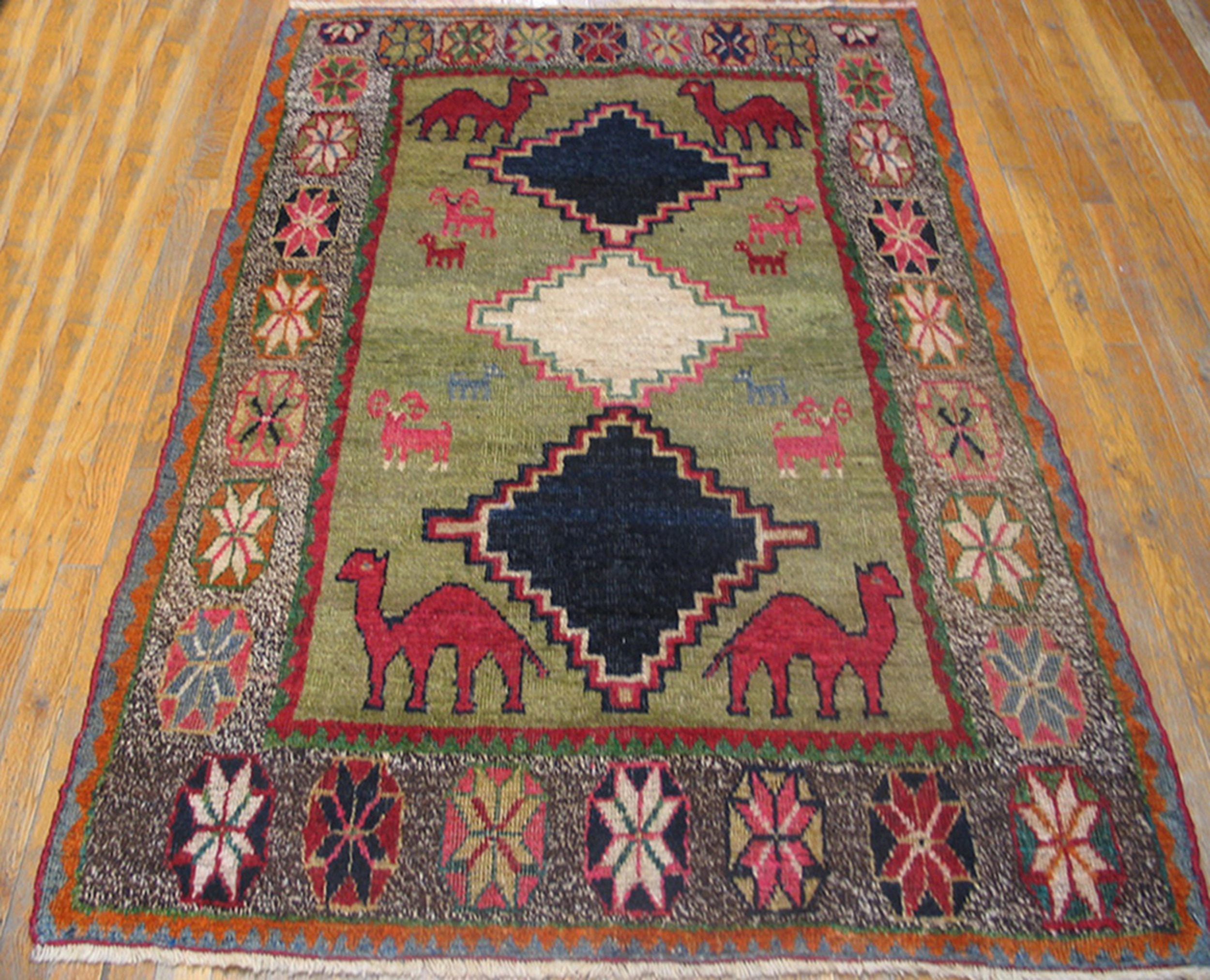 The field is dominated by a rich, earthy olive green, a hue that provides a grounding backdrop for the whimsical motifs. The subtle variations in the wool’s natural dyes create a depth of color characteristic of the finest green color rugs from this period, ensuring the piece retains its visual interest under various lighting conditions.