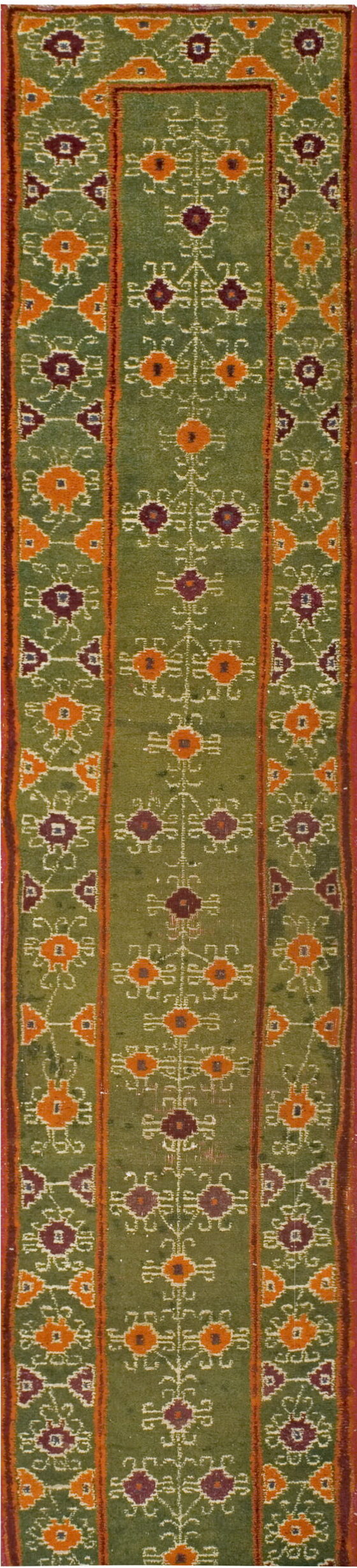 Antique Agra Hallway Runner Wool Green Rug, Circa Date: 1930s. This exceptional Agra runner captures the transitional aesthetic prevalent in Indian weaving during the 1930s. The field is dominated by a rich, earthy green color, providing a sophisticated and grounding backdrop for the repeating, highly stylized motifs.