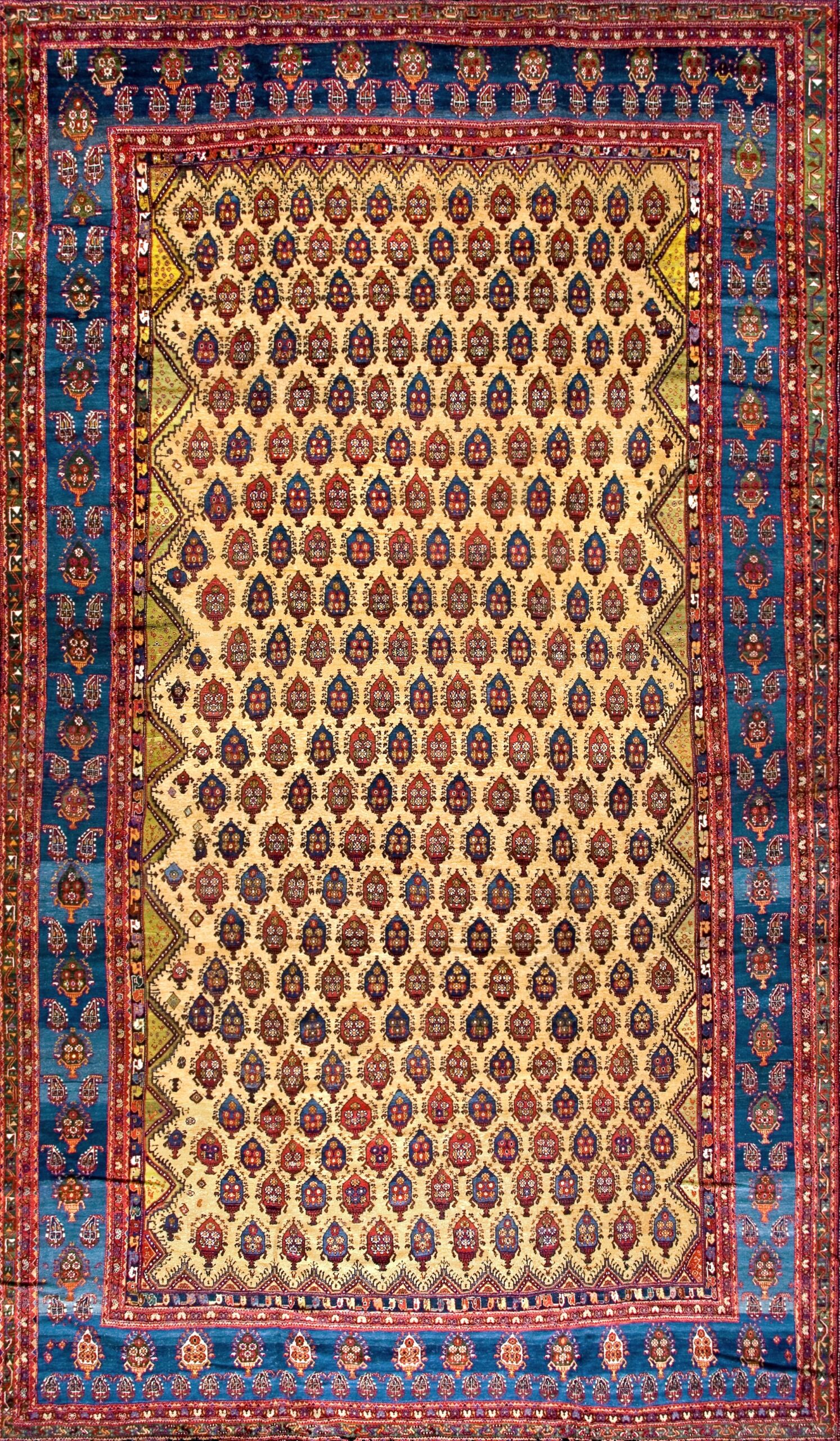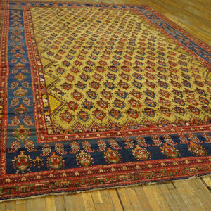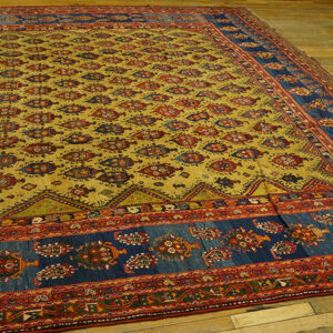 Timeless Elegance: Rare Happy Yellow & Sky Blue Antique Late 19th Century Oversized Persian Bakhtiari Rug – Discover a masterpiece of traditional Persian weaving: an antique oversized Bakhtiari rug that brings together vibrant hues, tribal heritage, and enduring craftsmanship. Hand-knotted in Persia circa 1880, this extraordinary carpet is both a captivating artistic statement and a functional work of design that anchors any grand interior.