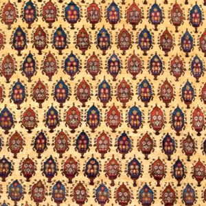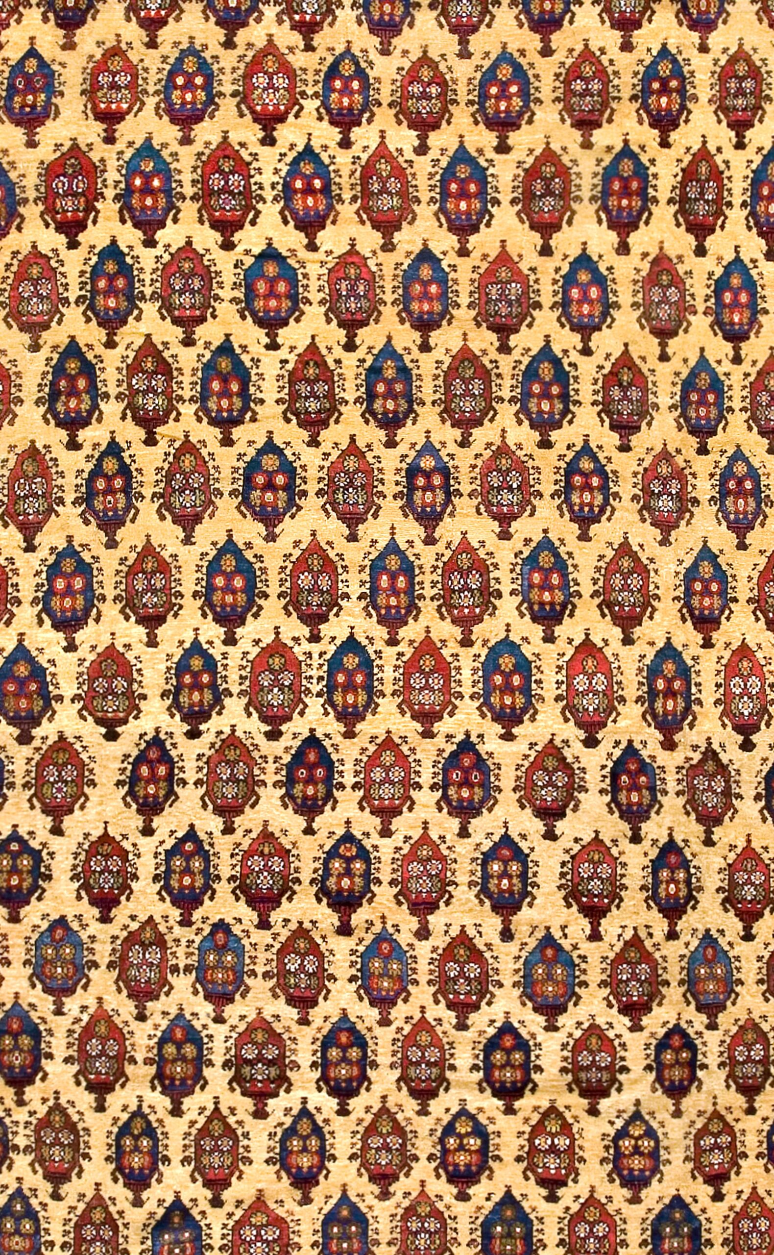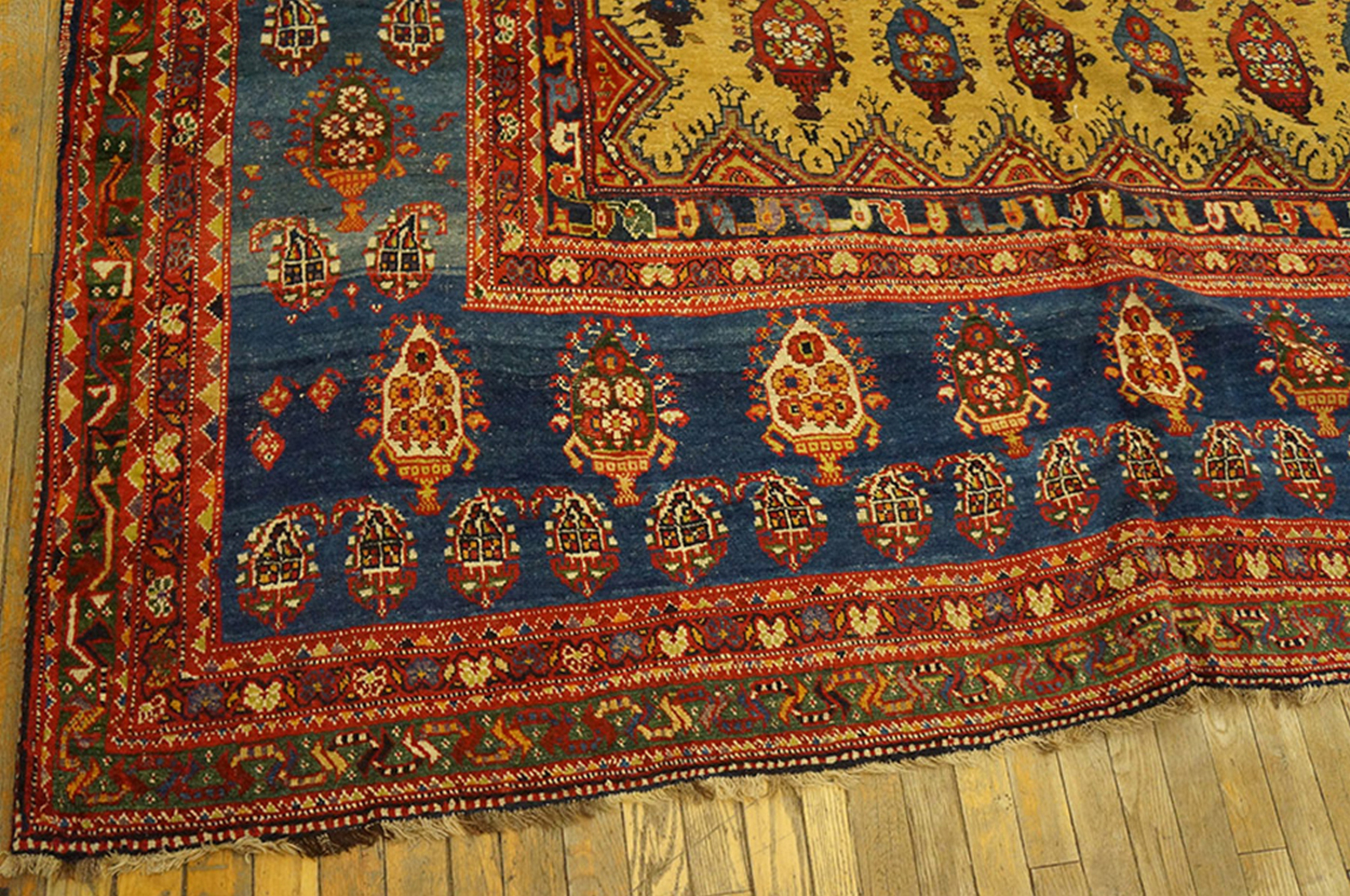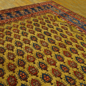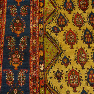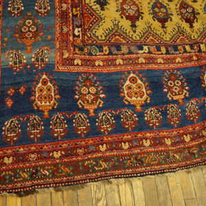 The cheerful happy yellow field, complemented by serene sky blue accents, creates an uplifting palette rarely seen in antique Persian rugs of such age and scale. These distinctive colors not only highlight the rug’s unique personality, but also reflect the rich tradition of natural dyeing and masterful aesthetic choices found in genuine Bakhtiari pieces.