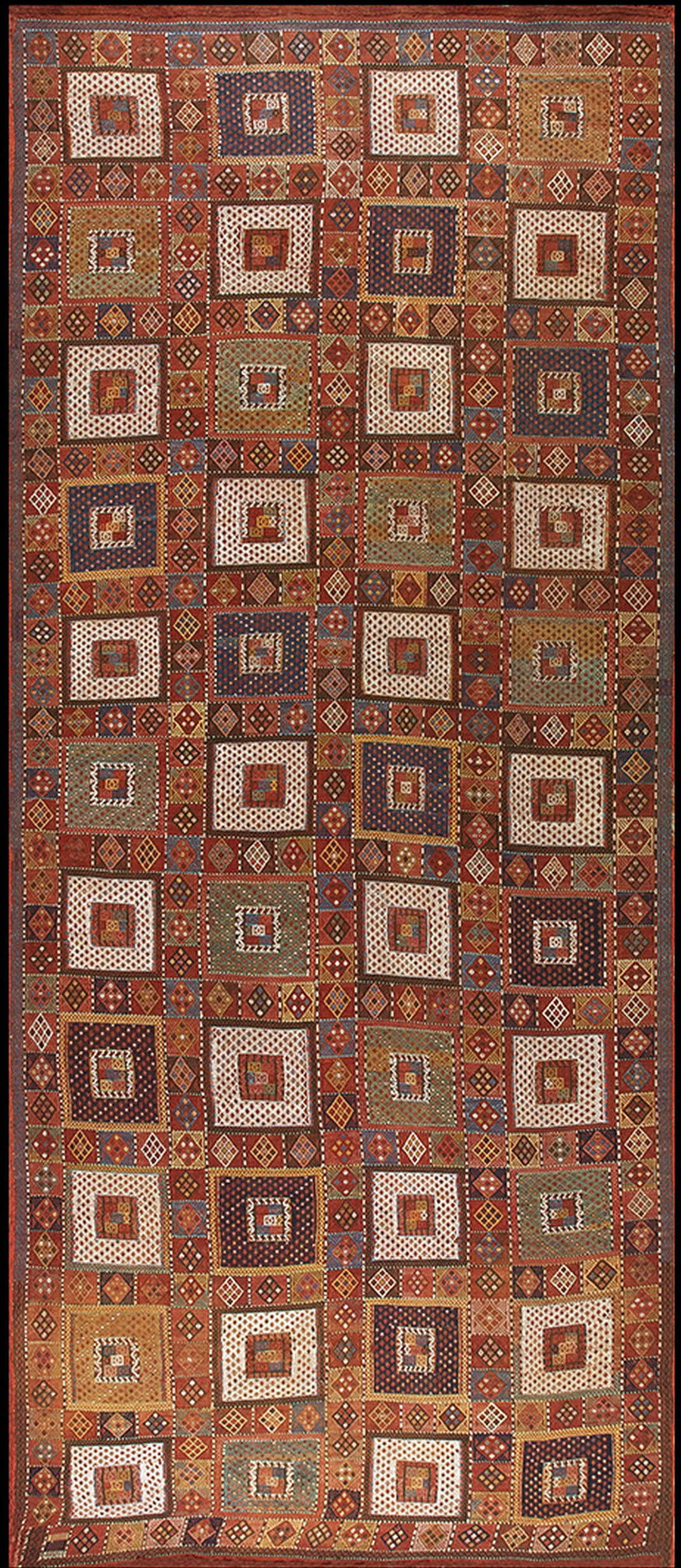 The composition features a striking geometric grid, characterized by nested squares and diamonds that repeat across the entire field. This highly organized allover design is typical of Verneh production, where complex symbolic motifs are rendered in a precise, almost architectural manner, demonstrating a mastery of traditional Caucasian iconography.