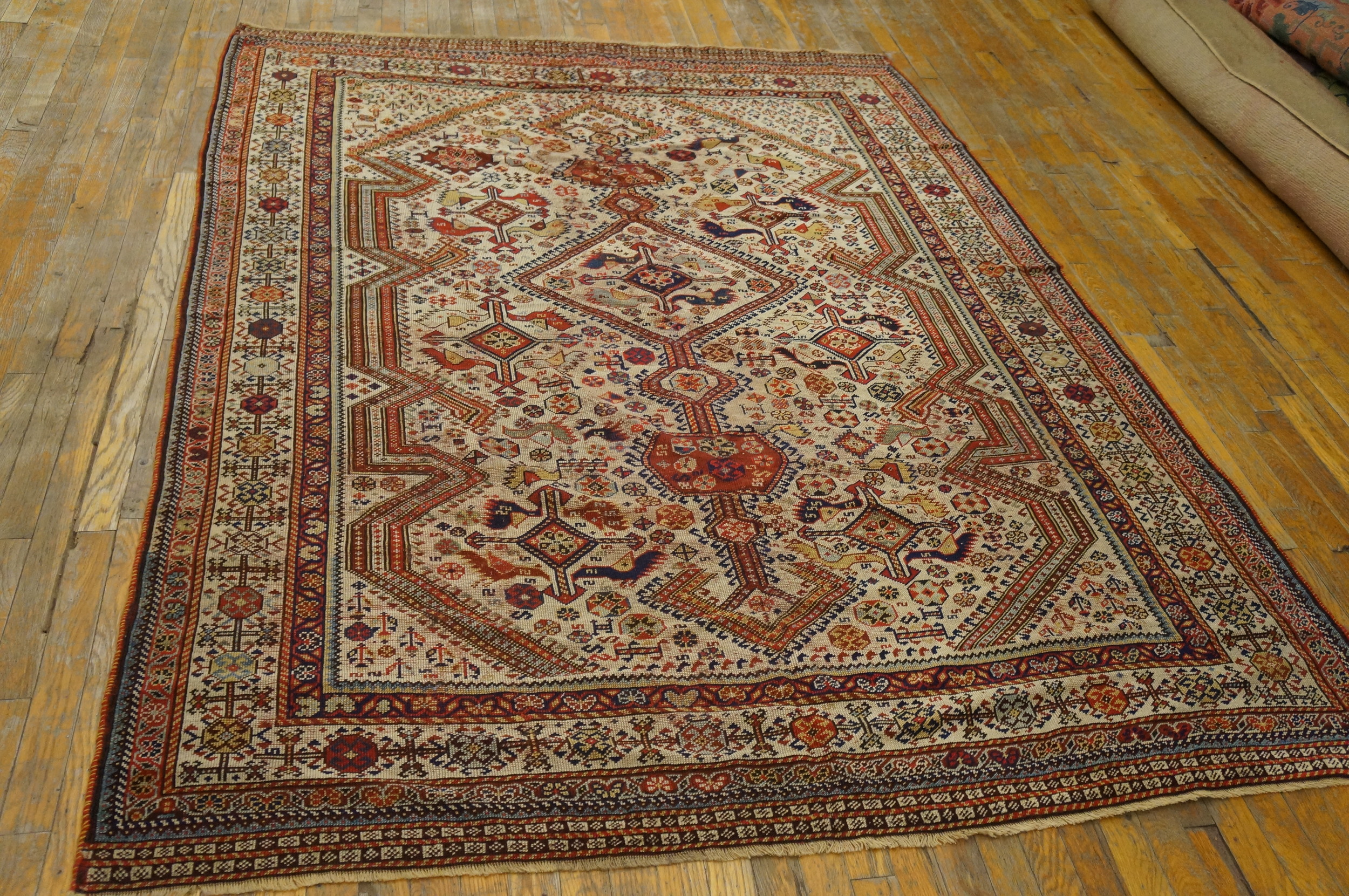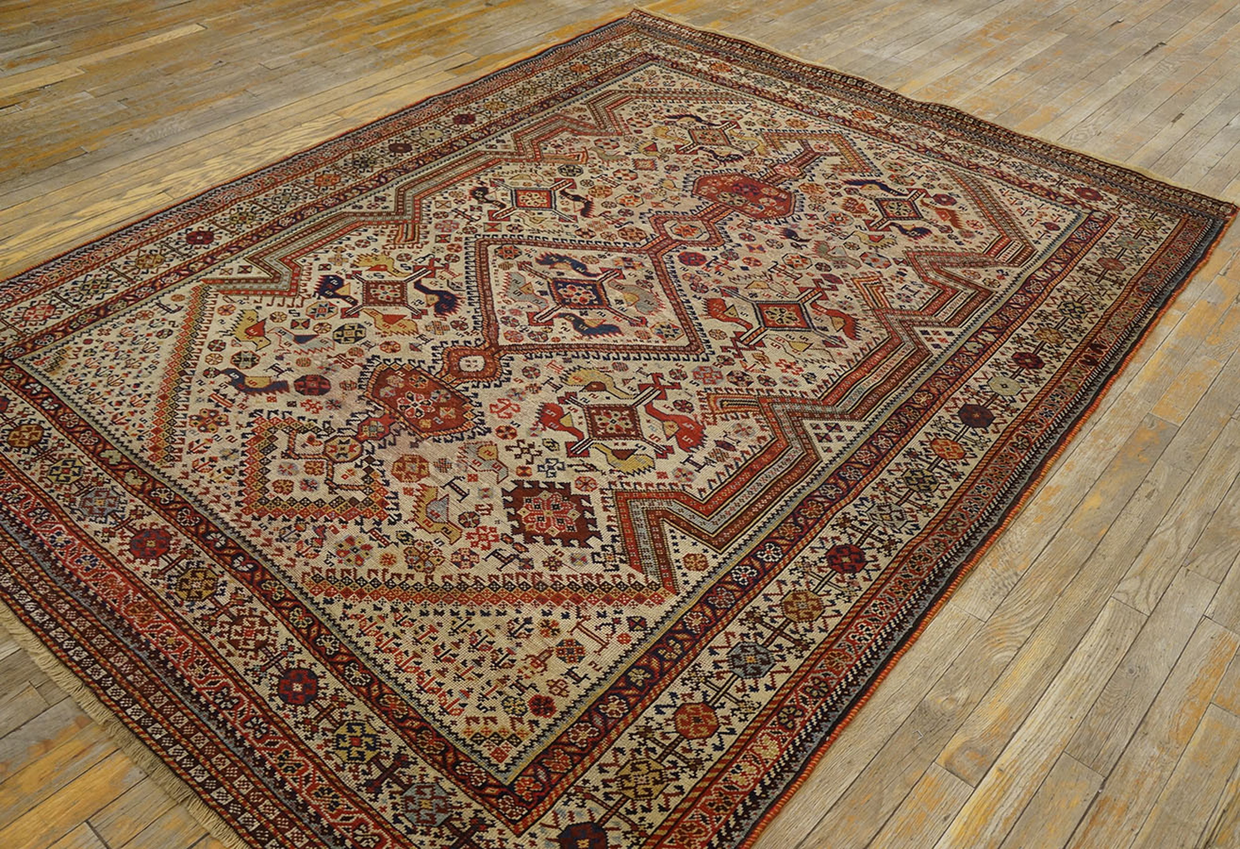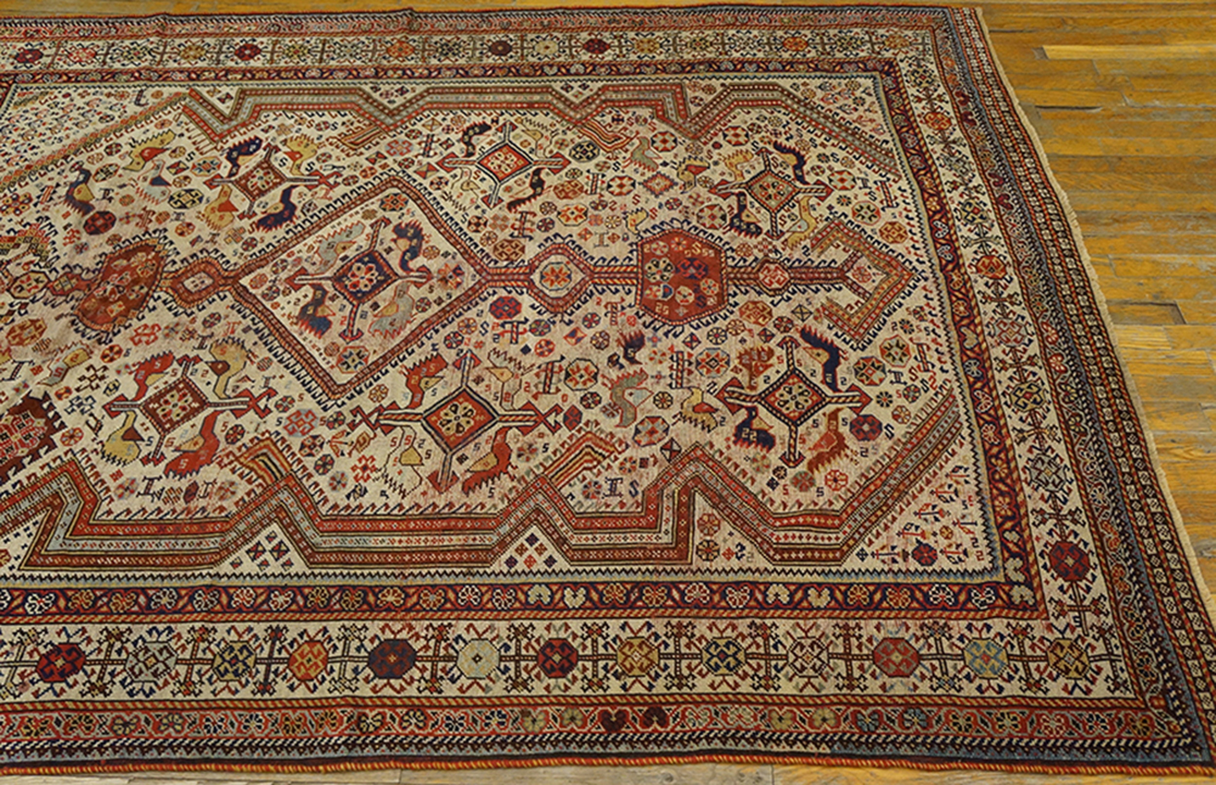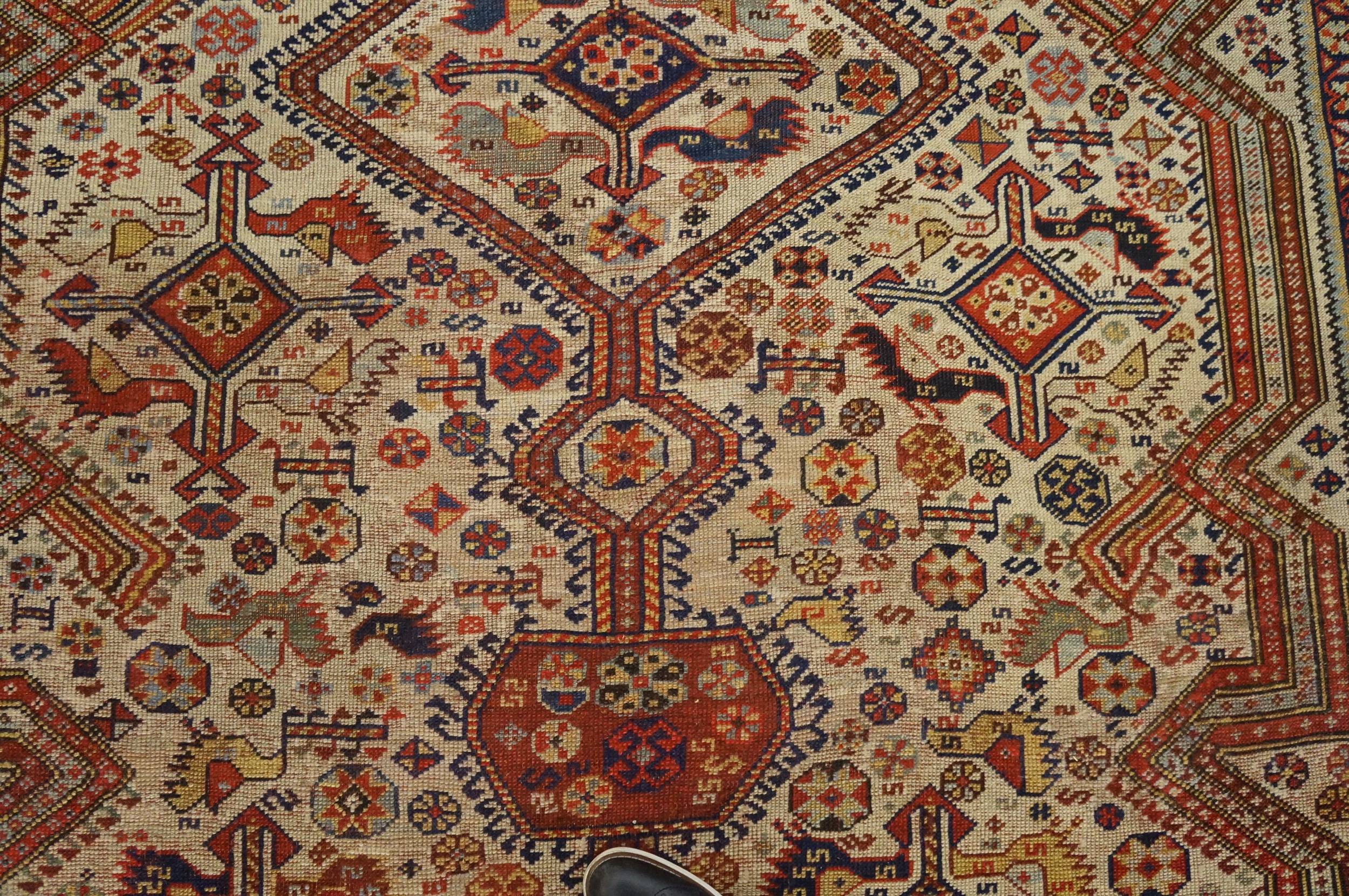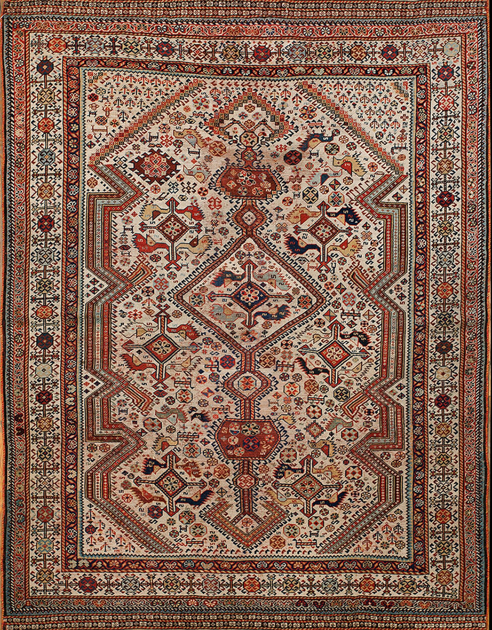 Antique khamse Persian Ivory 1880s Rug, Circa Date: 1880s. This exceptional Khamse Confederacy piece, woven in the Fars region of Persia, showcases the robust and imaginative weaving traditions of the Qashqai and related tribes. The highly saturated palette of terracotta, indigo, and ochre is beautifully balanced by the luminous ivory field that dominates the central space, allowing the complex tribal motifs to truly resonate.