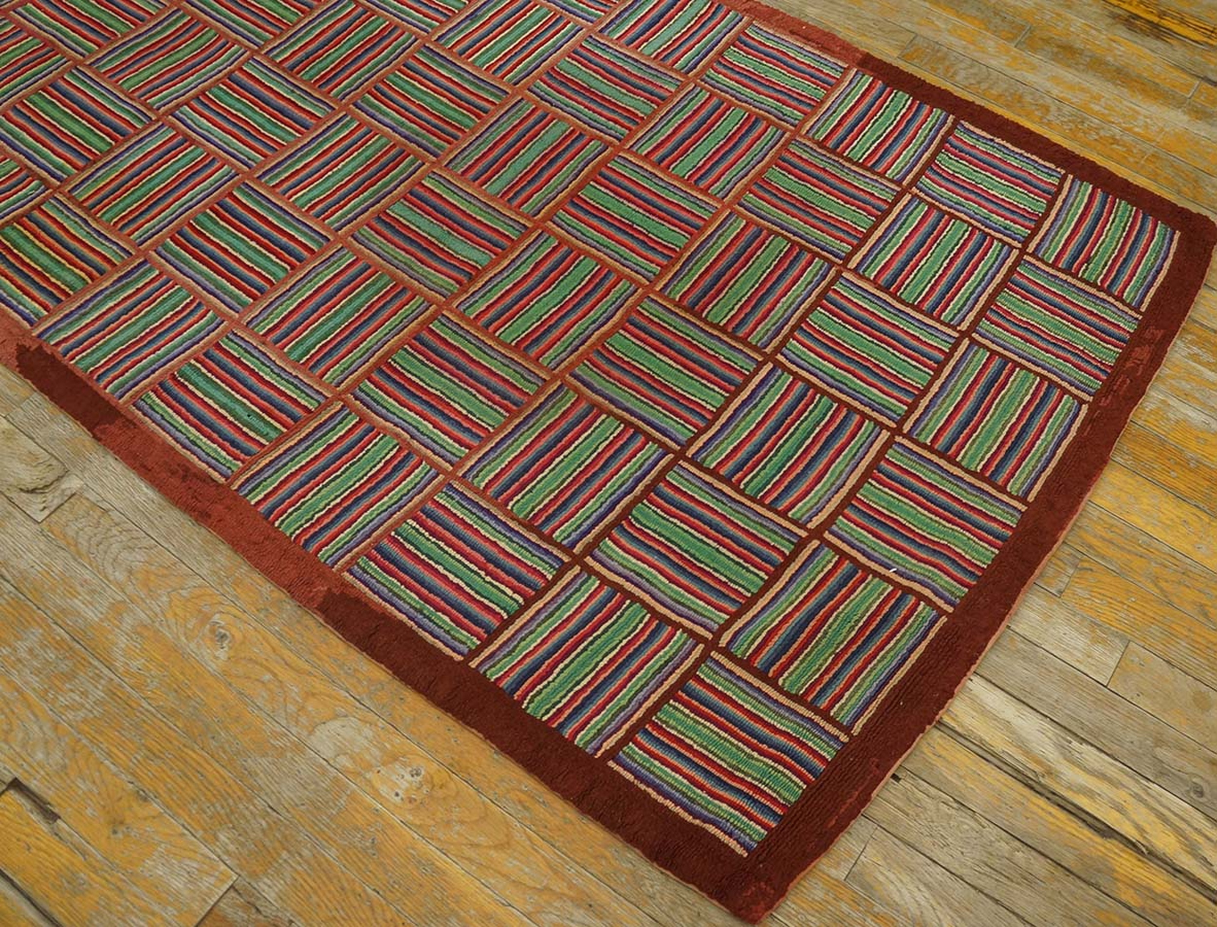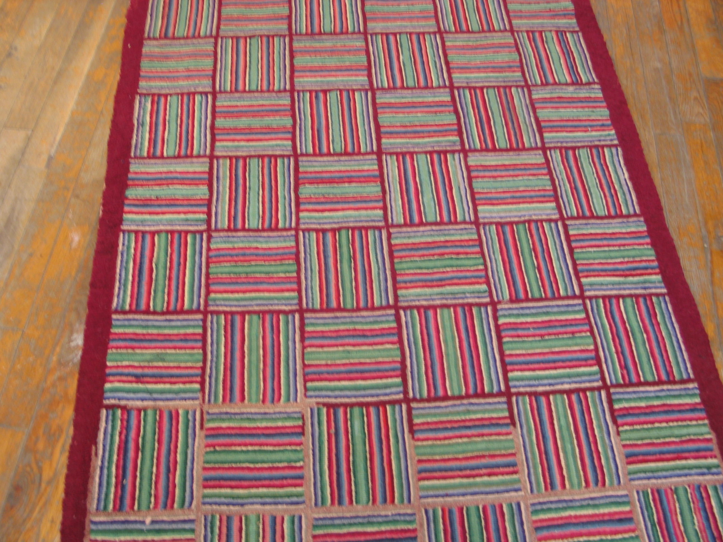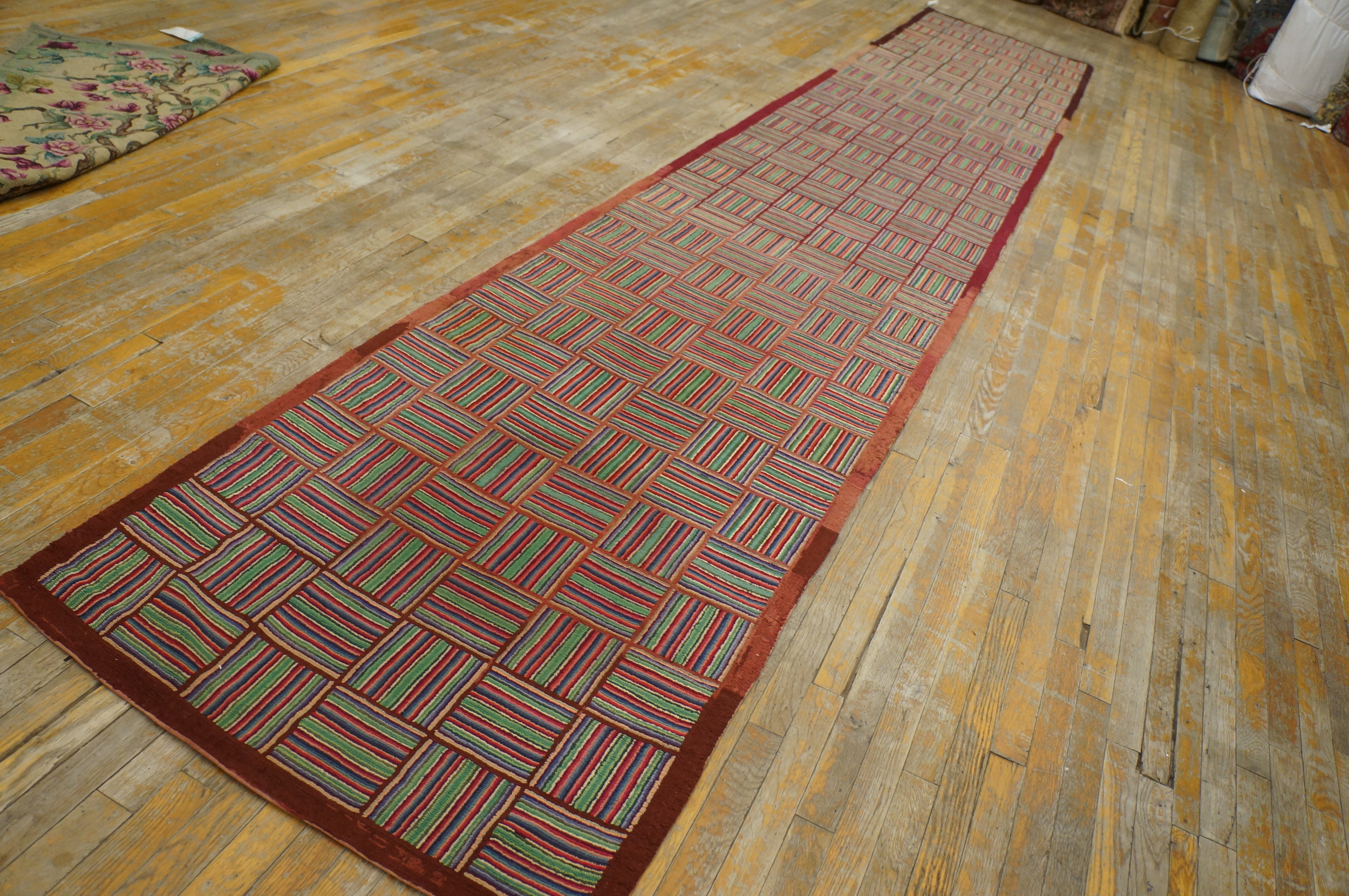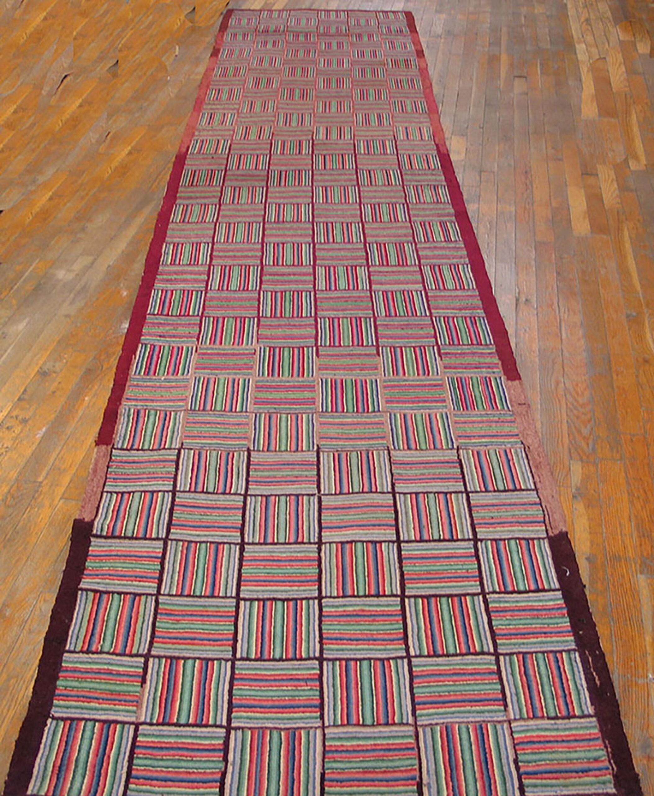Antique American Hooked Rug Hallway Runner Wool Multicolor, Circa Date: 1930s. This exceptional American hooked rug presents a striking, modernist geometric design, characteristic of the early 20th century folk art movement. The durable wool construction and meticulous hand-hooking technique ensure that this piece remains a significant example among fine antique rugs.