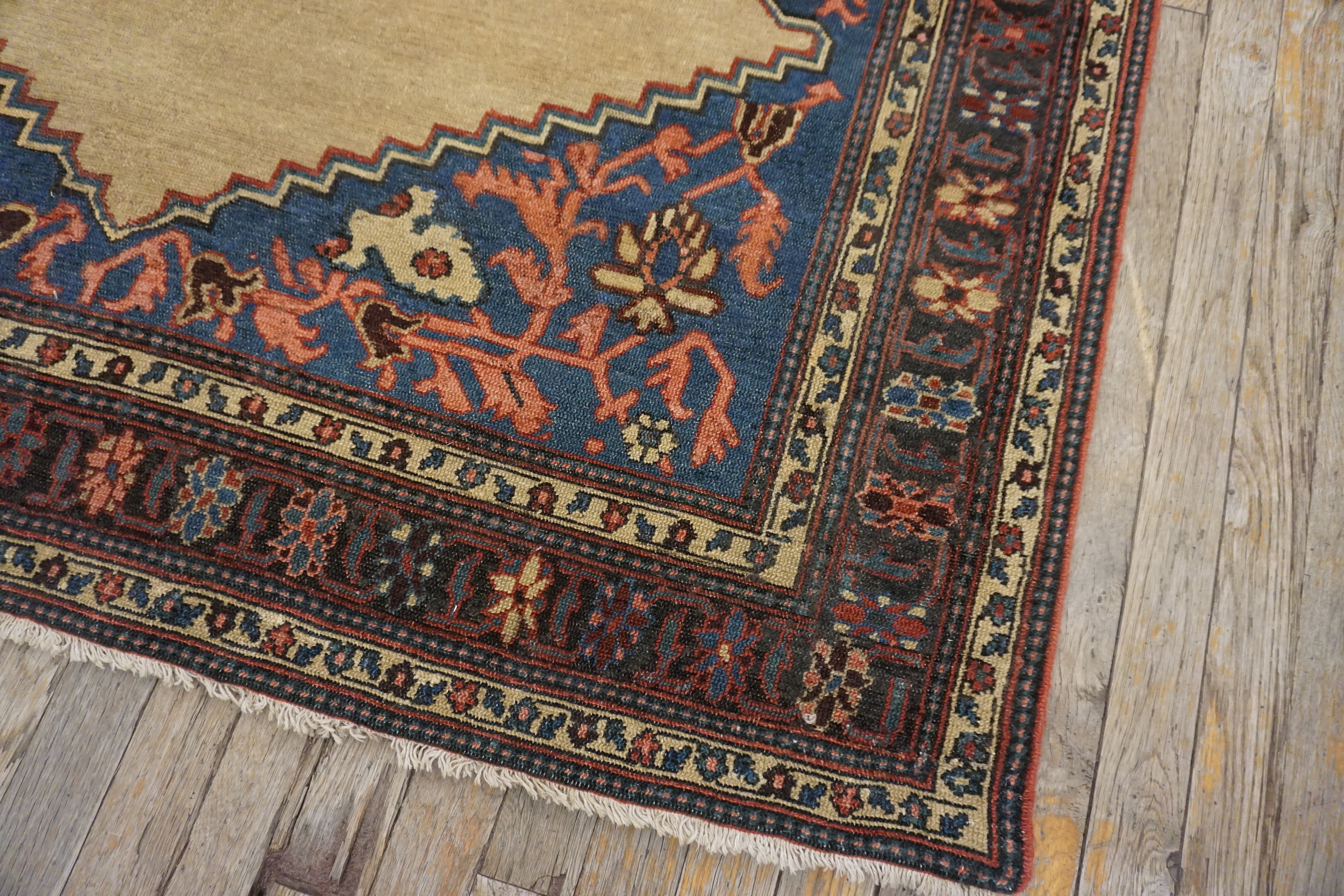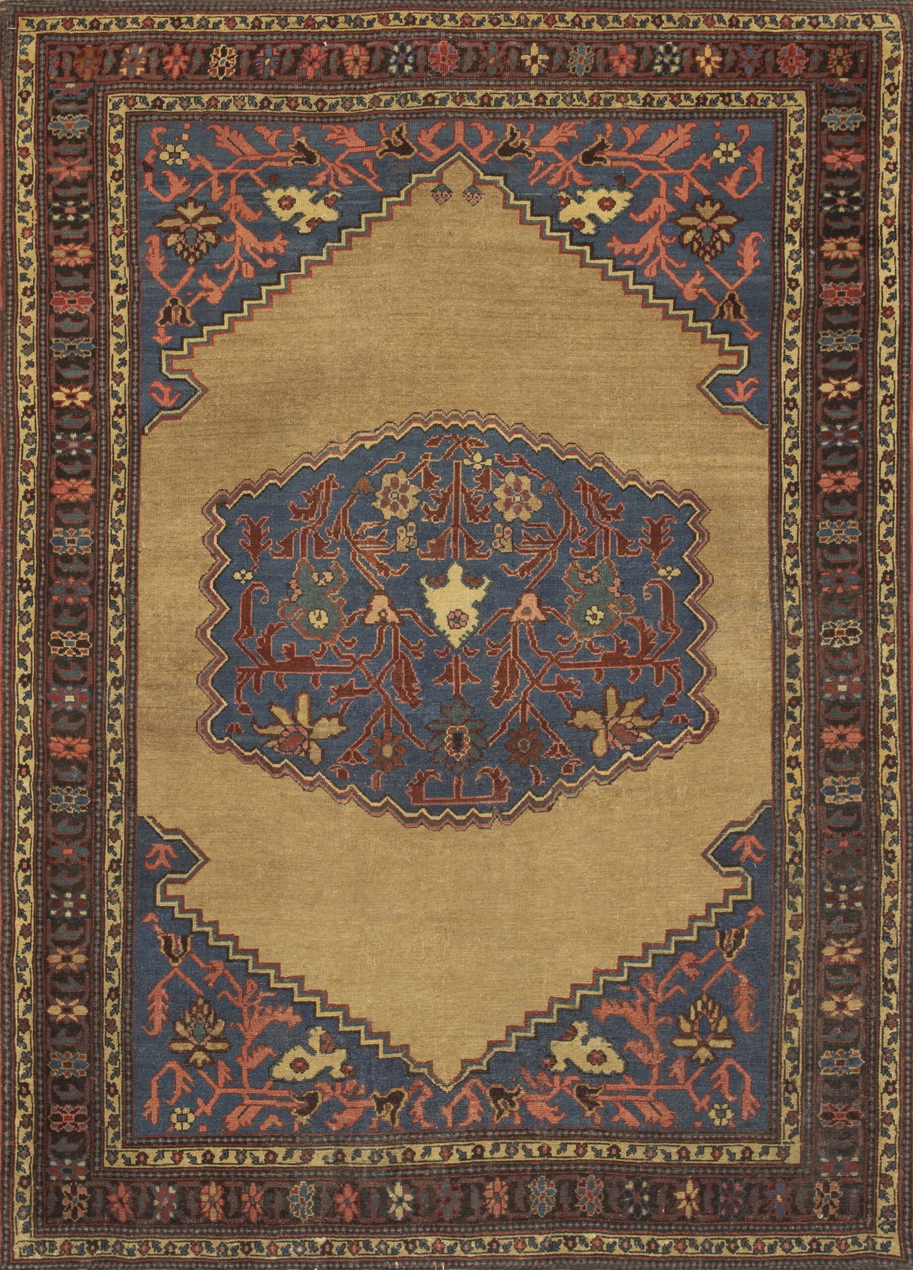 Characteristic of Bakshaish production, the design employs bold, slightly abstracted motifs, moving away from the strict formality of court carpets. The central element features an oversized, highly stylized medallion incorporating large-scale palmettes and stylized vines, typical of floral rugs from this area.