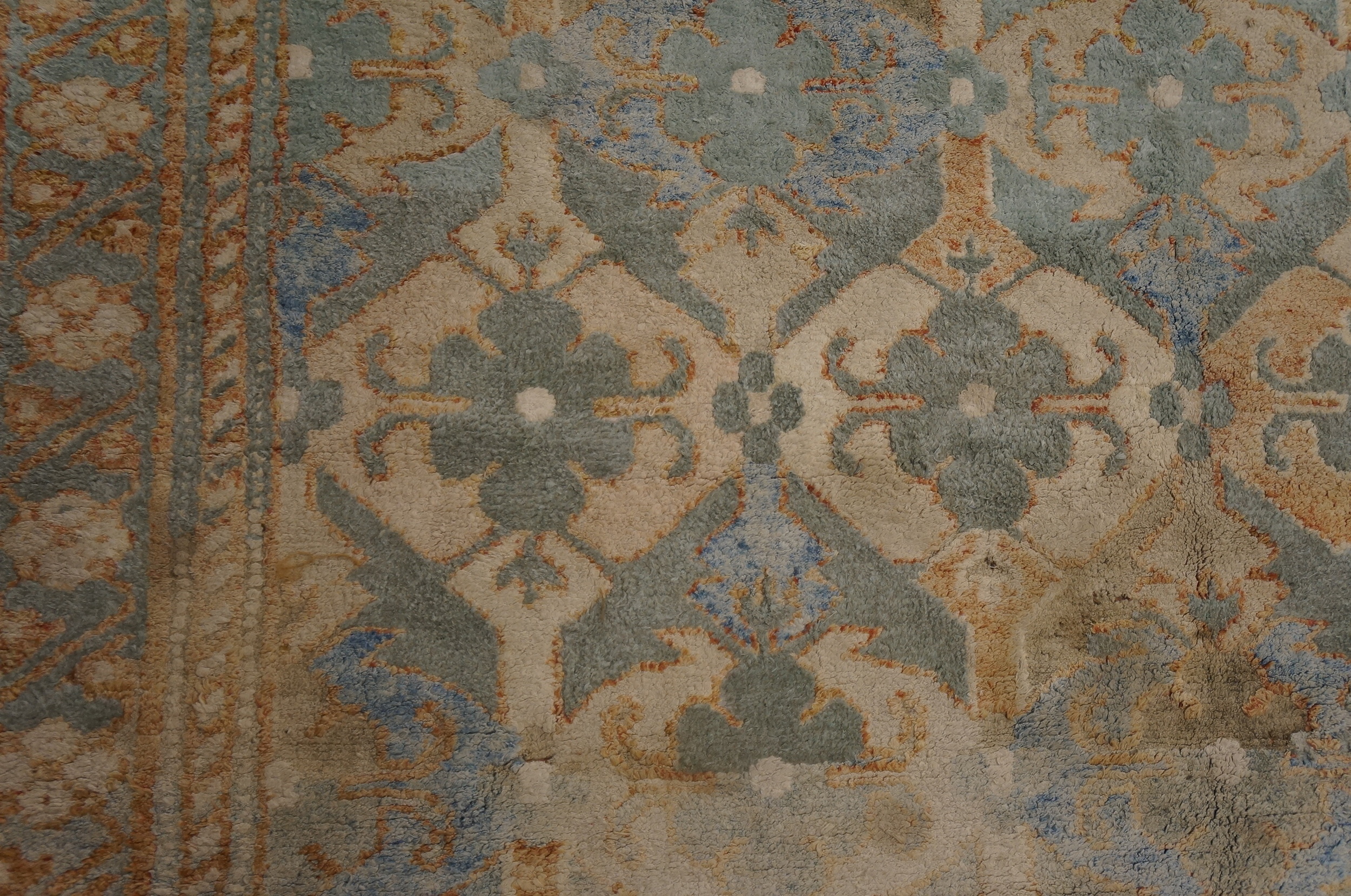 The field features geometric motifs arranged with rhythmic balance and clarity, creating a visual framework that feels both orderly and dynamic. The interplay of form and space showcases the geometric vocabulary of Agra weaving from the 19th century, where precision and decorative intent meet in a harmonious composition.