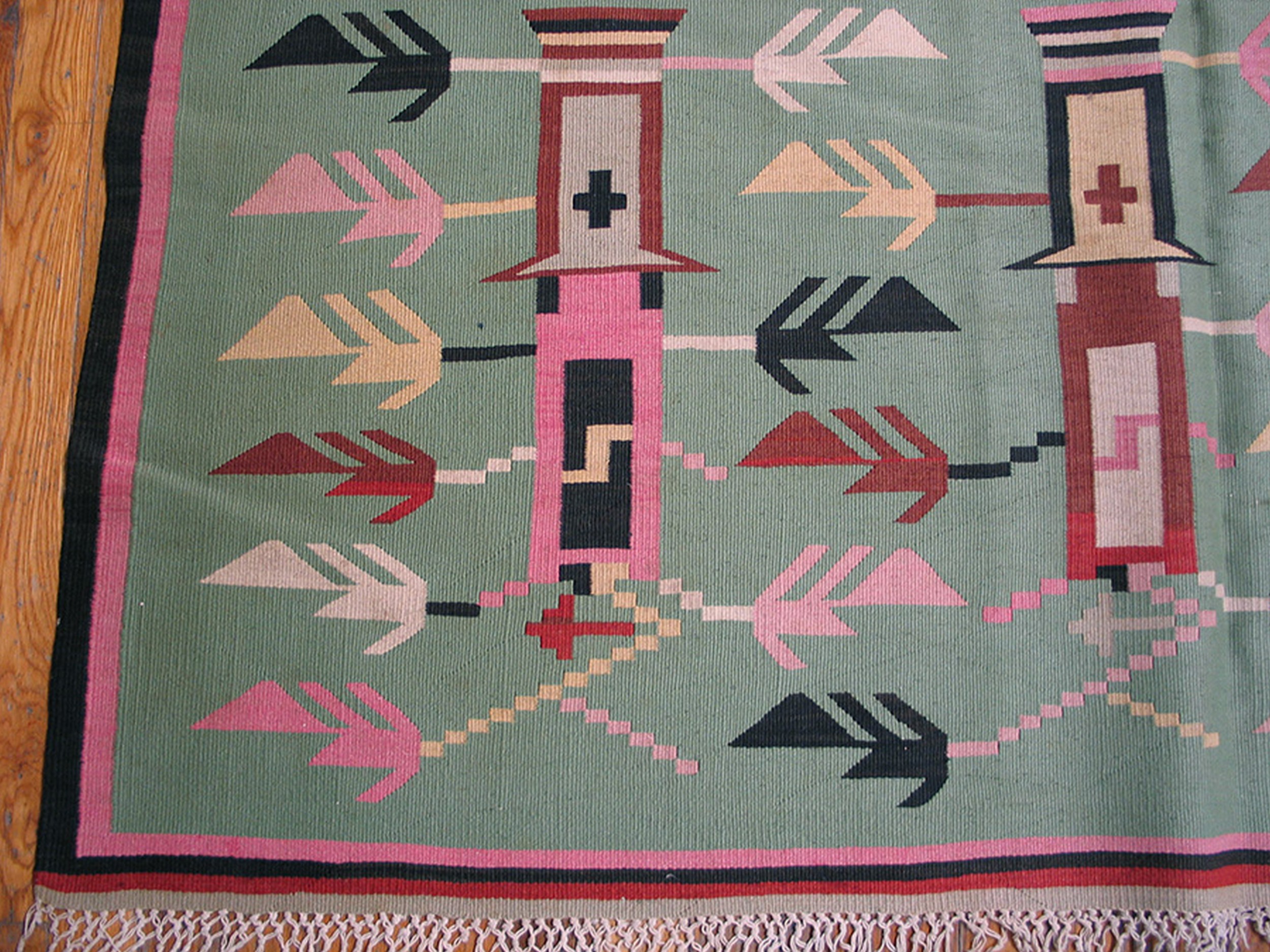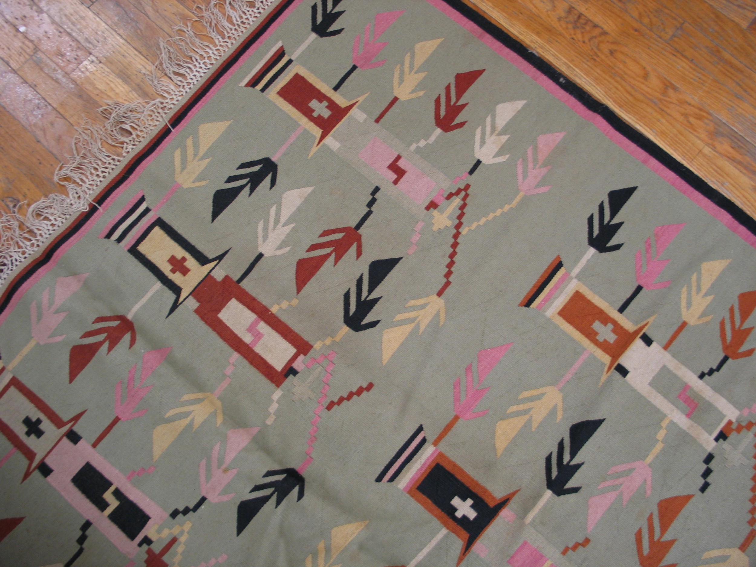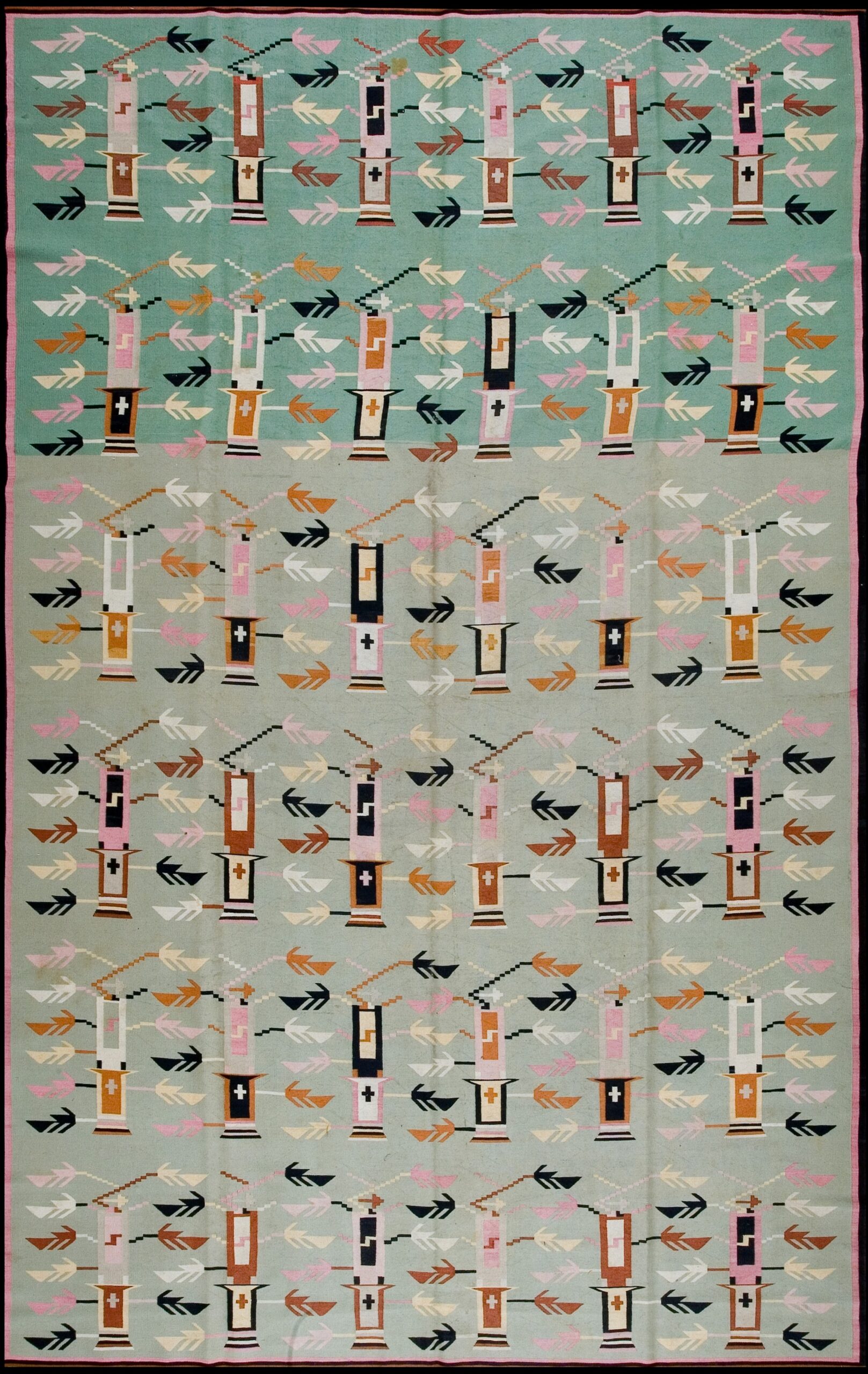 The composition is a virtuoso display of the Geometric Flatweave rugs. Eschewing the romantic bouquets of the “Rococo” Bessarabian style, this rug features a rhythmic, interlocking grid of diamonds or stylized “Sun” medallions. The design feels remarkably architectural and avant-garde, anticipating the minimalist movements of the early 20th century. The room-size scale provides a cinematic stage for this pattern, allowing the eye to travel across a balanced landscape of repeating tribal totems that resonate with a sense of ancient mathematical order.