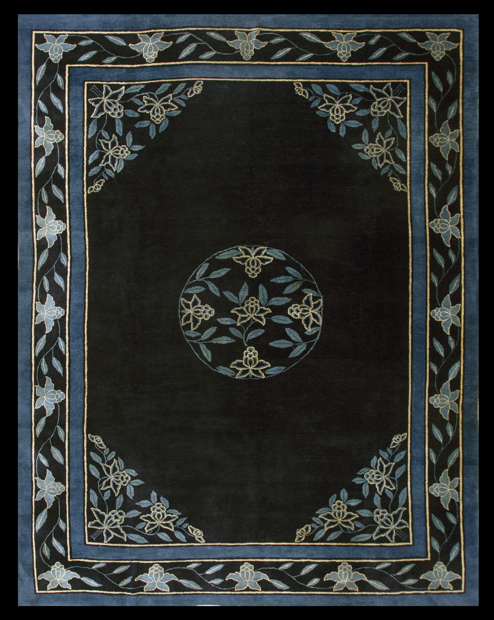 Characteristic of the Peking style from this period, the design relies on open space and carefully placed ornamentation rather than dense all-over patterning. The central medallion and the corner spandrels feature highly articulated, stylized floral elements, rendered with precise line work that emphasizes their graphic quality.