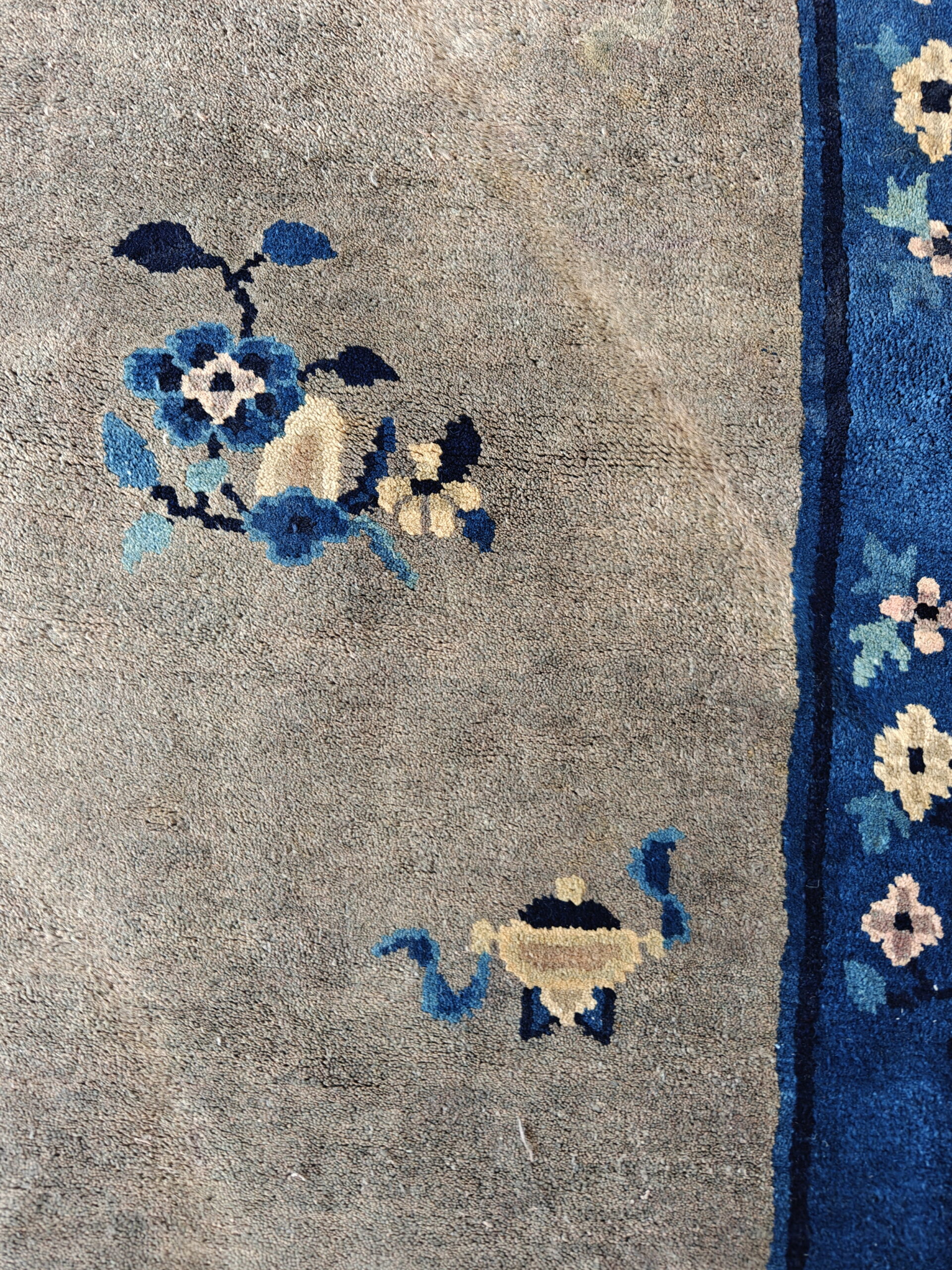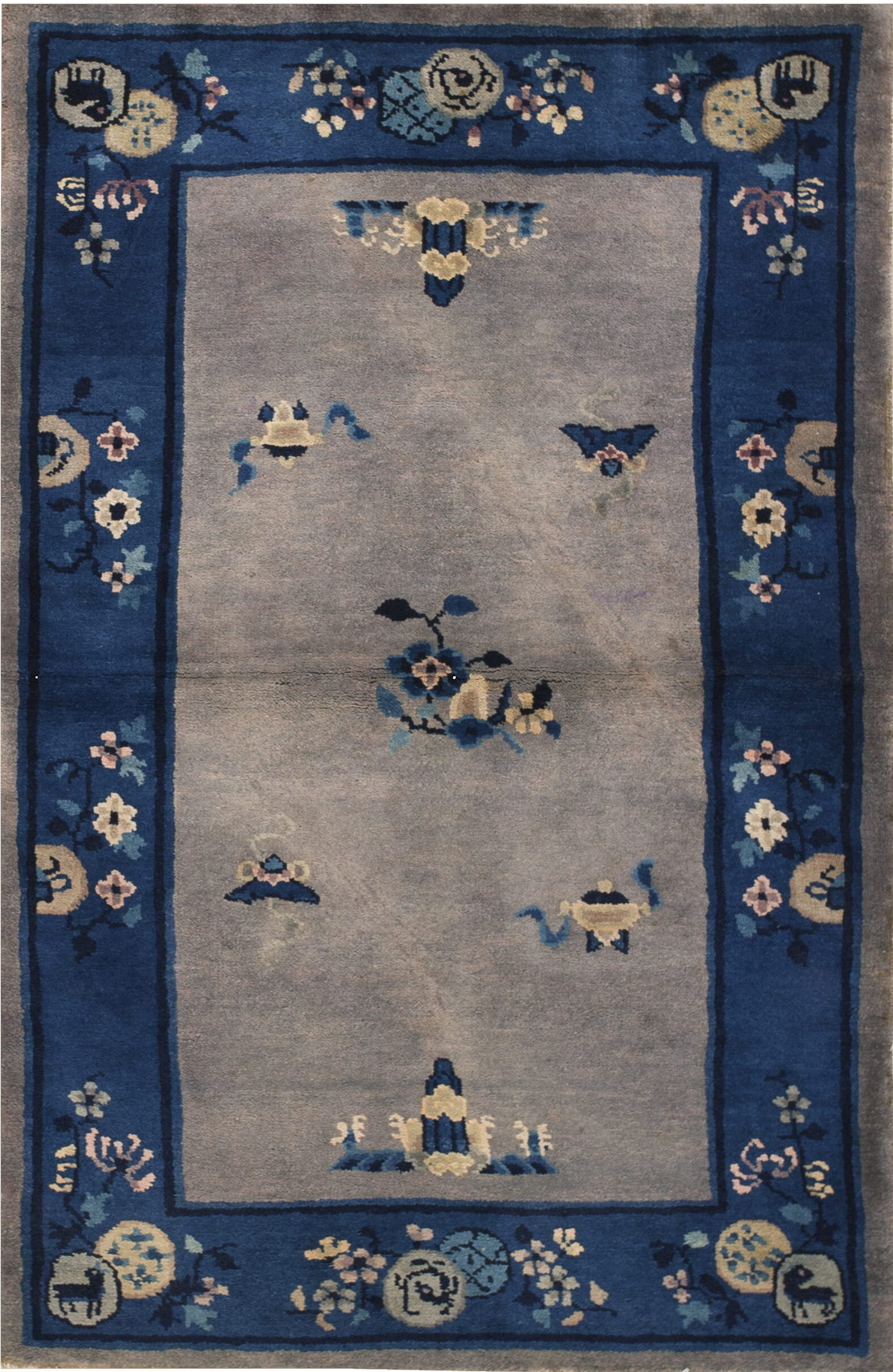 The central field presents a beautifully aged, muted grey-lavender hue, which serves as a sophisticated backdrop for the scattered motifs. While the title specifies ivory, the field has mellowed over time to a soft, smoky neutral, perfectly complemented by the contrasting deep cobalt border. This subtle shift in tonality is characteristic of many fine ivory color rugs from this period.