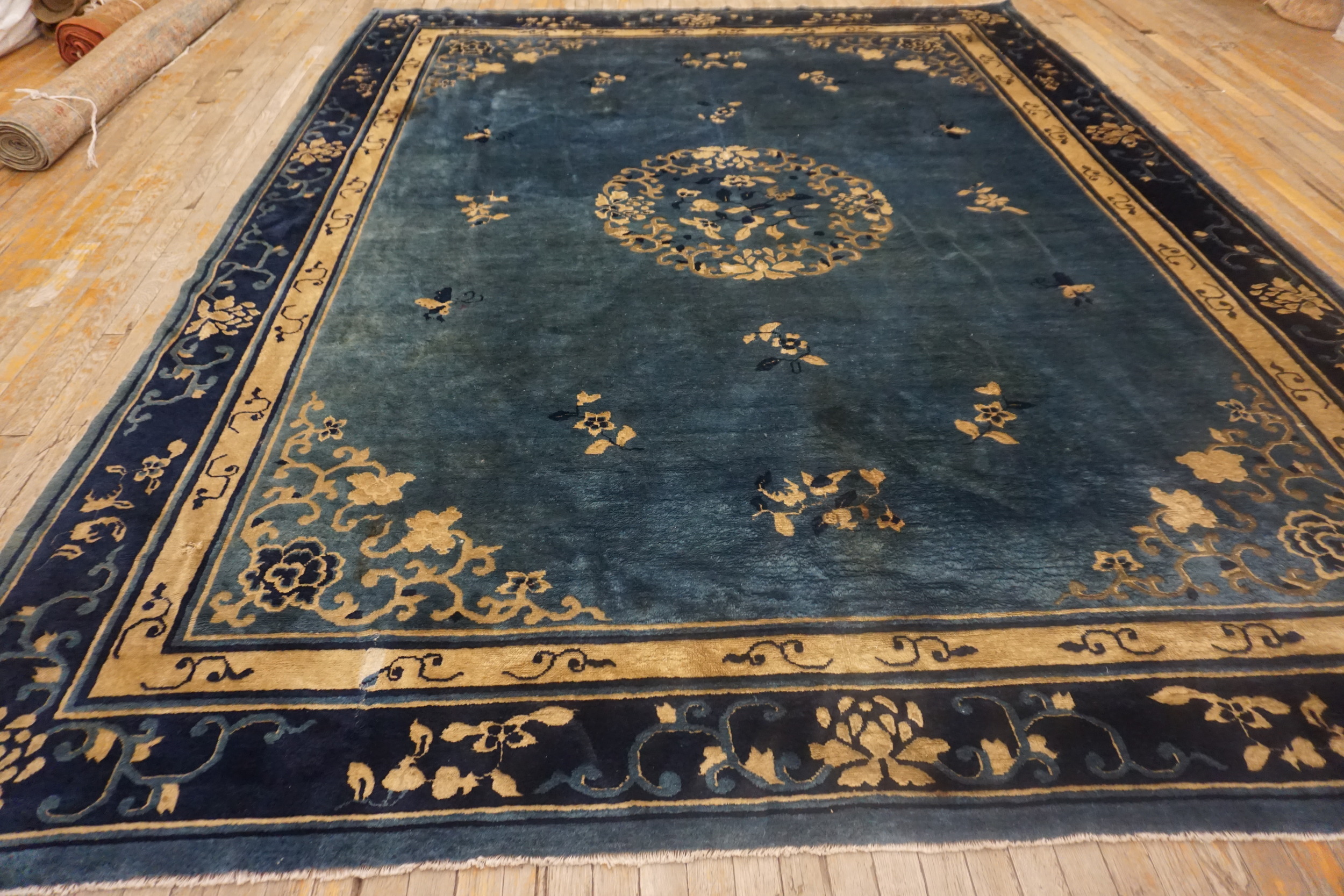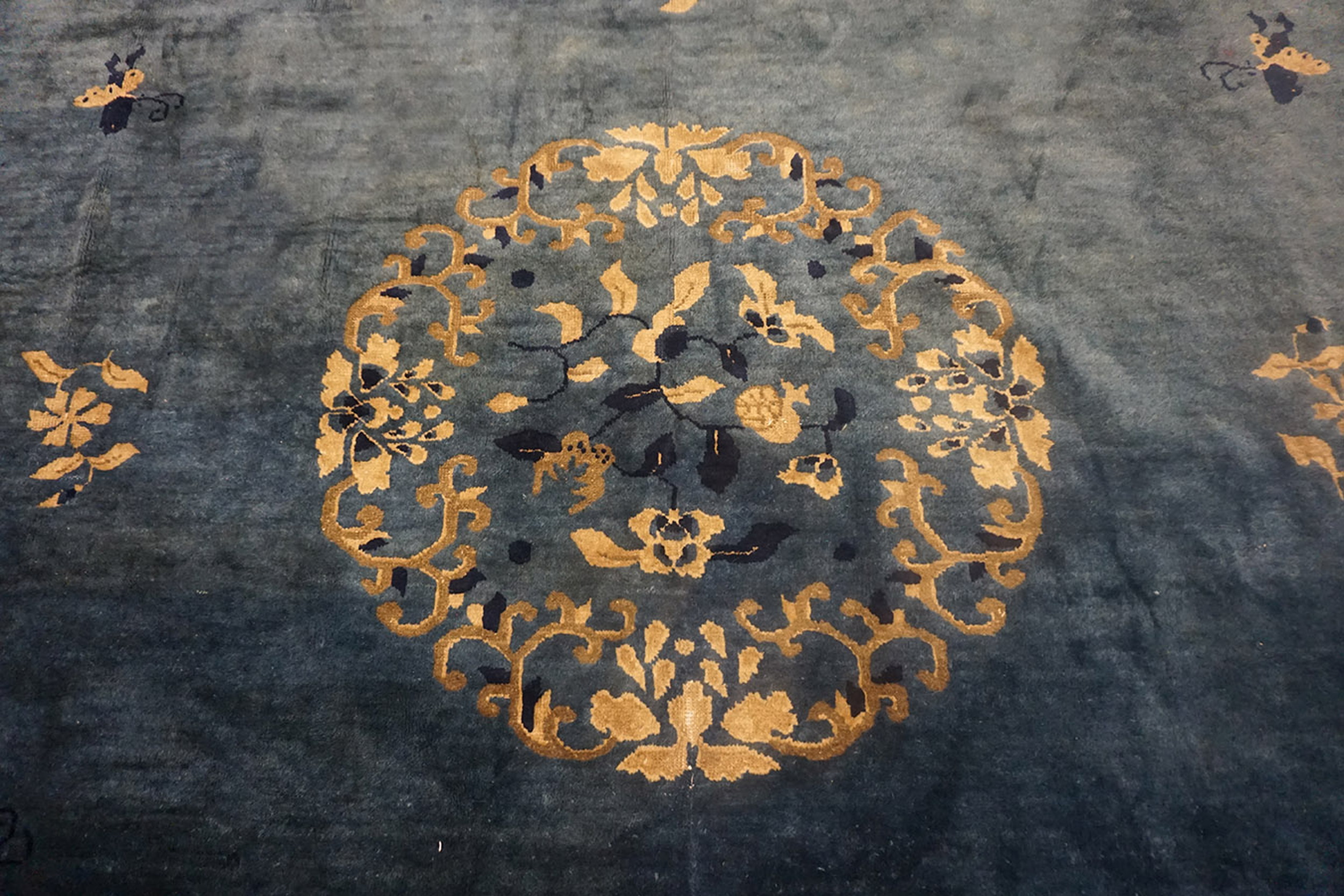 Rectangle Blue Antique Wool Chinese 1920s Room Size – Peking Knotted Rug, Circa Date: 1920s. This exceptional Chinese Peking rug captures the sophisticated aesthetic of the early Republican era. The field is dominated by a rich, saturated indigo and teal tone, characteristic of the finest blue color rugs produced during this period.