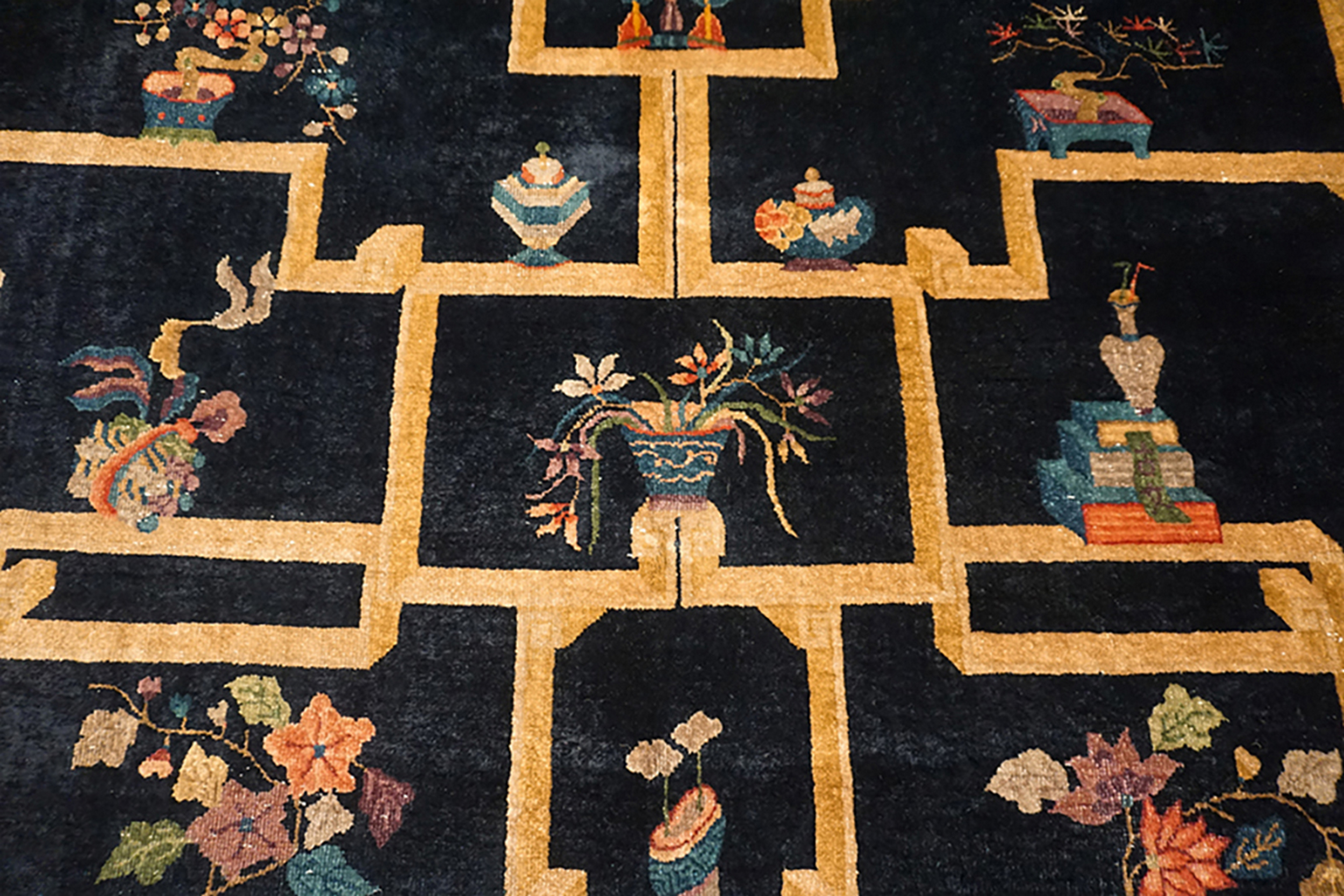 The defining characteristic of this design is the complex, rectilinear grid that segments the field into numerous small compartments. Unlike typical medallion structures, this composition utilizes an allover design approach, where each compartment holds a distinct symbolic element—vases of flowers, scholarly objects, or auspicious emblems—creating a visual inventory of Chinese cultural motifs.