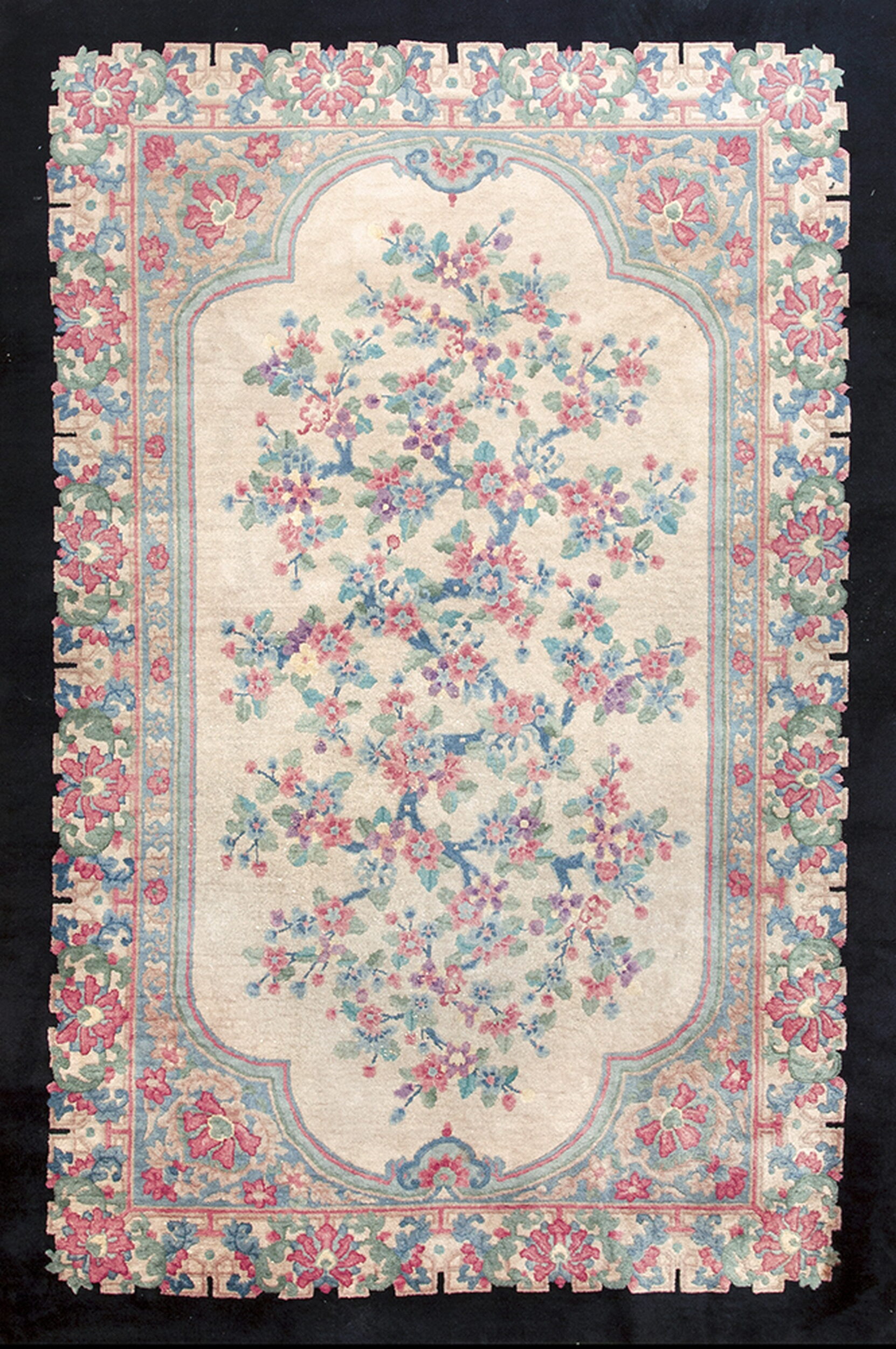 Crafted from high-quality pile wool, the rug exhibits the robust yet supple texture characteristic of fine antique rugs from the 1930s. The design features a beautifully rendered central cartouche, framed by a complex border of repeating blossoms and stylized foliage, showcasing meticulous knotting technique.