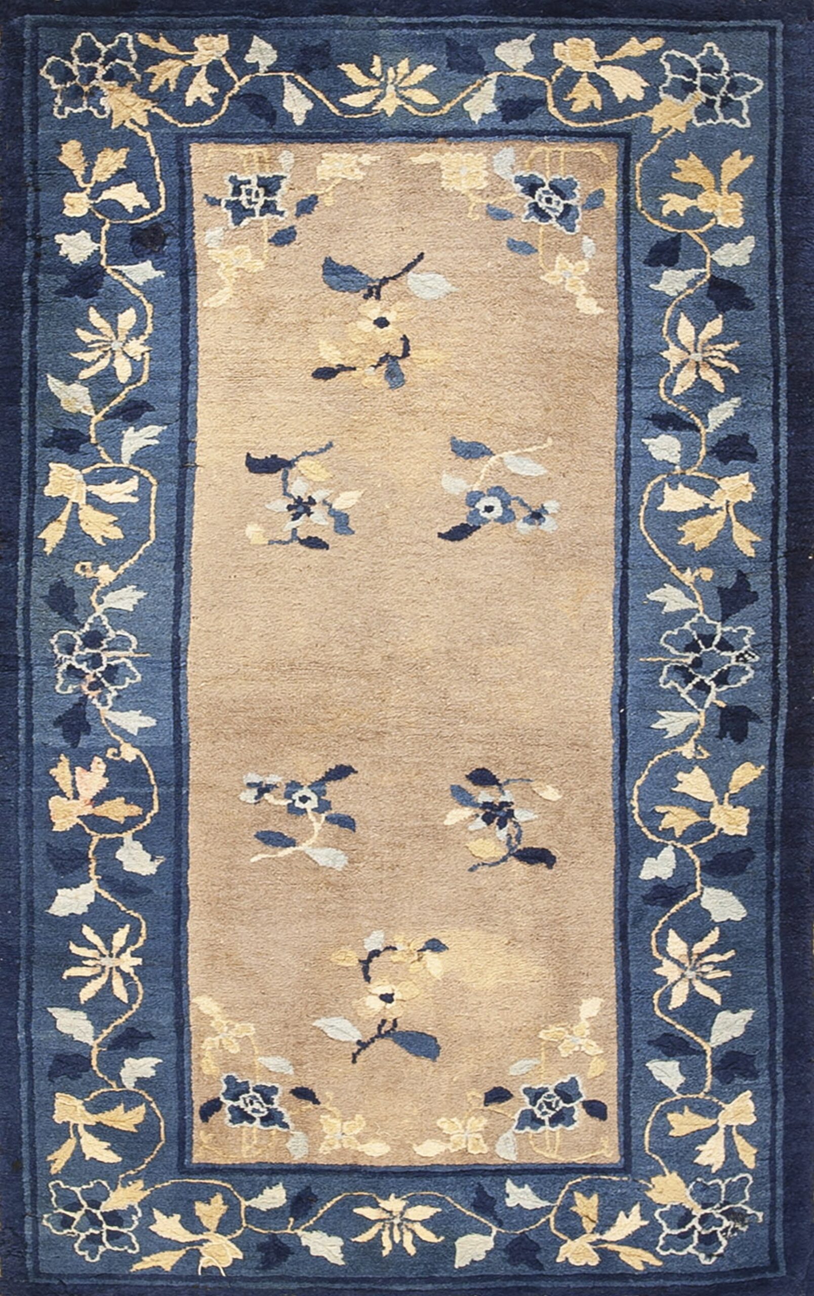 A striking contrast is achieved by the wide, deep indigo border, which frames the lighter field with dramatic effect. The border design features a flowing vine pattern, richly detailed with stylized blossoms and leaves rendered in pale yellow and white tones. This juxtaposition of light and dark hues enhances the visual depth and structural integrity of the composition.