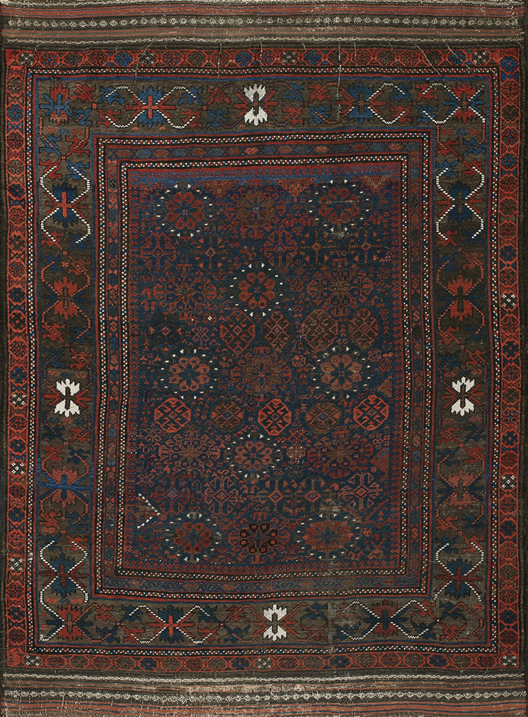 Woven entirely from high-quality wool, the rug features a mesmerizing interplay of deep indigo and terracotta hues. The primary field color is a profound, almost midnight blue, which provides a dramatic contrast to the geometric medallions rendered in oxidized reds and browns. This depth of color is typical of natural vegetable dyes used by nomadic weavers of this period.