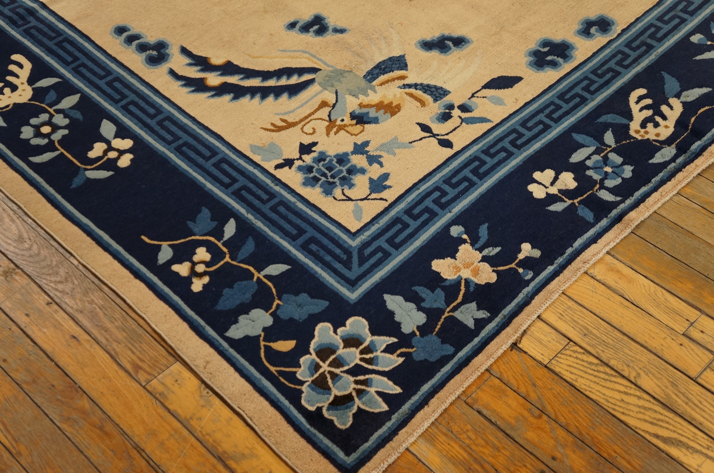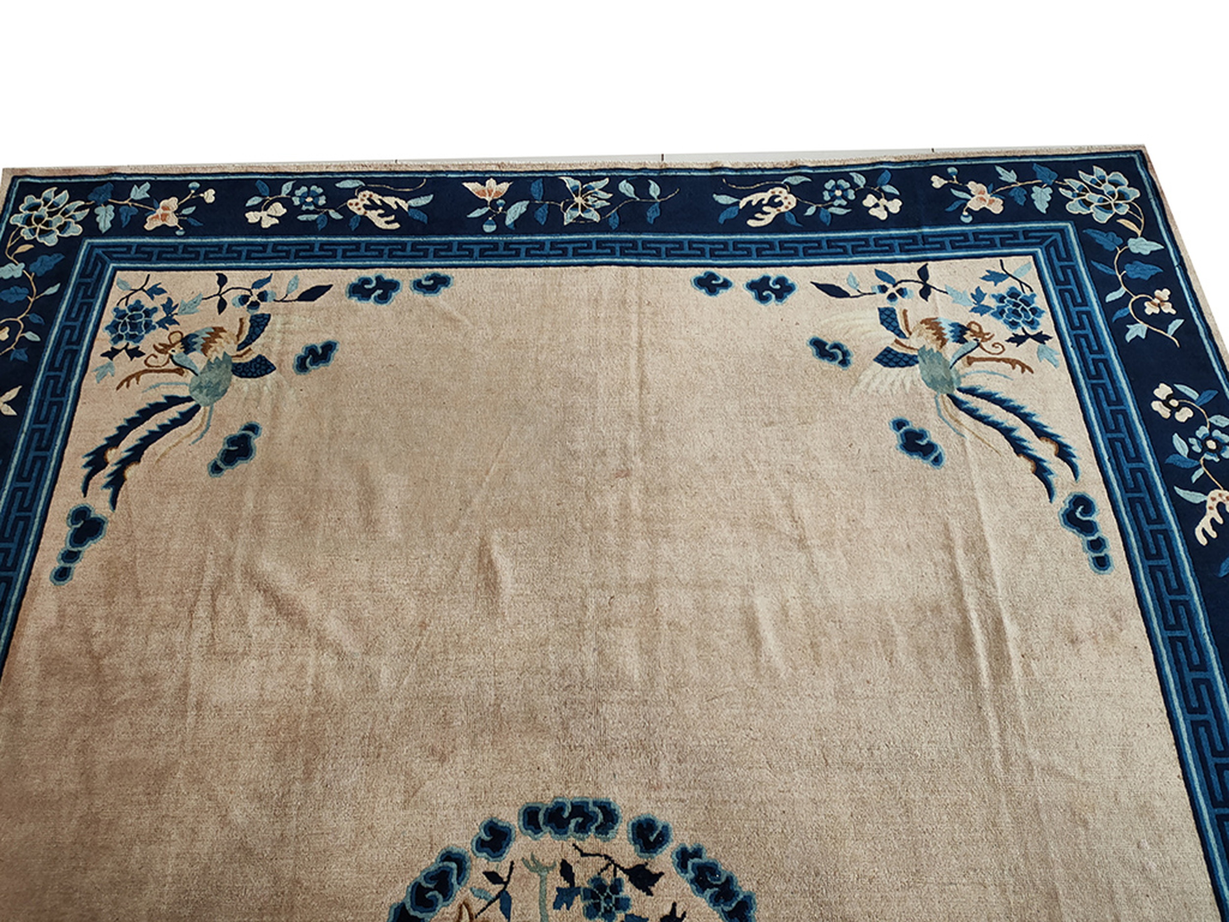 Rectangle Room Size Ivory Chinese – Peking 1920s Wool Knotted Antique Rug, Circa Date: 1920s. This exceptional example of early 20th-century Chinese weaving presents a sophisticated, expansive design ideal for modern interiors. Its generous dimensions classify it as one of our premier room size rugs, offering substantial coverage while maintaining visual lightness and elegance.