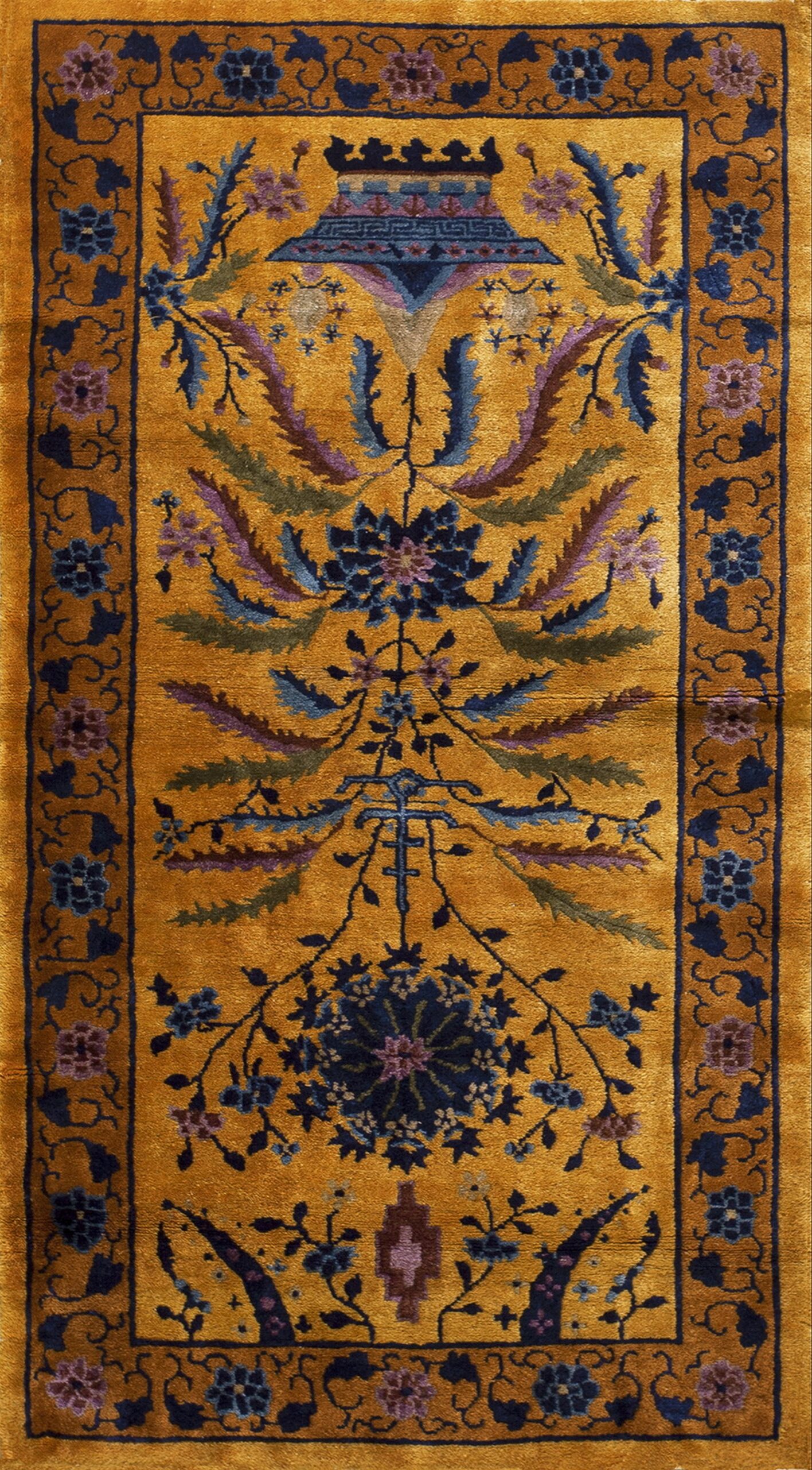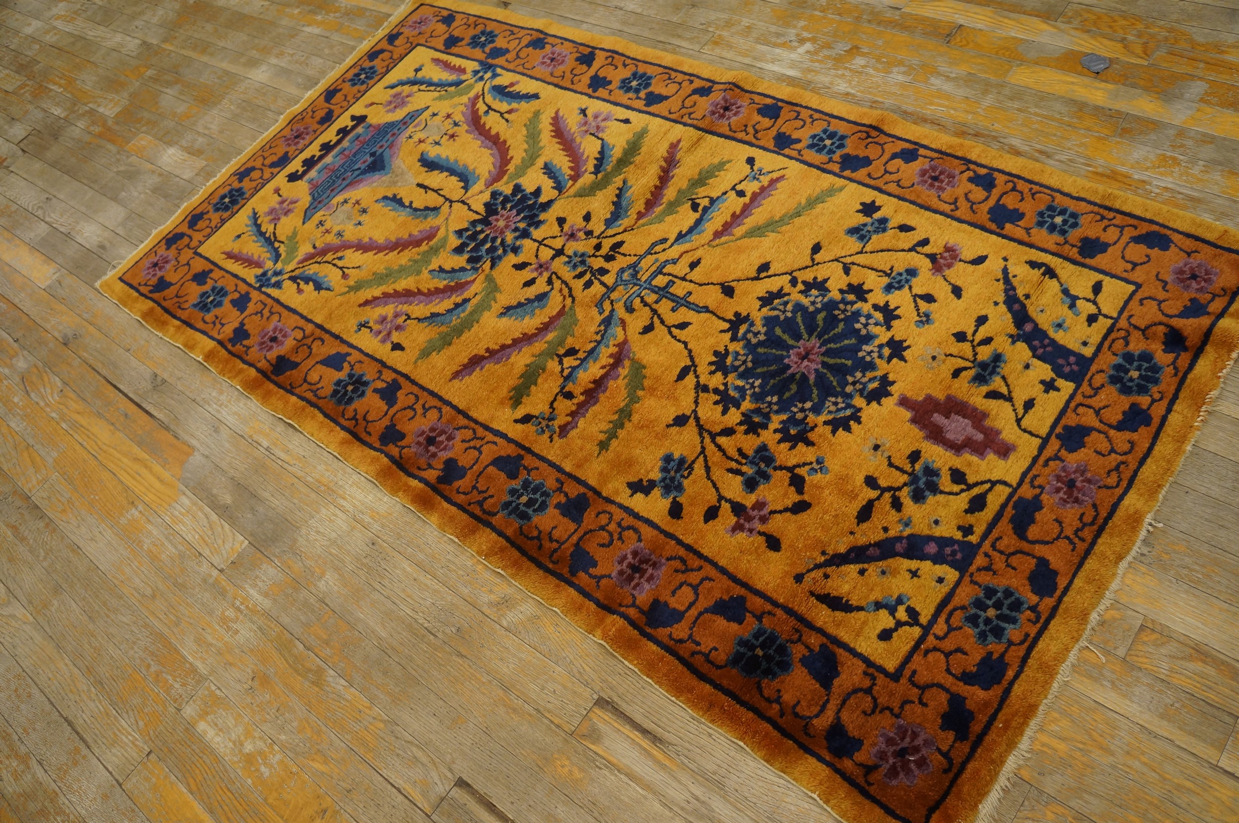 The primary visual impact is delivered by the intensely saturated field color, a brilliant hue situated between rich mustard and deep saffron. This vibrant ground provides a dramatic contrast for the stylized botanical elements rendered in deep indigo, plum, and subtle sage. Such powerful use of tonality places this piece among the most desirable gold yellow orange color rugs of the period, offering warmth and visual depth to any space.
