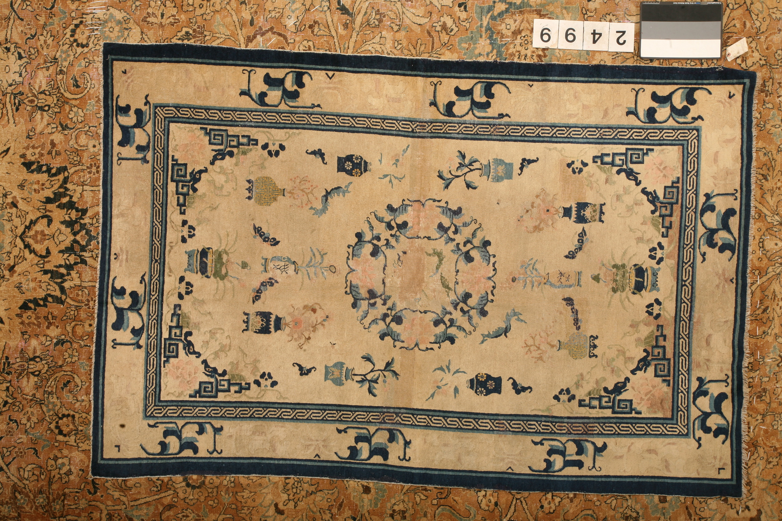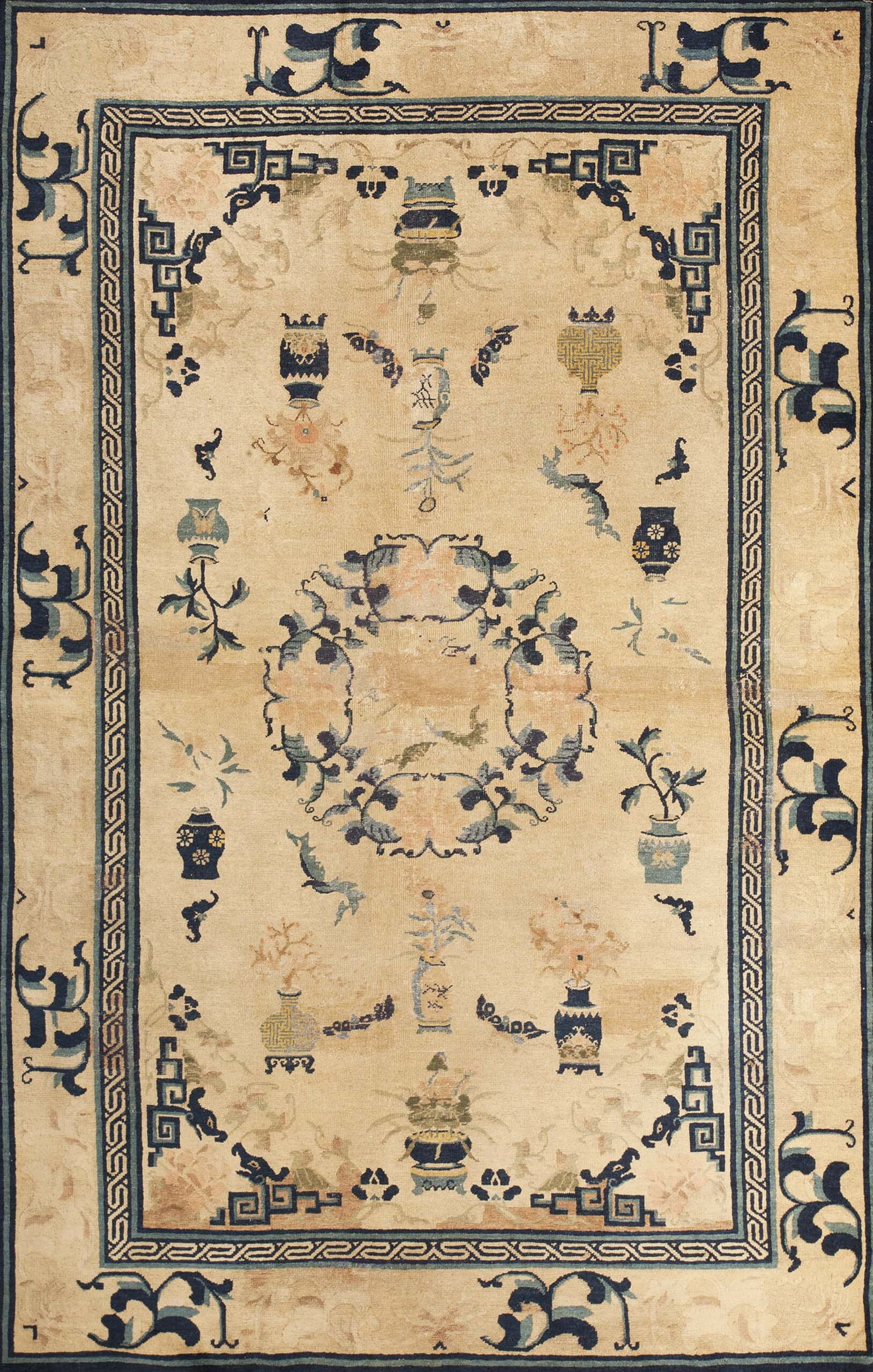 The design eschews dense repetition in favor of scattered, symbolic imagery. The central element is a graceful wreath, surrounded by stylized vases, butterflies, and sprays, confirming its classification among traditional floral rugs. These motifs are rendered with the characteristic precision and restraint inherent to the Peking tradition.