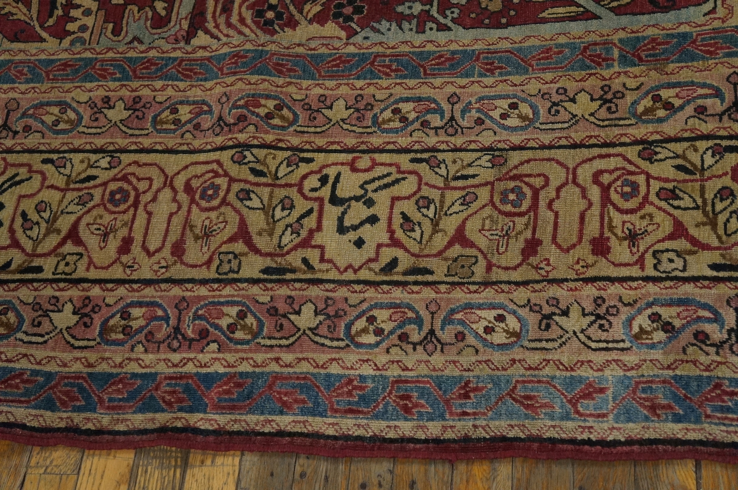 Crafted to a generous room size dimension, this piece was intended to anchor a major reception space, demonstrating the owner’s prestige and taste. The border system is equally elaborate, featuring multiple guard stripes framing a broad main band filled with delicate palmettes and curvilinear vine work, typical of classical Persian decorative arts.