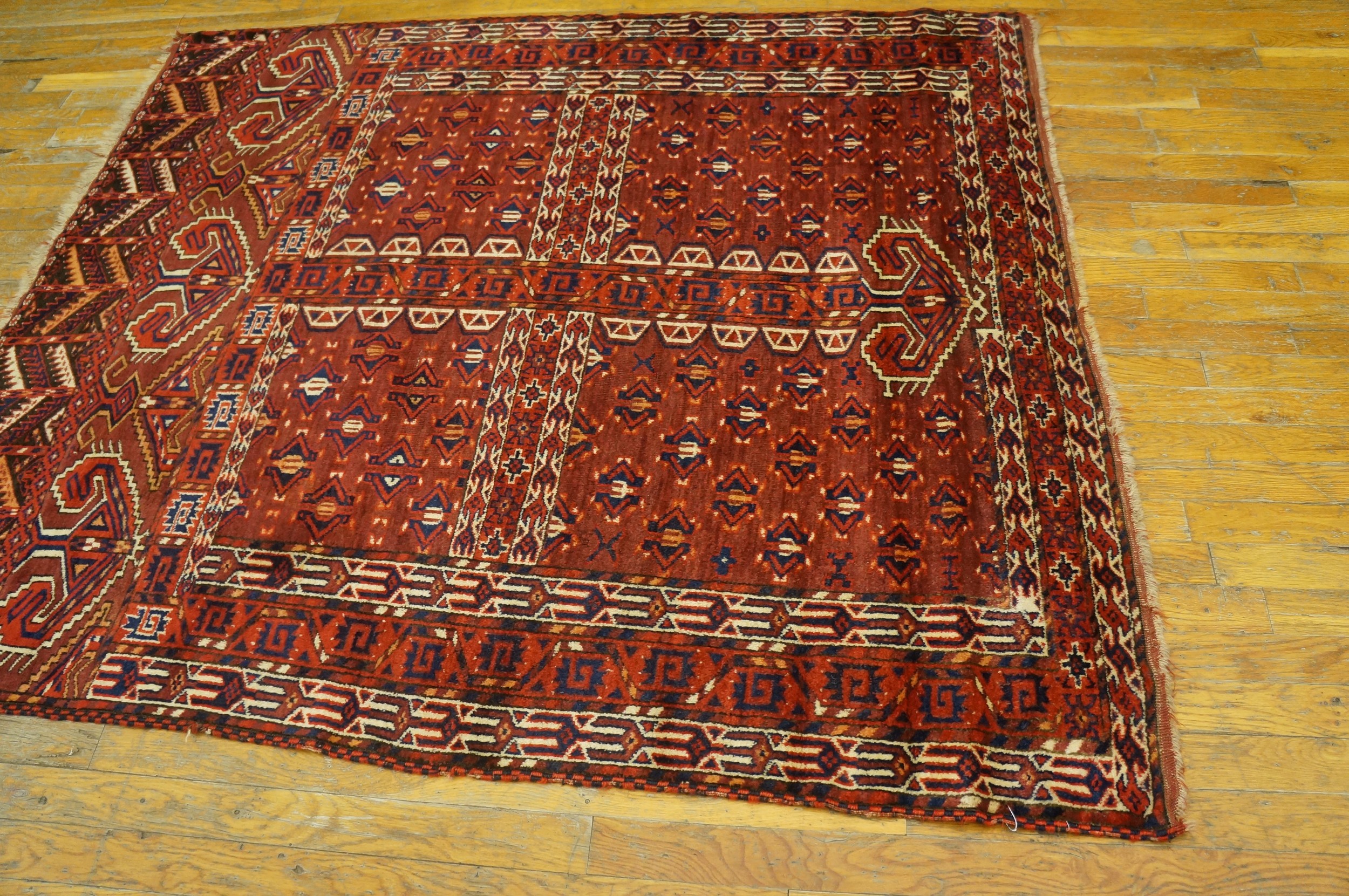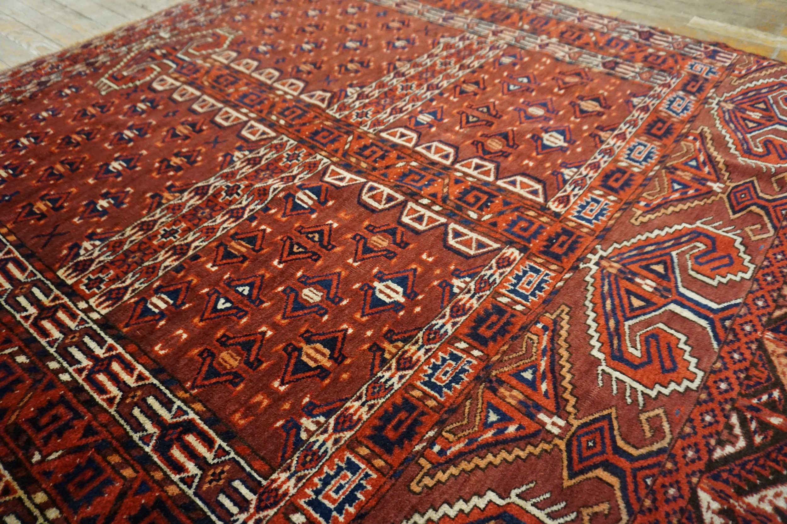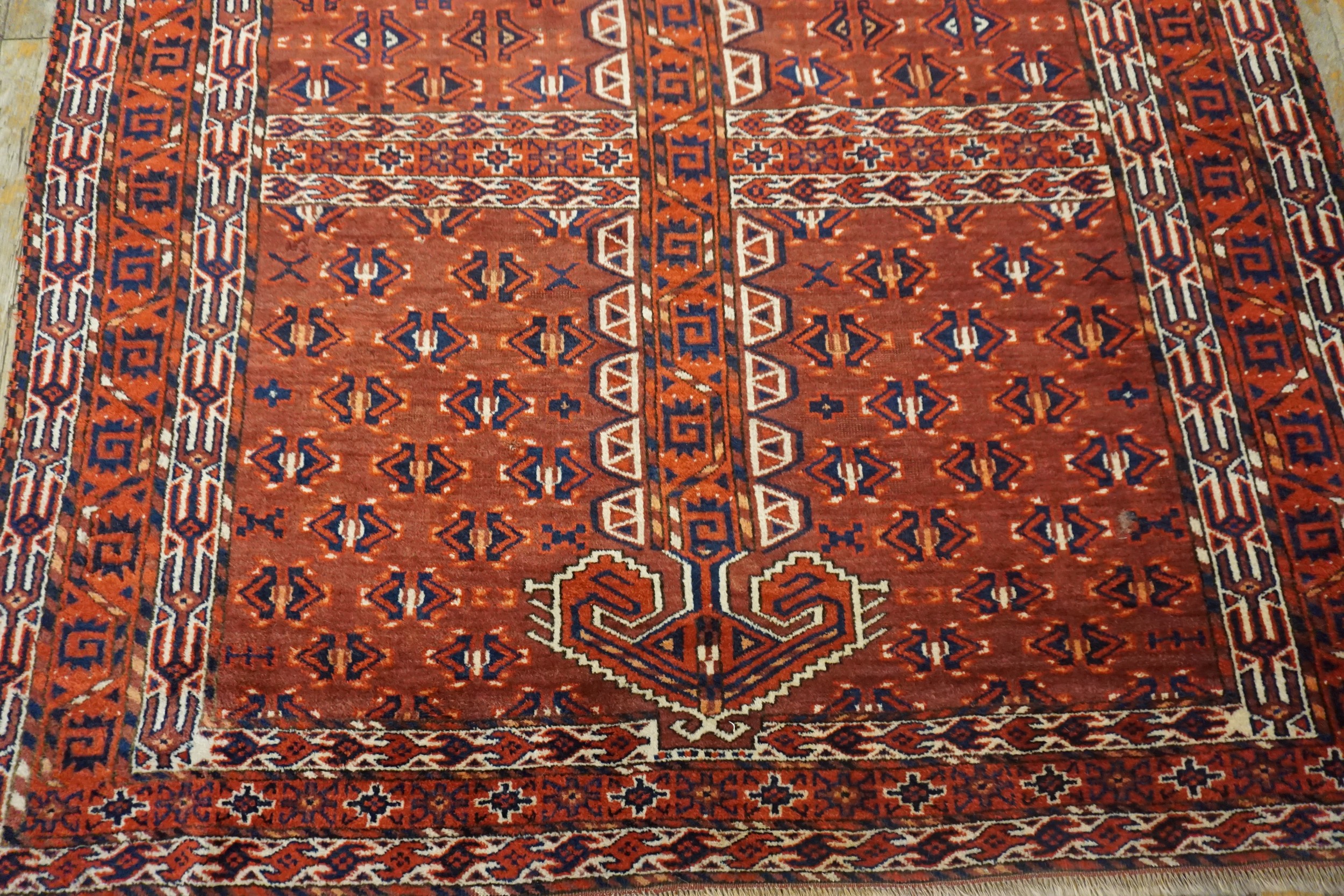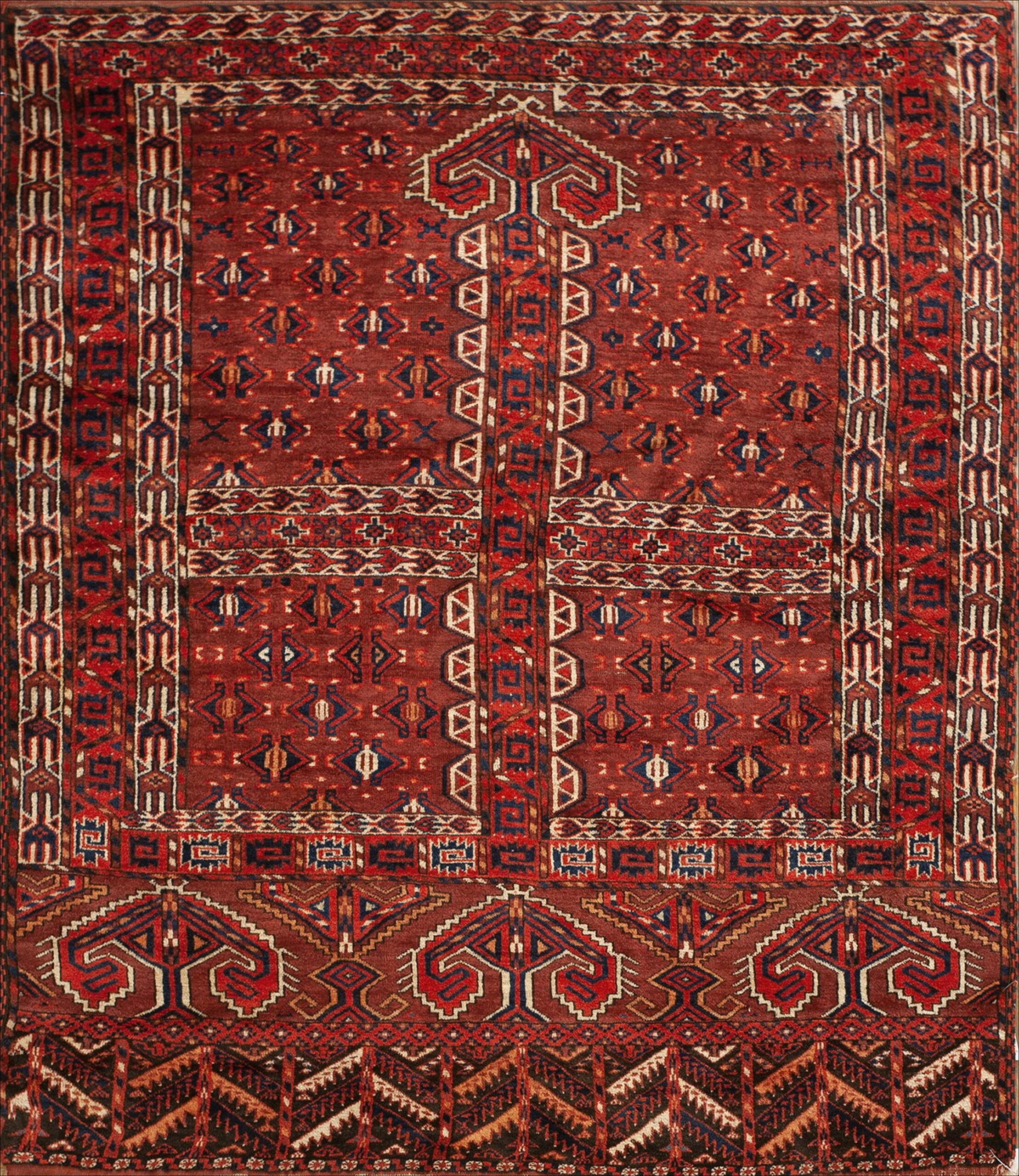 Antique Turkmen – Engsi Central Asian Allover Knotted Rug, Circa Date: 1880s. This exceptional example of an Engsi, originating from the Turkmen tribes of the Central Asia sphere, features the iconic Hatchli design, traditionally interpreted as a representation of the four quarters of the world or a stylized entrance. The precise, allover knotting technique speaks to the high quality expected of these important antique rugs.