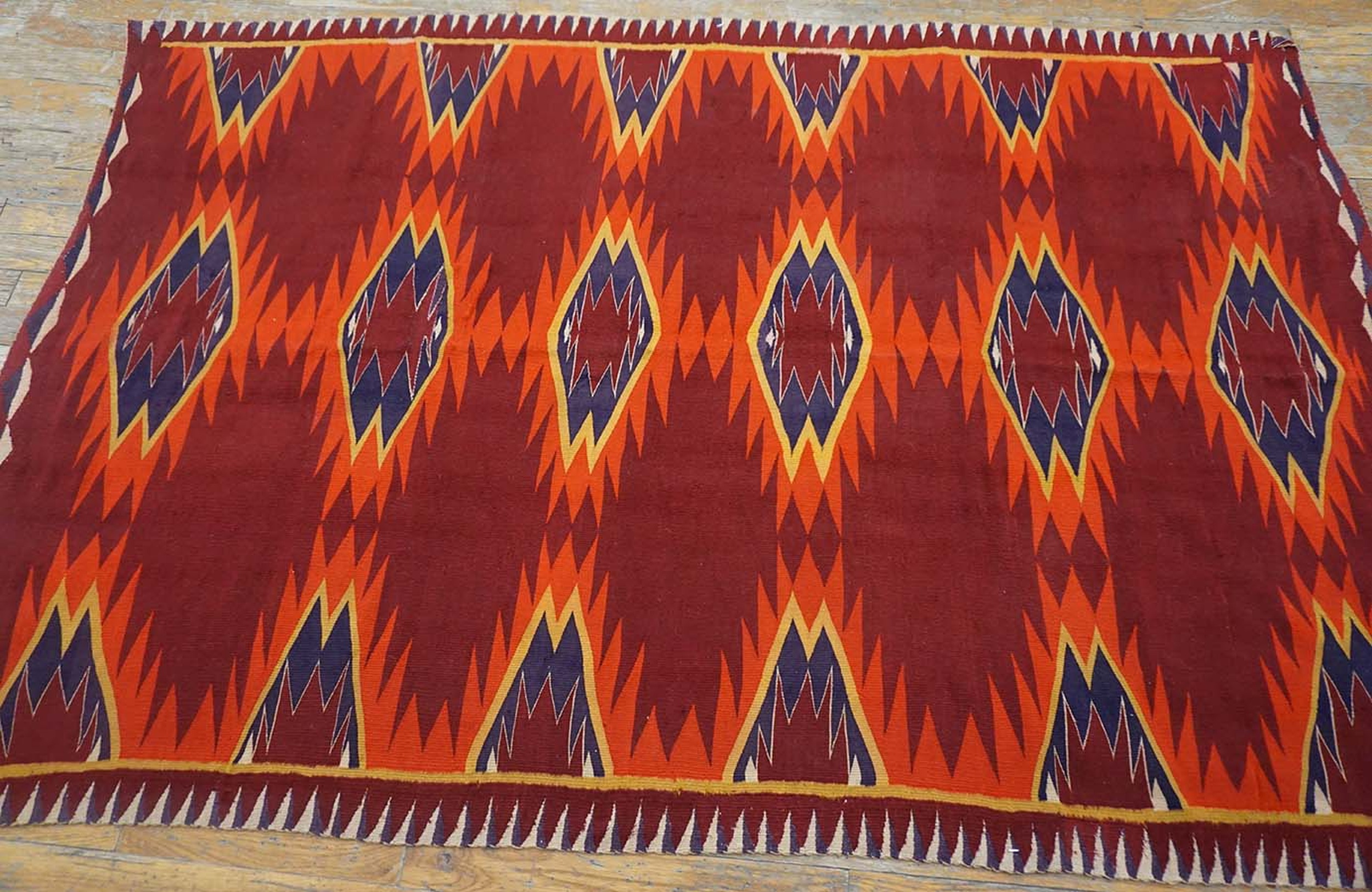 Woven using a tightly packed flat weave technique, this piece possesses a lean, durable structure that has preserved its integrity for over a century. The use of natural and early aniline dyes contributes to the vivid saturation, which remains remarkably fresh despite its age. As a genuine textile dating to the 1890s, it is a significant piece of antique rugs history, reflecting the transition from traditional blanket weaving to commercial rug production.