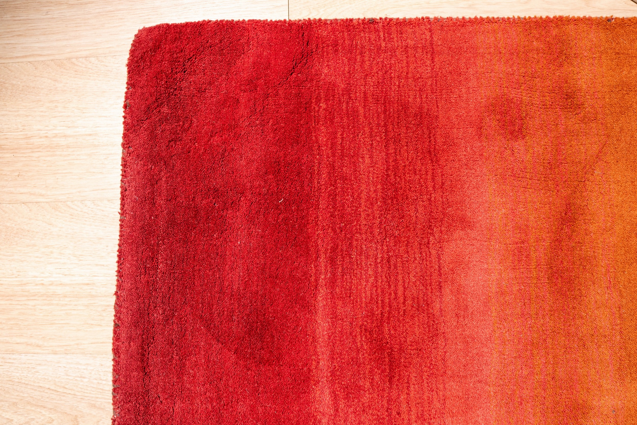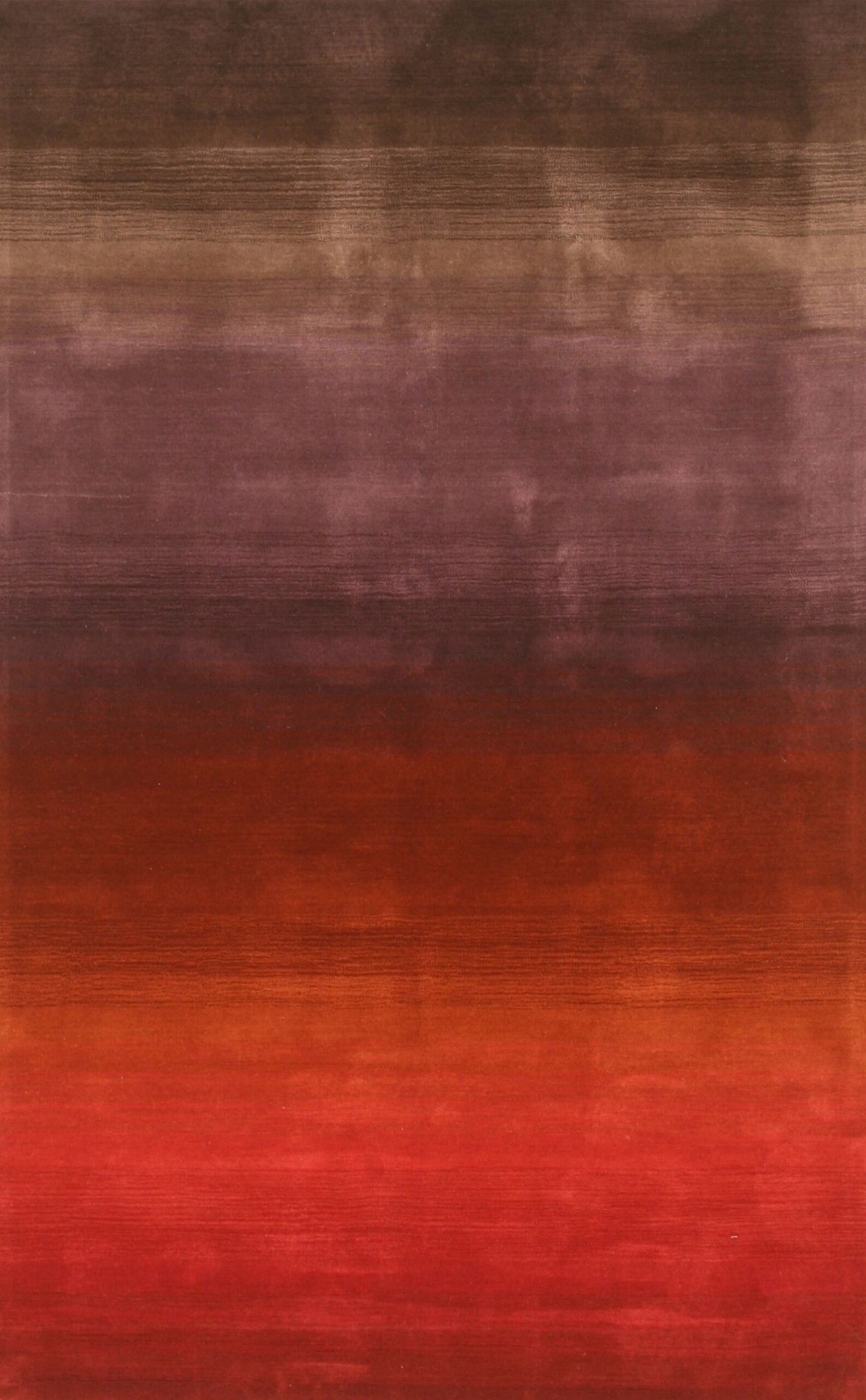 The design is a masterful study in color transition, employing a sophisticated horizontal ombre effect that moves seamlessly from deep, earthy browns at the top to vibrant, fiery reds at the base. Subtle shifts in tone incorporate hues often associated with salmon, coral, pink color rugs, creating visual depth and warmth.