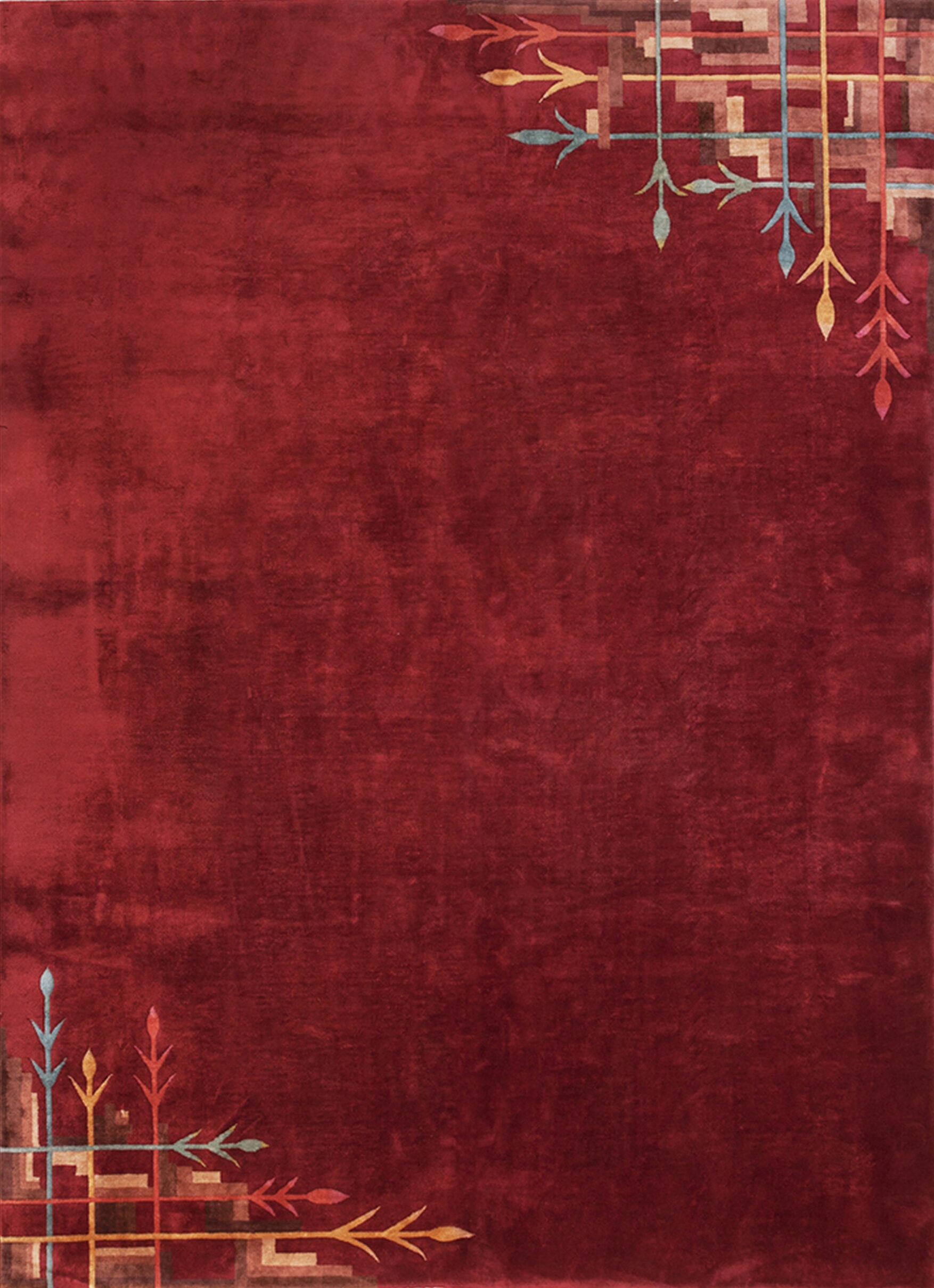 In stark contrast to the simplicity of the main field, the corners feature highly stylized, architectural motifs. These dynamic compositions utilize crisp lines and layered blocks of color—including soft blues, yellows, and browns—to create an effect that is simultaneously abstract and organic. This careful balance between bold color blocking and stylized natural forms is characteristic of the finest geometric rugs from the period.