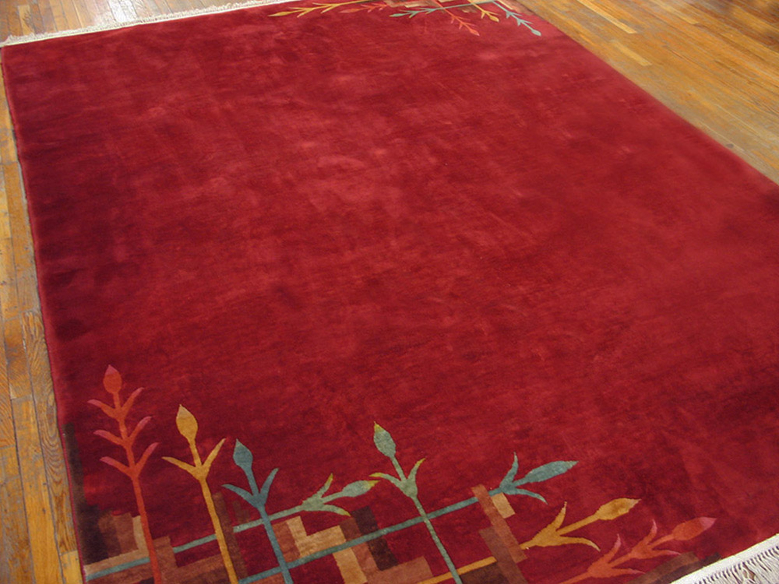 Room Size 1930s Knotted Antique Rectangle Chinese – Art Deco Coral Wool Rug, Circa Date: 1930s. This exceptional Chinese Art Deco carpet captures the essence of 1930s design, where Eastern tradition met Western modernism. The expansive, plush field is saturated in a rich, deep coral hue, providing a dramatic foundation that defines the piece. This specific shade is highly sought after among collectors looking for coral color rugs that offer both warmth and sophistication.