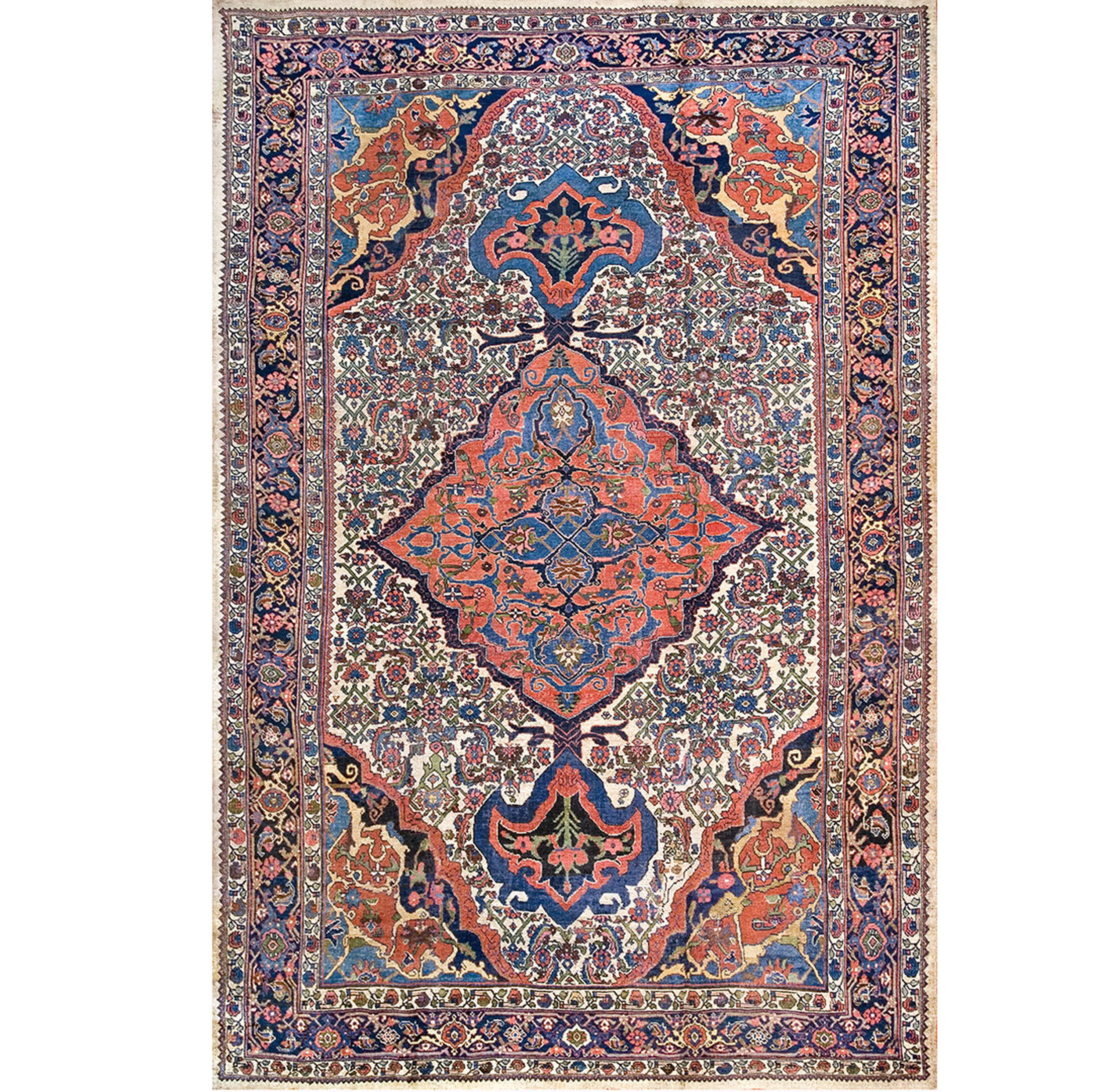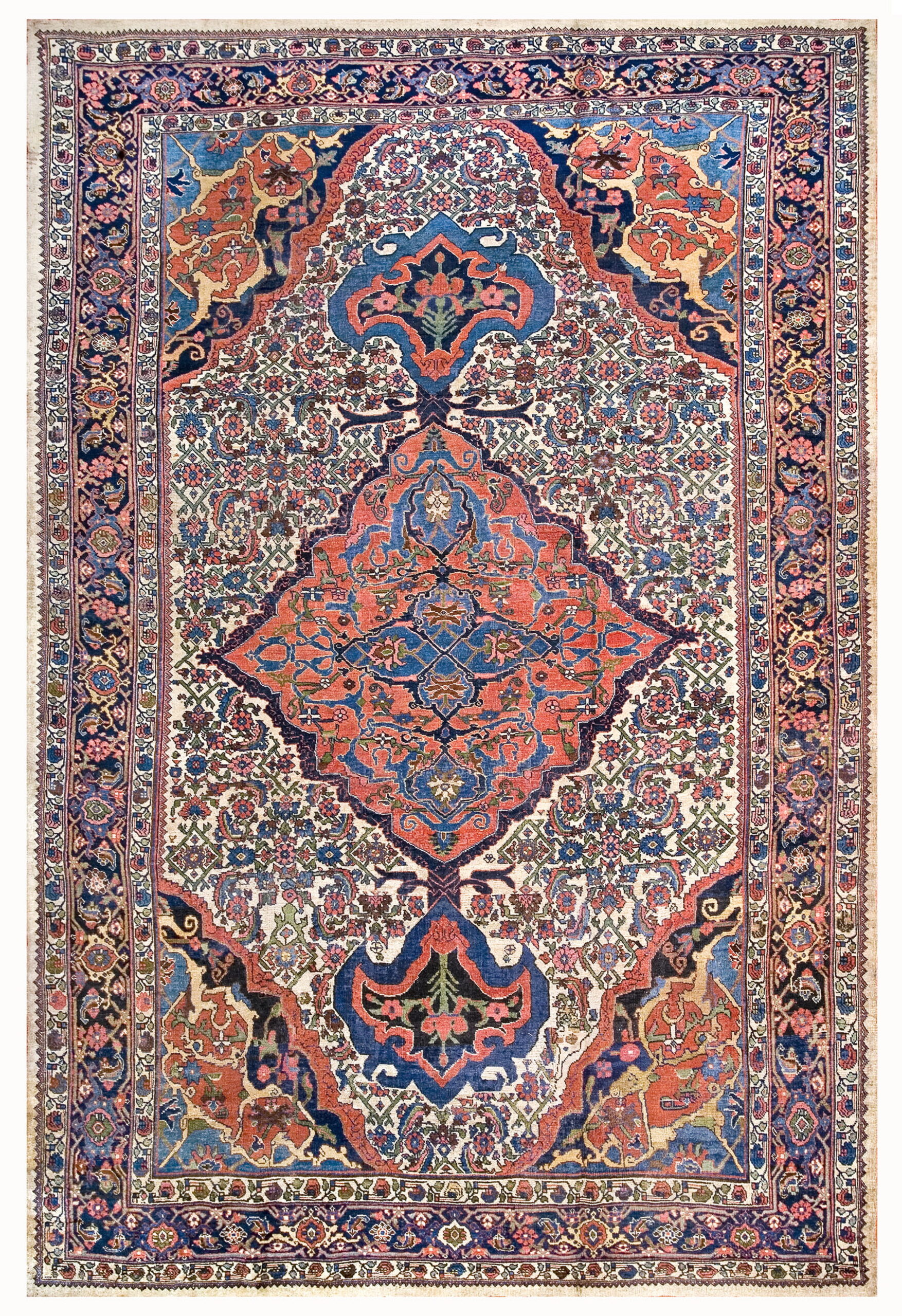 The field is dominated by a rare, luminous ivory ground, which provides a striking contrast to the saturated, natural dyes used throughout the design. A central, powerful medallion in deep indigo and terracotta anchors the composition, surrounded by a dense floral pattern of boteh and stylized palmettes.