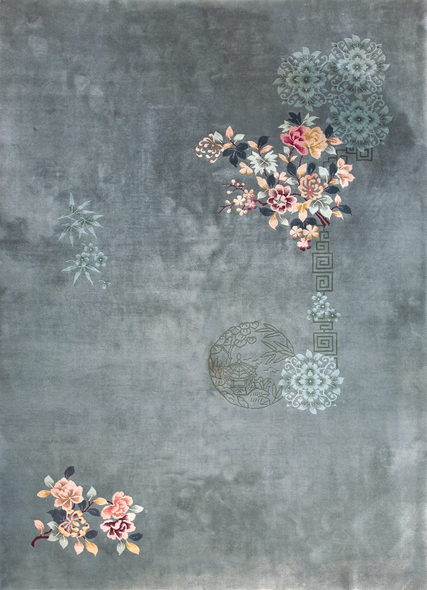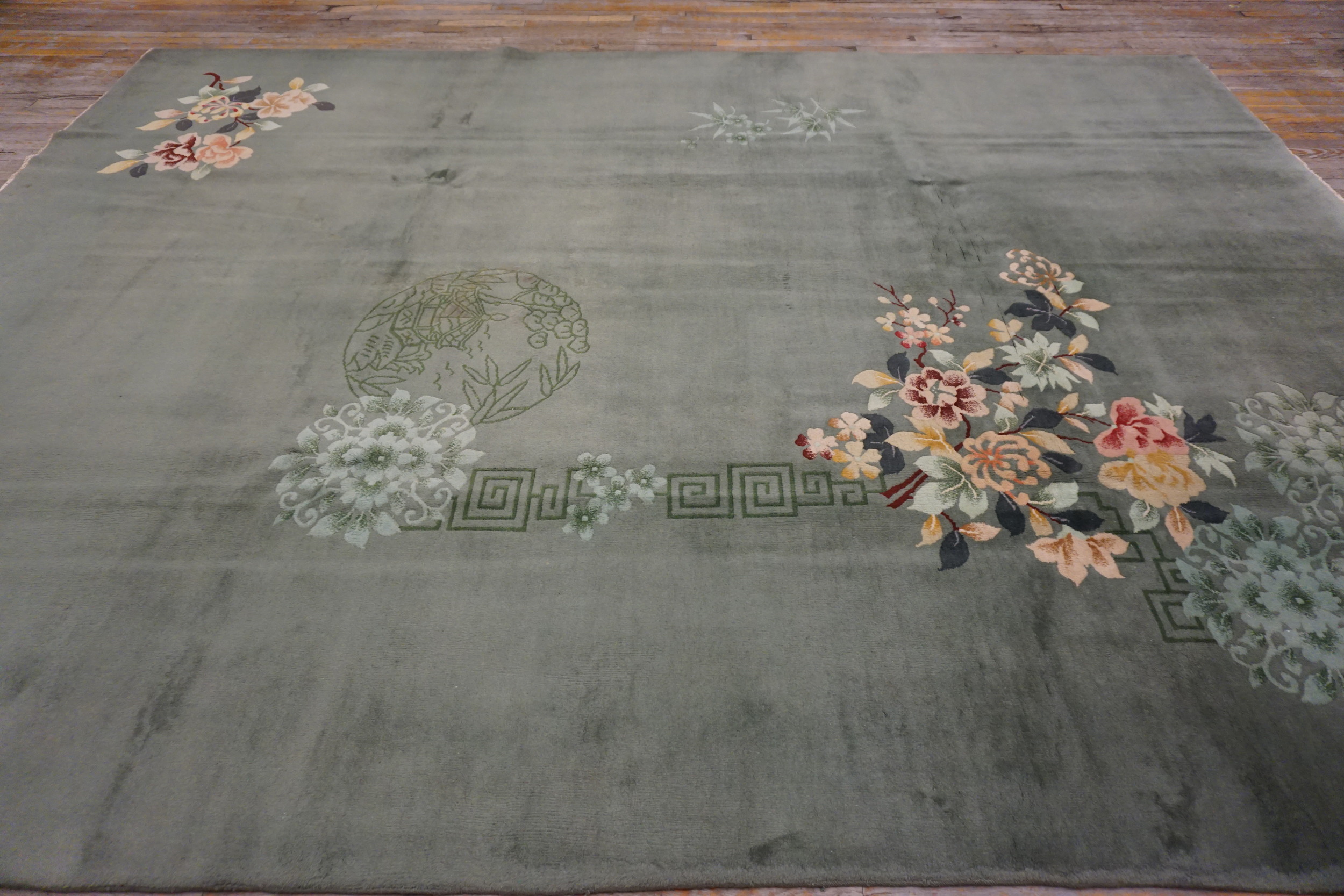 Unlike earlier, highly centralized designs, this rug employs a corner-based arrangement, featuring a cascade of blossoms anchored by a subtle geometric key-fret element. The use of shading and varied pile height gives the blooms a three-dimensional quality, enhancing the luxurious texture characteristic of high-quality 1930s Chinese production.