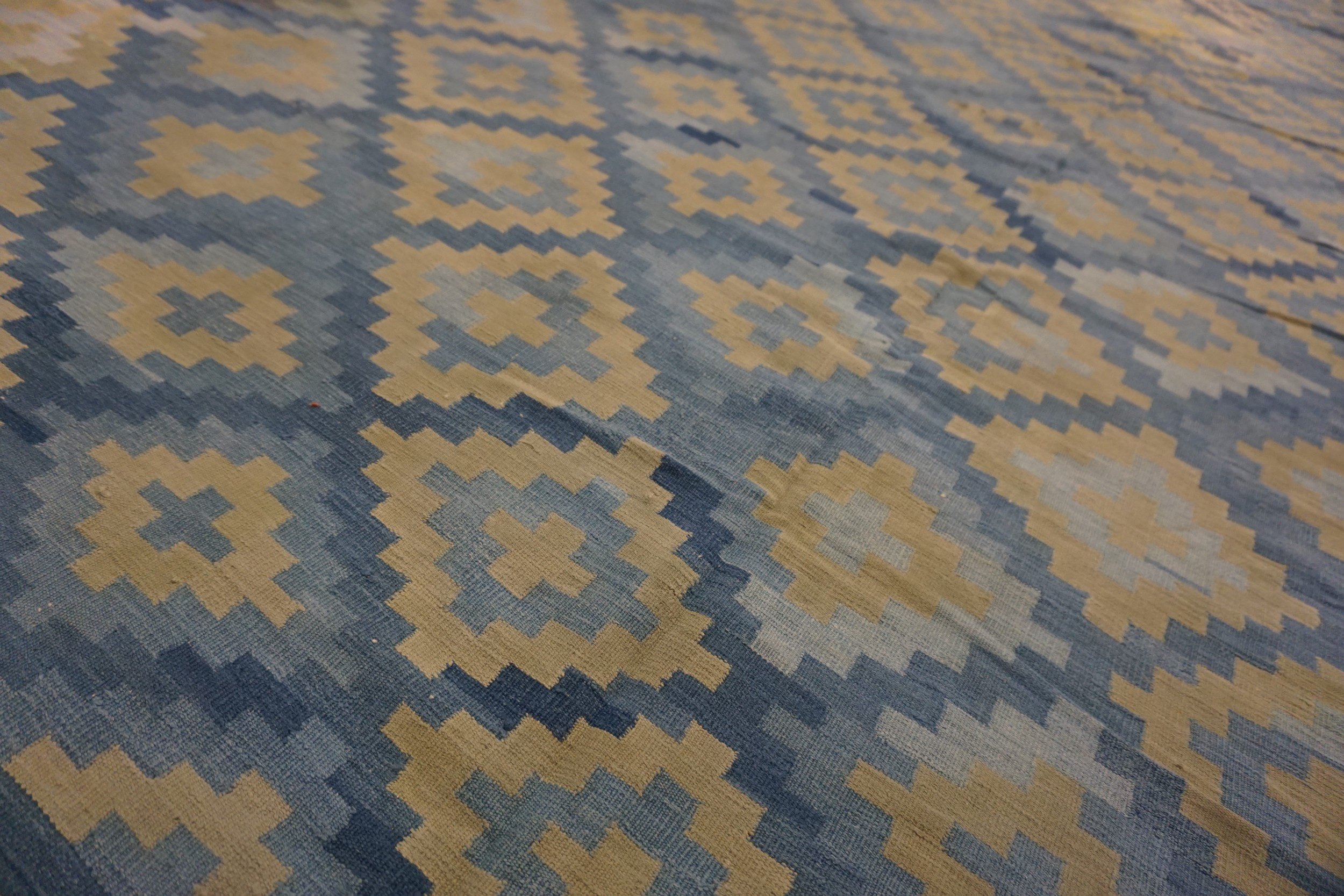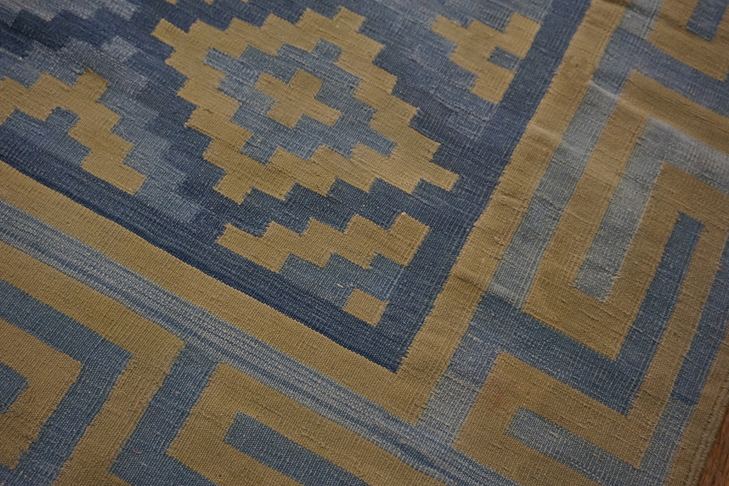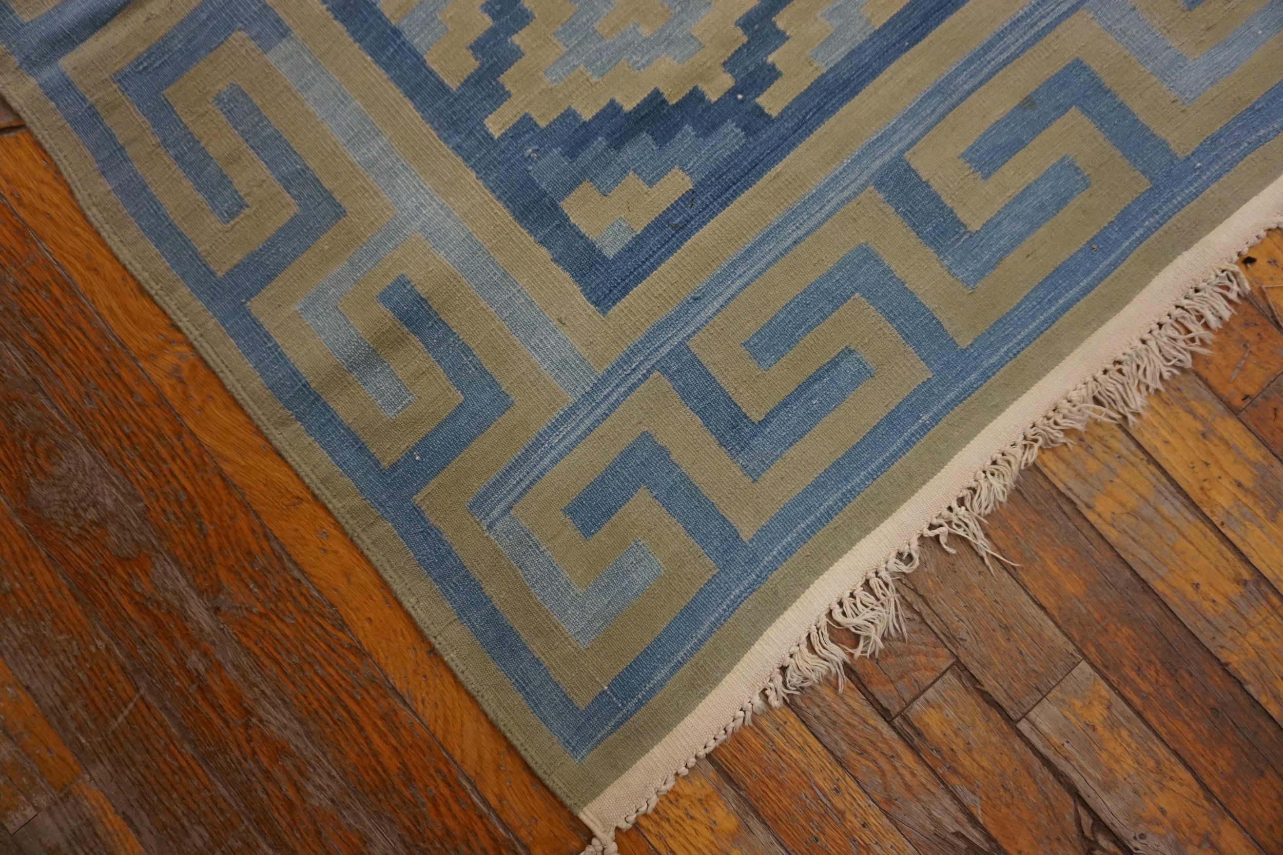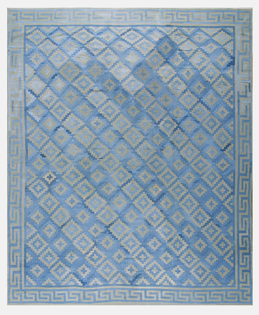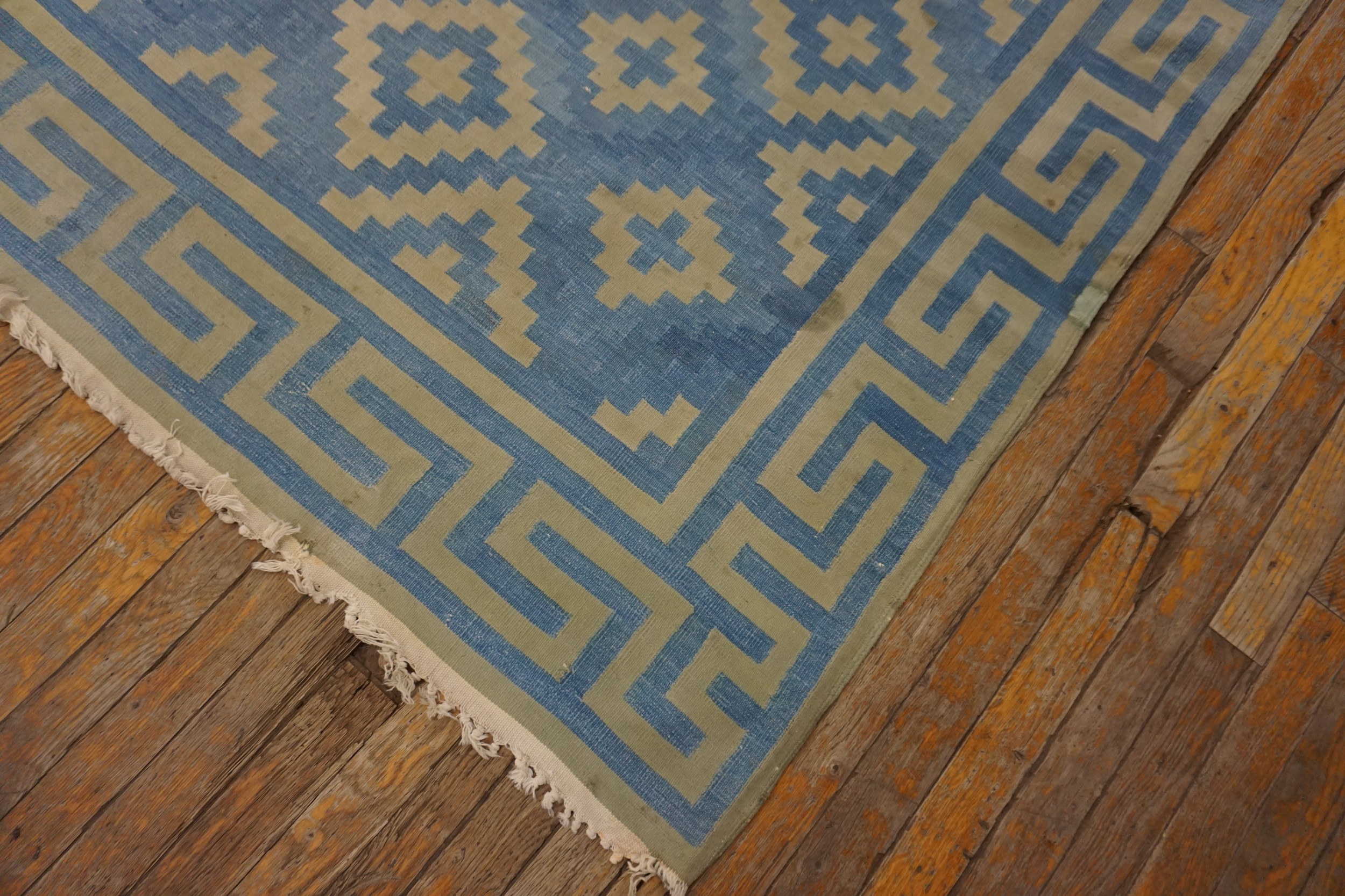 Antique Dhurrie Room Size Cotton Blue Rug, Circa Date: 1930s. This exceptional piece captures the geometric elegance popular during the Art Deco period, rendered in a soft cotton weave. Its substantial dimensions qualify it among the finest room size rugs available from this era, offering expansive coverage suitable for grand interiors.