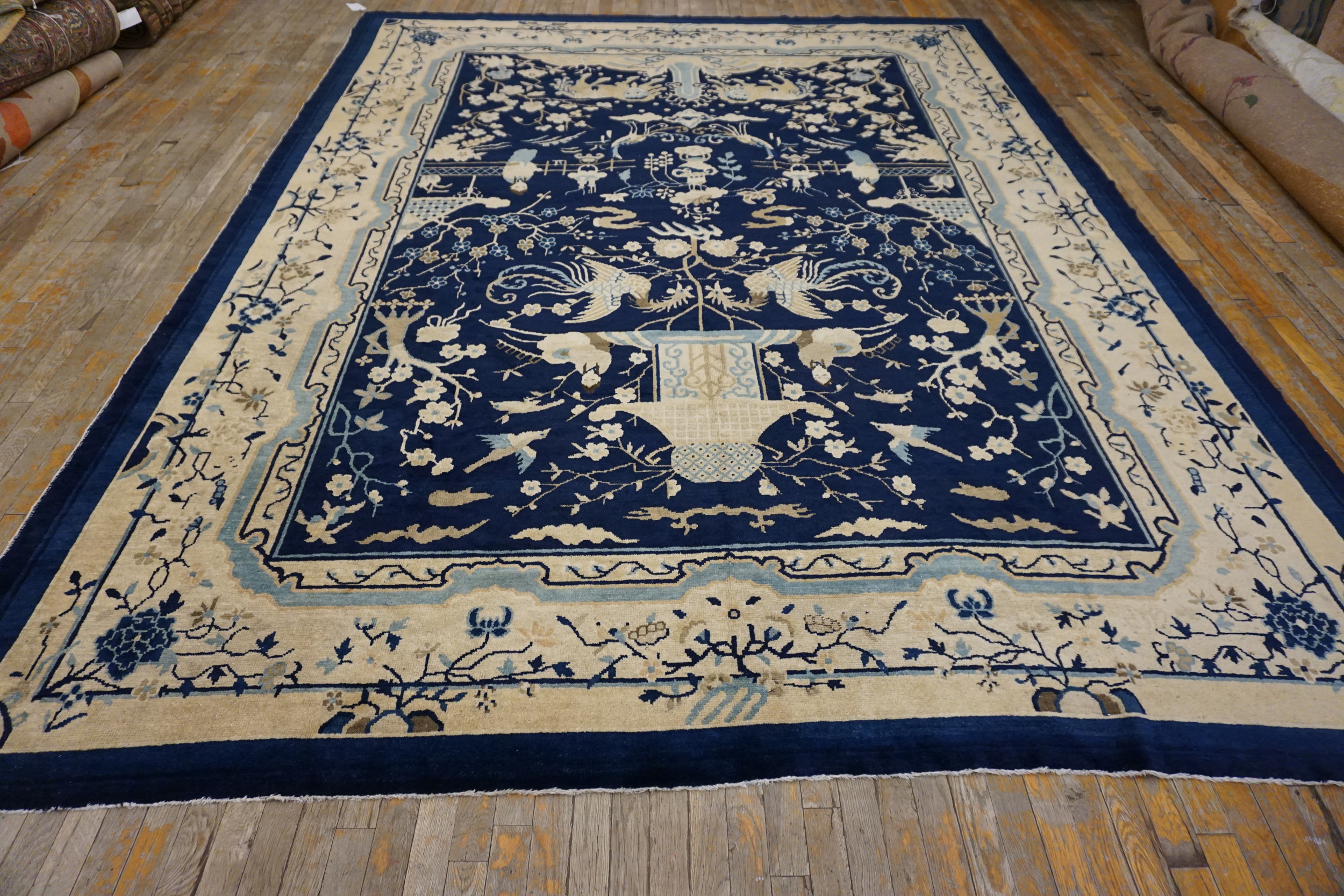 Room Size Chinese Antique Knotted – Peking Rectangle Blue 1920s Wool Rug, Circa Date: 1920s. This magnificent example of early 20th-century Chinese weaving presents a saturated indigo field, characteristic of the finest blue color rugs from the Peking region. Its substantial dimensions and rich coloration make it an exceptional foundation piece for a distinguished interior.