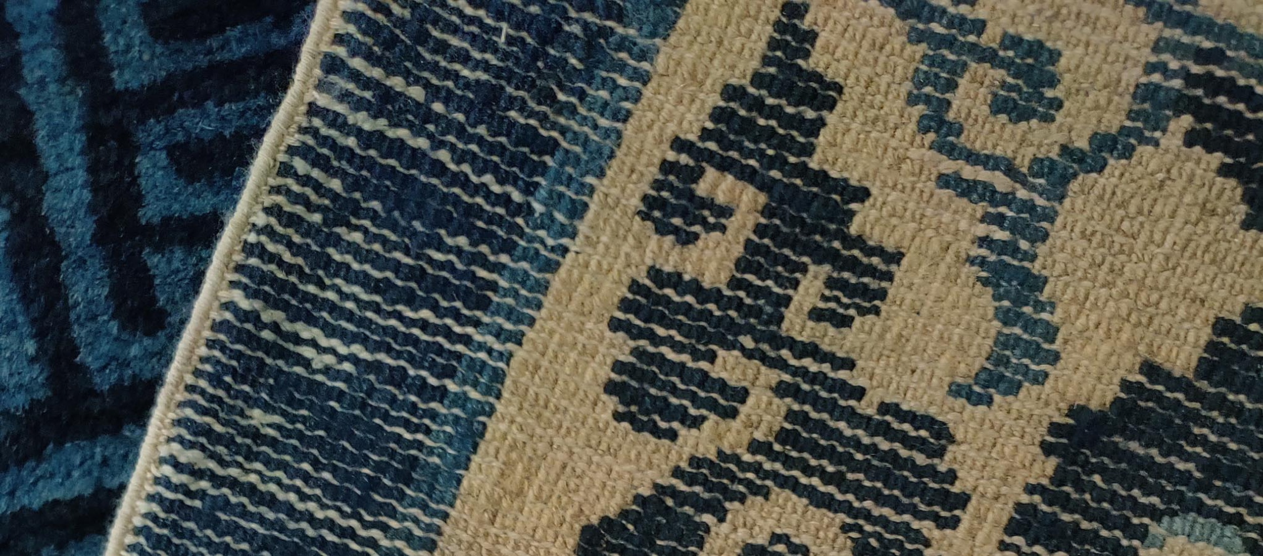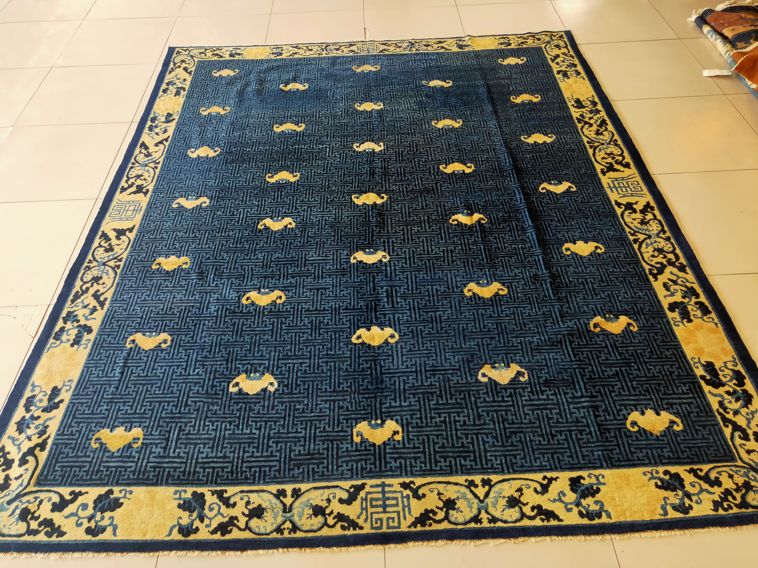 The field is dominated by a rich, almost midnight blue color achieved through natural dyes, providing a dramatic contrast to the pale cream motifs. The background features a subtle, tone-on-tone geometric fretwork—a classic Chinese meander pattern—that adds textural depth beneath the primary scattered elements.