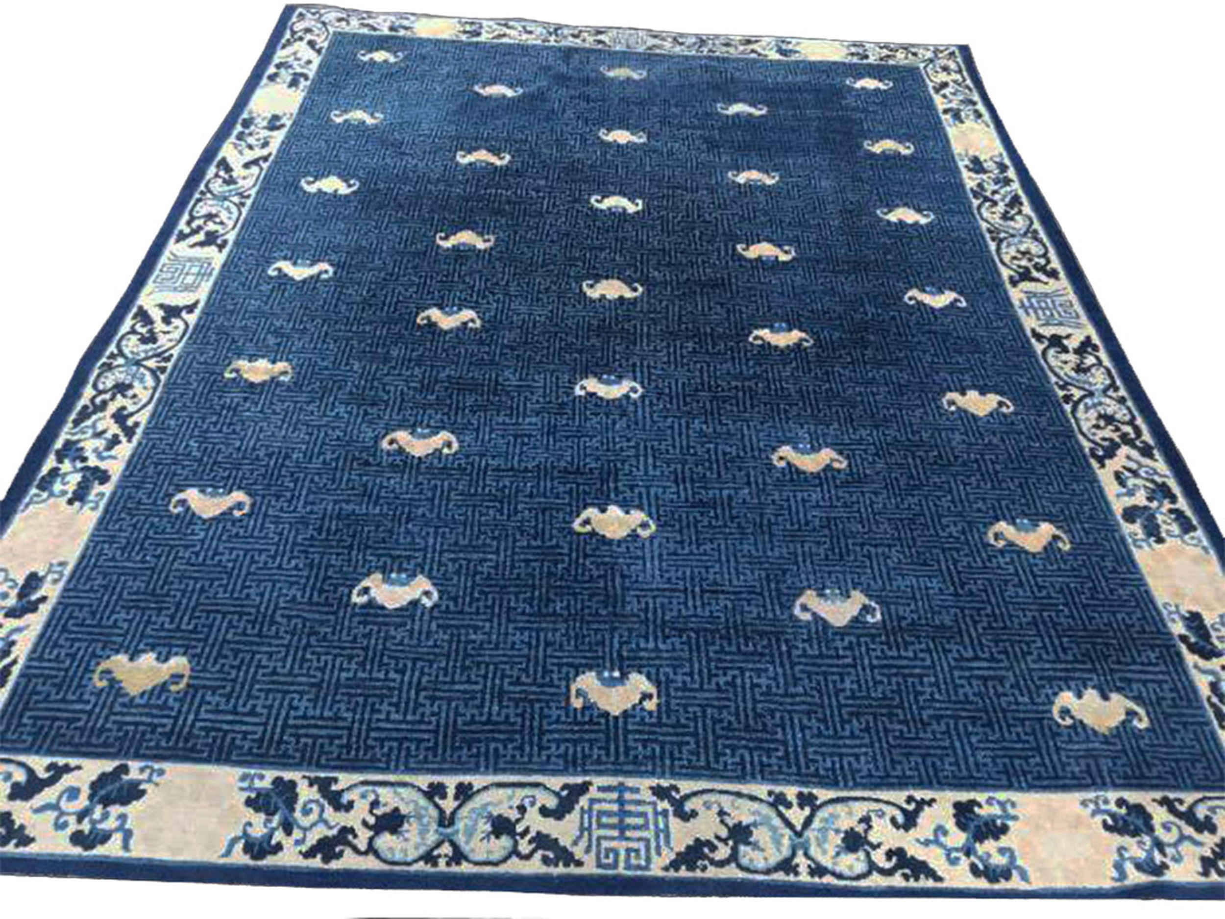 Blue Antique 1880s Allover Geometric Hand Knotted Pile Wool Rectangle Rug, Circa Date: 1880s. This exceptional piece represents the height of late 19th-century Chinese weaving, characterized by its deep, saturated indigo field and restrained use of color. Such magnificent antique rugs from the Peking region are highly sought after for their refined aesthetic and enduring quality wool pile.