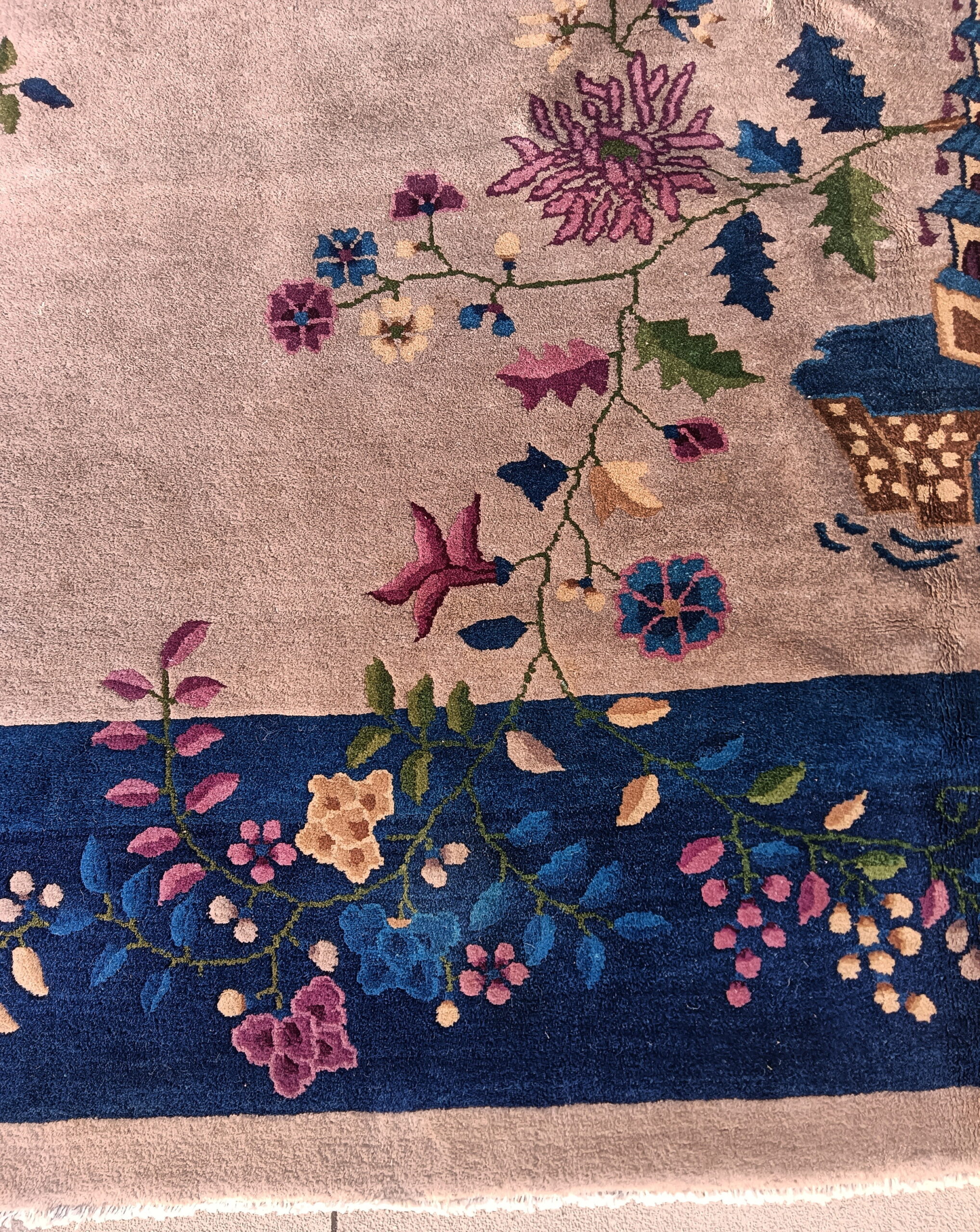The design employs an open composition, characteristic of the era, featuring stylized pagodas, weeping willows, and delicate blossoms scattered across the field. Unlike more tightly organized Persian carpets, this piece uses negative space to enhance the visual impact of the detailed, naturalistic elements. It stands as a refined example within the category of floral rugs, emphasizing elegance over density.