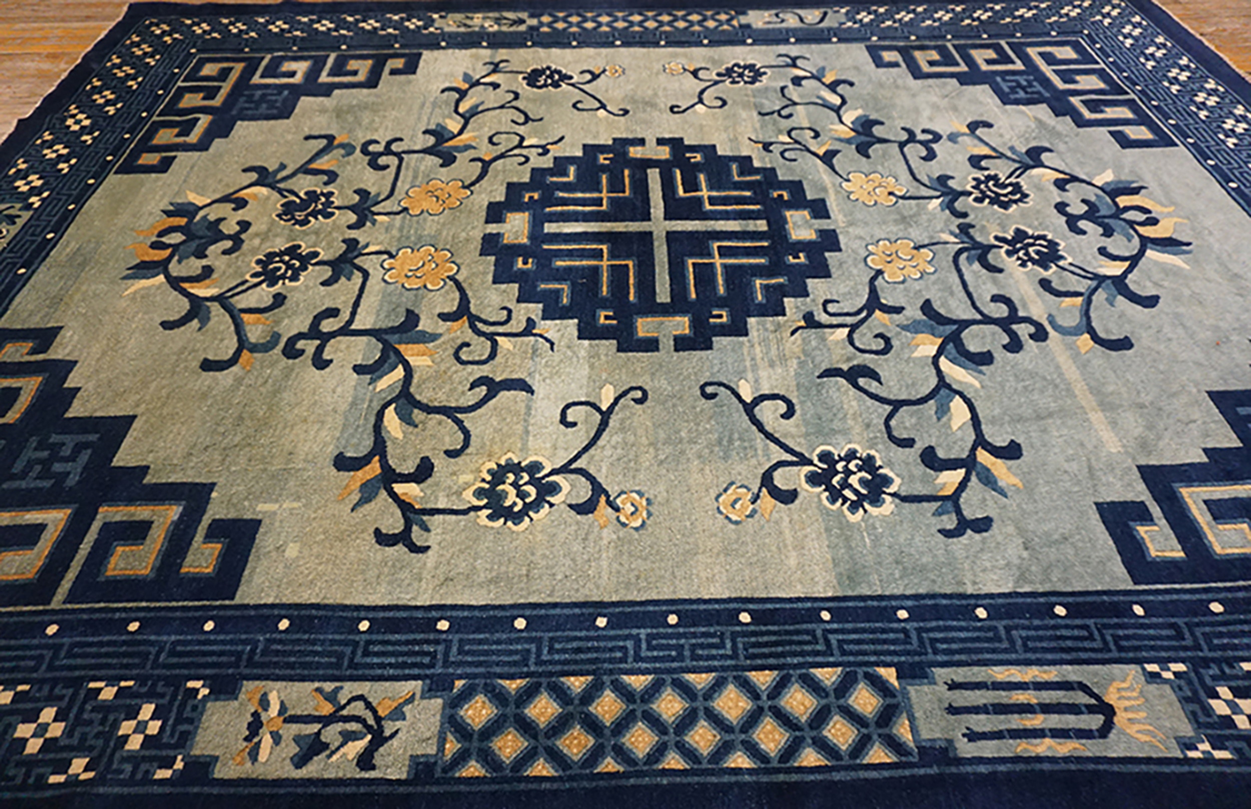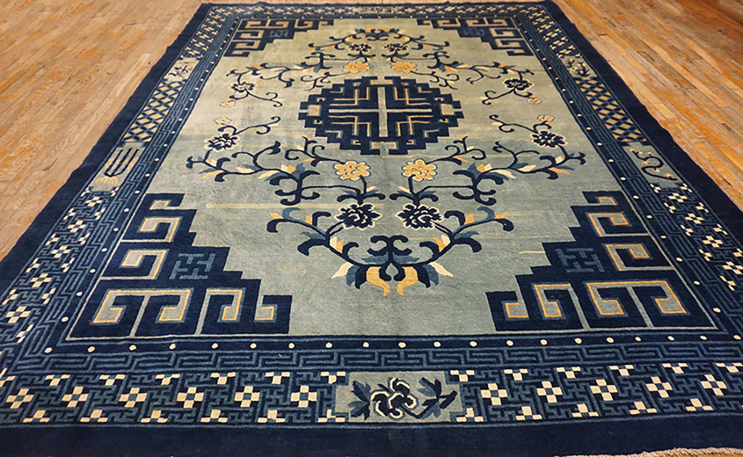 Room Size Chinese Knotted Antique – Peking 1880s Rectangle Wool Blue Rug, Circa Date: 1880s. This exceptional piece originates from the late Qing Dynasty, representing the sophisticated weaving traditions of the Peking region. Its substantial dimensions qualify it among the finest room size rugs produced during this era, suitable for grand interiors seeking historical authenticity.