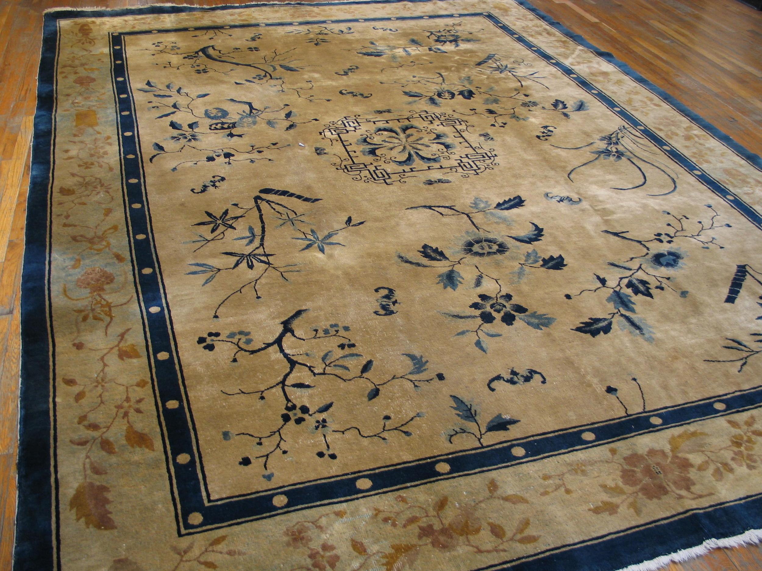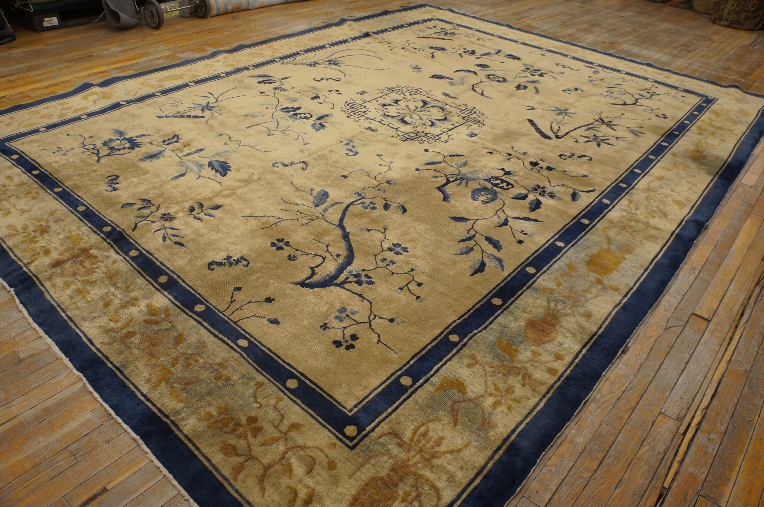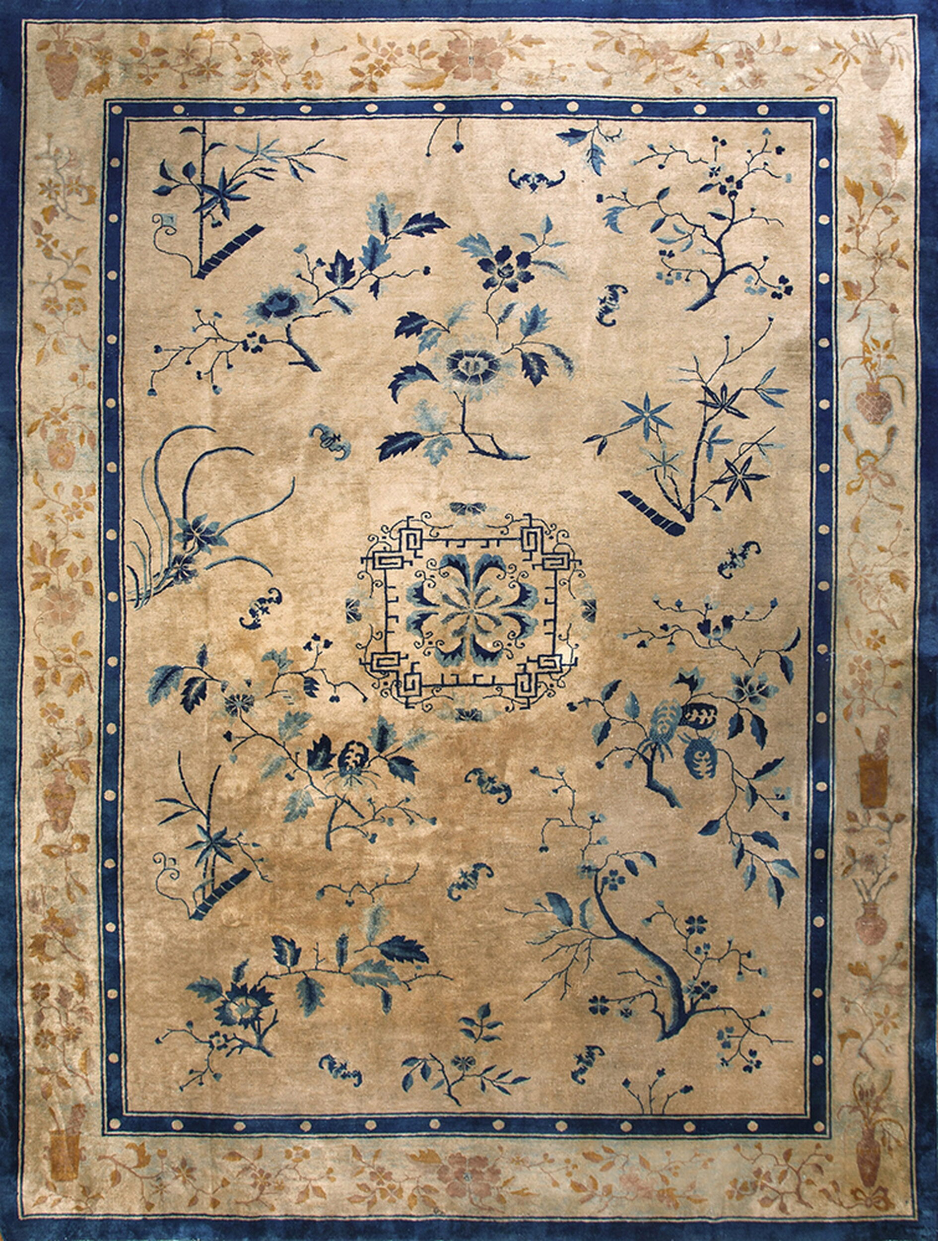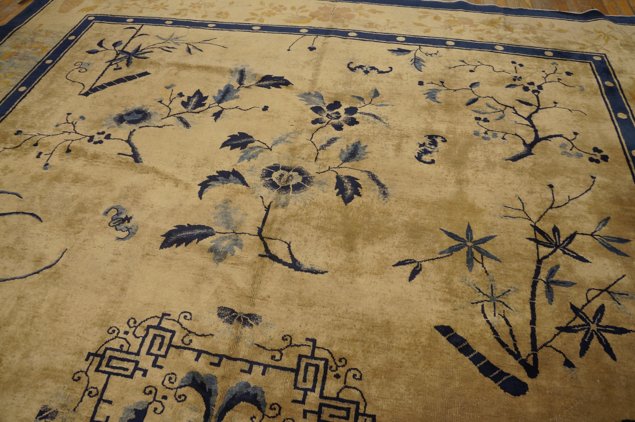 Room Size Ivory Antique 1920s Rectangle Chinese Knotted Wool Rug, Circa Date: 1920s. This exceptional example of early 20th-century Chinese weaving perfectly captures the transition into the Art Deco aesthetic. Its expansive dimensions classify it as a true room size rug, ideal for anchoring a grand living space or formal reception area.