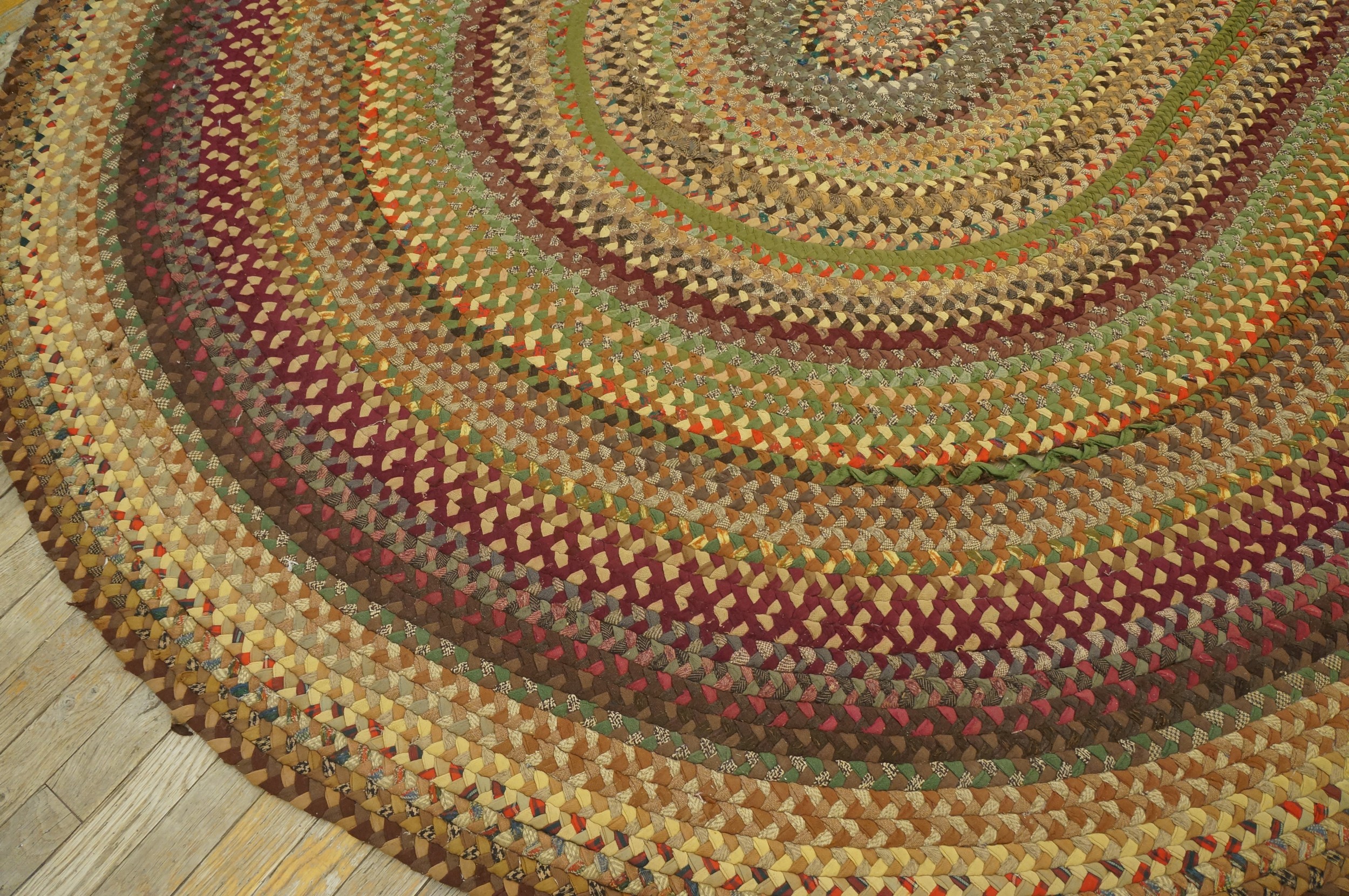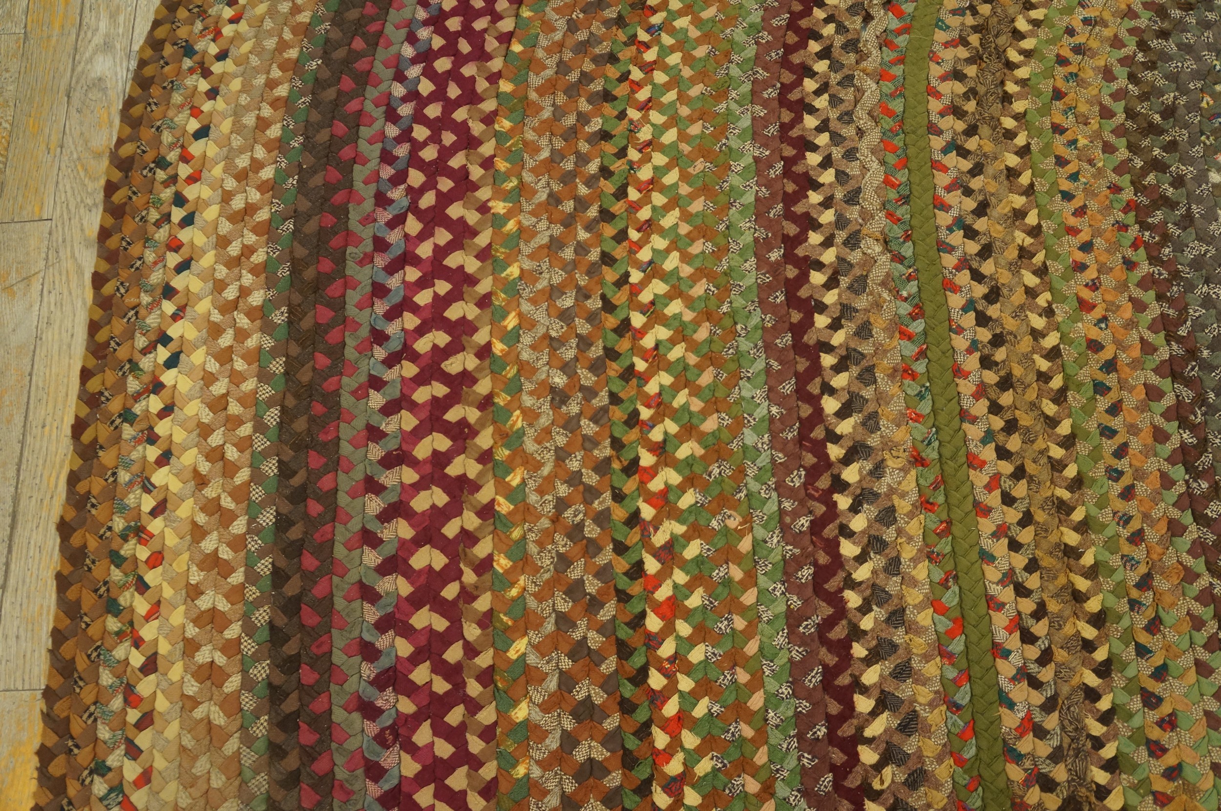 The palette is a rich tapestry of subdued, earthy hues interspersed with flashes of deep crimson and sage green, creating a sophisticated blend of multicolor jewel tones. Unlike tightly patterned pile rugs, the braided technique allows the colors to merge softly, providing textural interest while maintaining a comforting, grounded aesthetic suitable for traditional or rustic interiors.