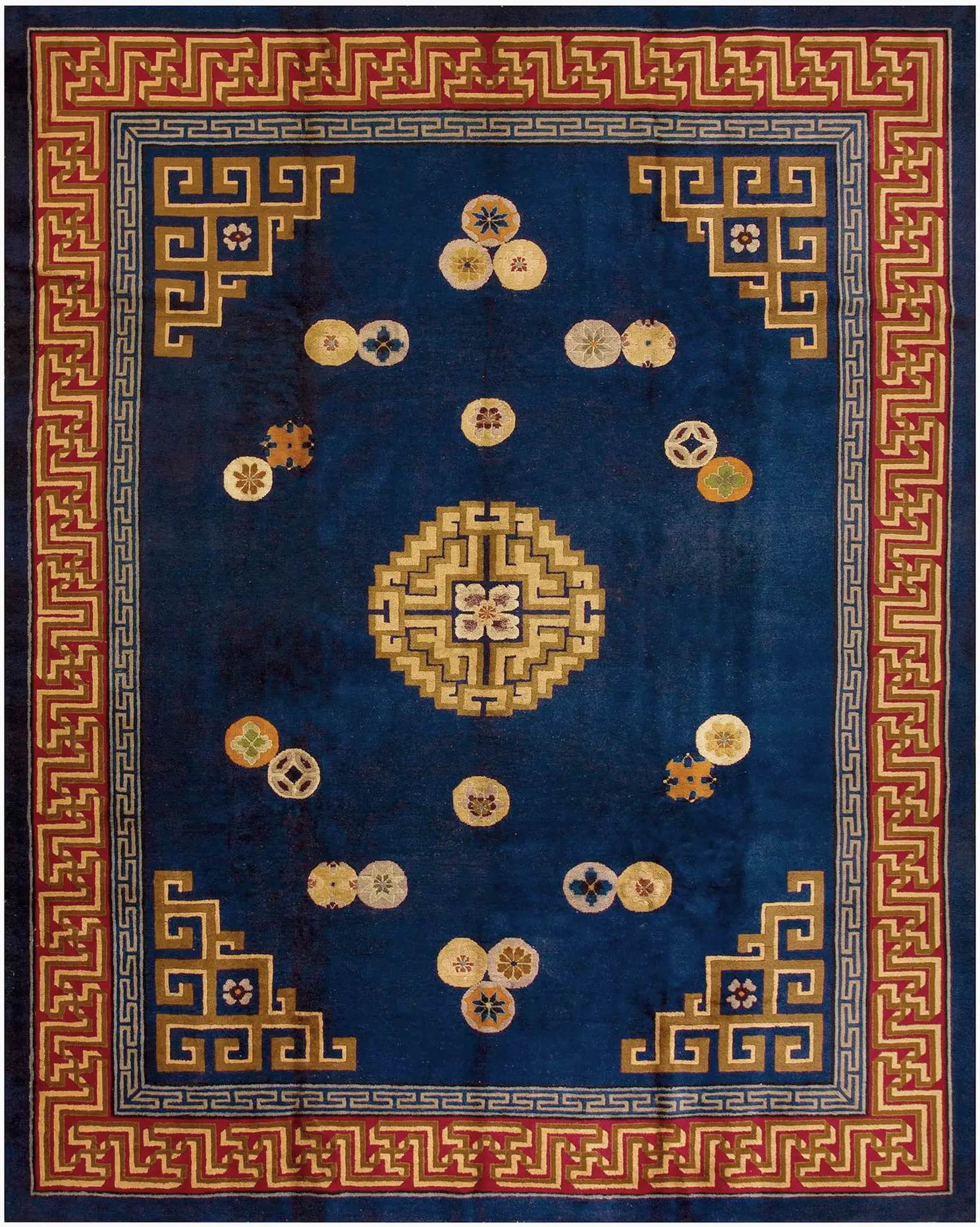 Antique Art Deco Chinese Medallion Navy 1920s Rug, Circa Date: 1920s. This exceptional piece captures the fusion of traditional Chinese symbolism with the bold, geometric aesthetic of the Art Deco movement. Such pieces represent a pivotal moment in textile history, highly sought after among collectors of antique rugs.