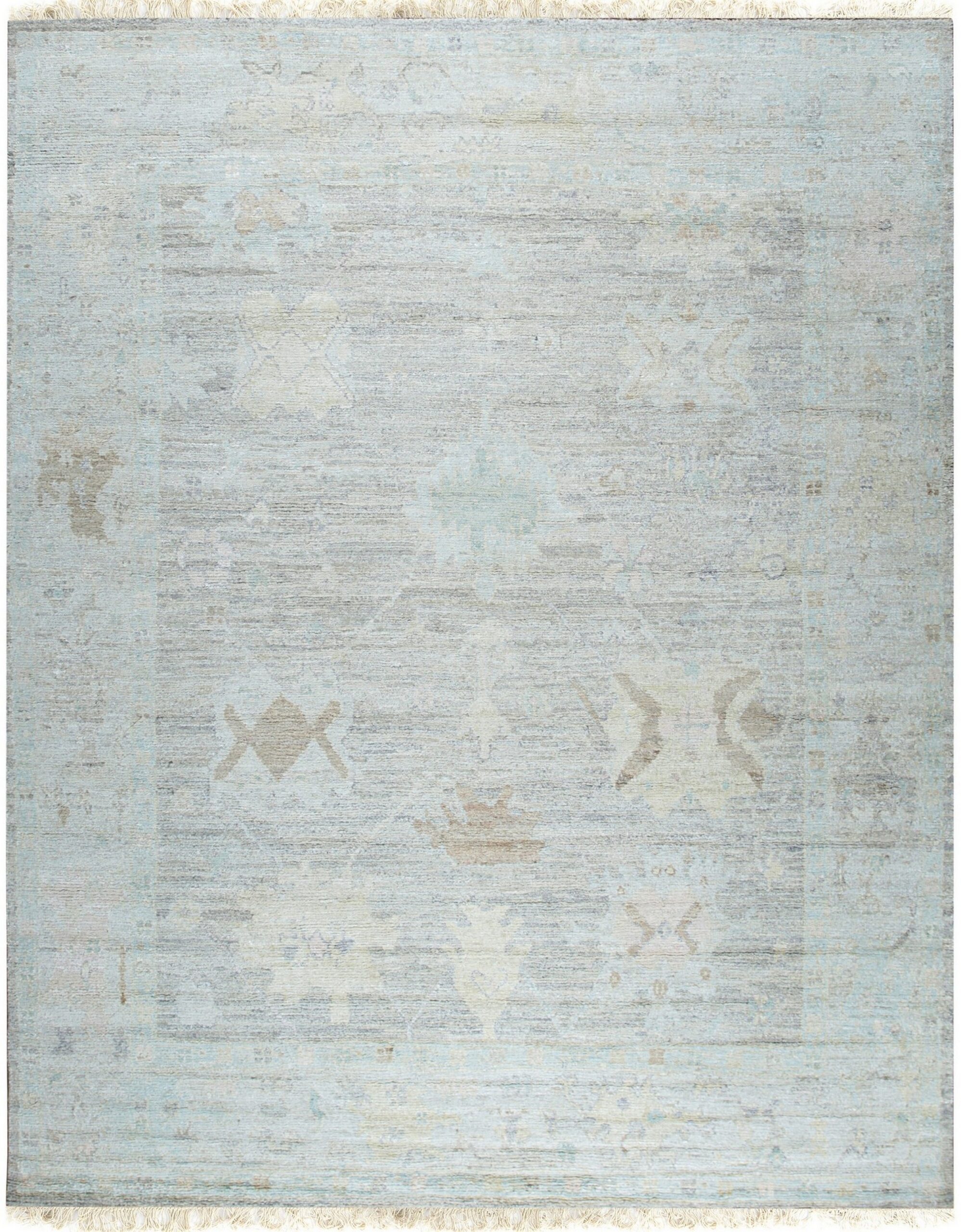 The palette is dominated by soft, ethereal tones of light blue and slate, anchored by a delicate, almost ghost-like field color. This sophisticated use of color ensures the rug acts as a grounding element without overwhelming the space, perfectly aligning with our curated collection of ivory beige cream rugs.