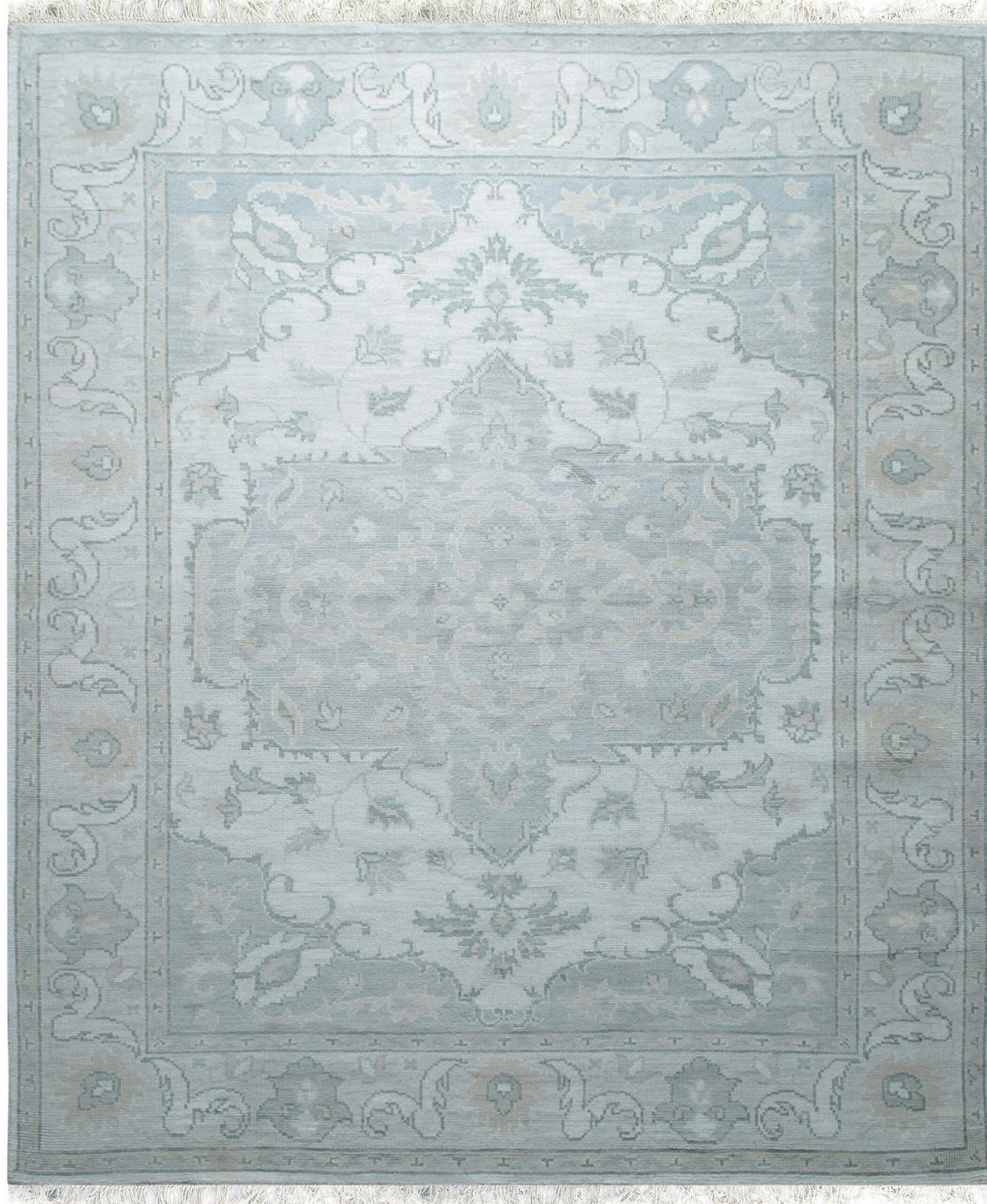 The palette is intentionally restrained, featuring a cool, ethereal blend of pale grey-blue and soft beige tones. This monochromatic approach allows the intricate scrolling vine and palmette motifs to emerge gently from the field. Such neutral compositions are highly sought after for their ability to harmonize with diverse decorative schemes, especially among our collection of ivory beige cream rugs.