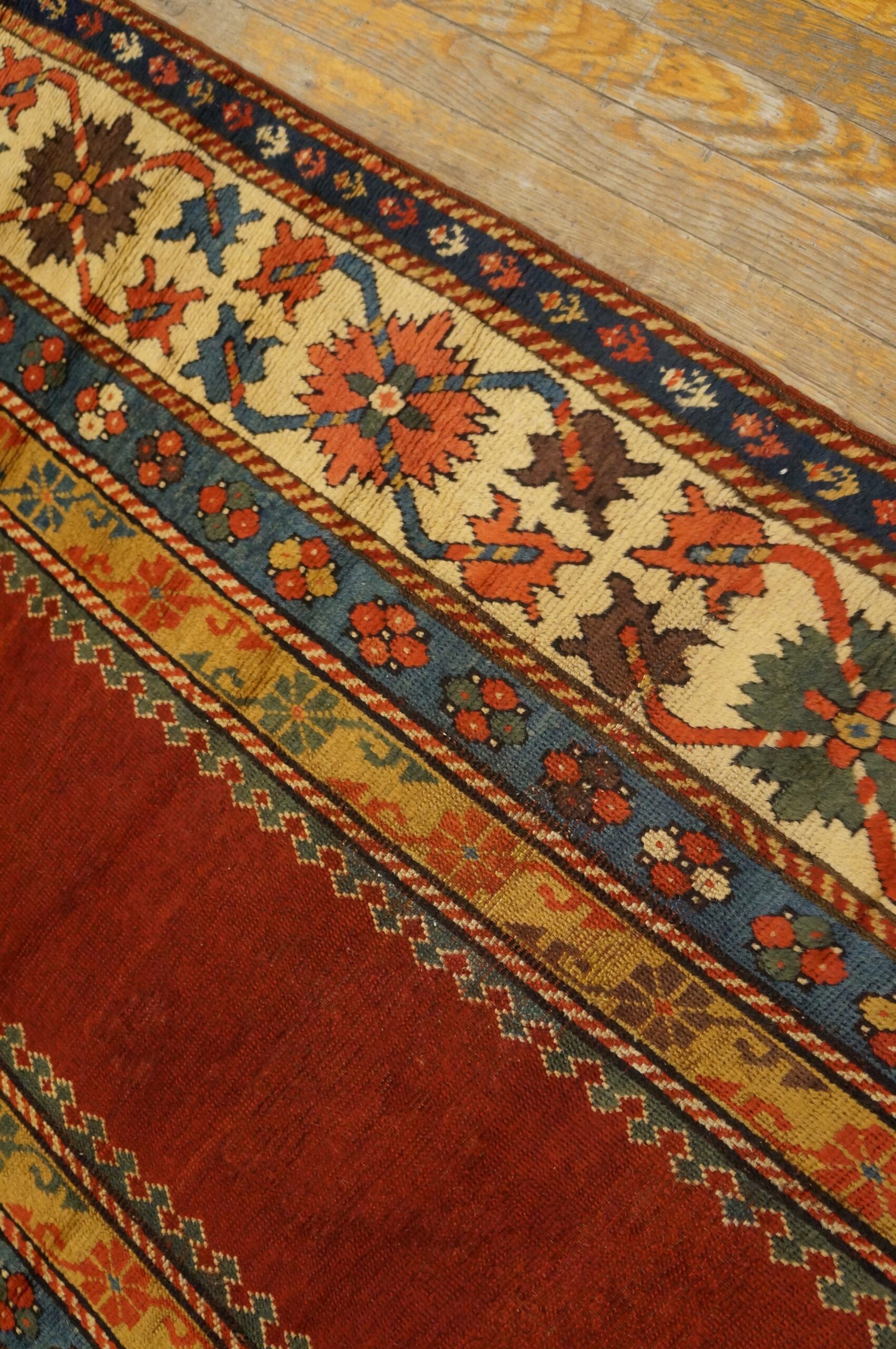 The borders act as a protective architectural frame, often featuring the “Medallion-and-Bracket” or “Leaf-and-Wineglass” motifs, providing a disciplined geometric contrast to the “infinite” energy of the open field. To possess this Mid-19th Century Open Field Kazak is to own a piece of tribal history. It bridges the gap between the rugged survival of the Caucasian steppe and the sophisticated “less-is-more” aesthetic of the modern world—transforming any space into a sanctuary of historical gravity and warm, sun-burnished soul.