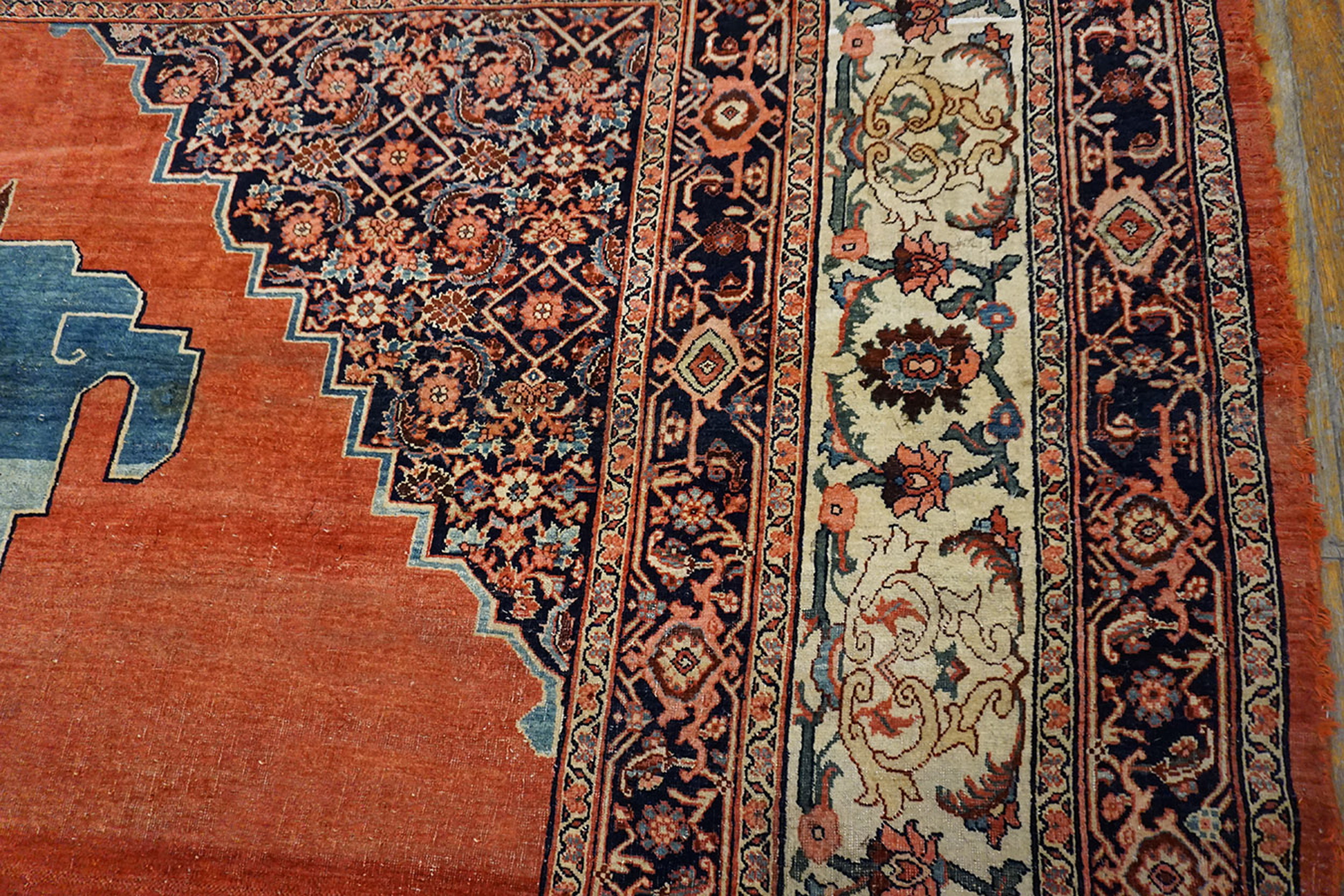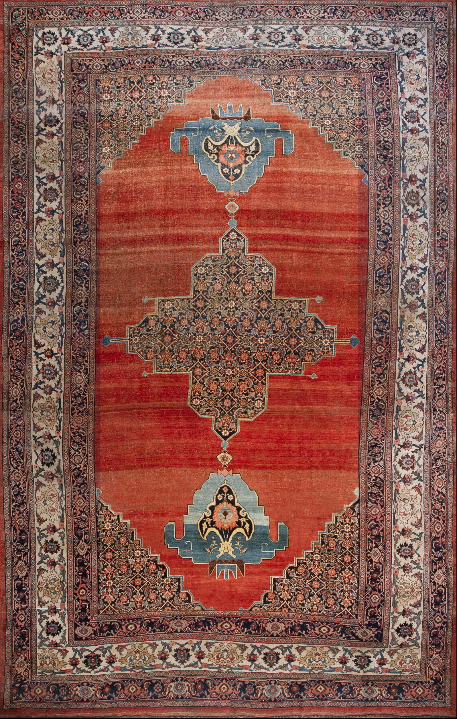 The monumental stepped medallion anchors the composition, rendered in deep indigo and navy blue, providing a striking contrast against the warm field. This central element, along with the corresponding spandrels, is densely populated with intricate arabesques and stylized blossoms, characteristic of sophisticated floral rugs from the period. The complexity of the knotting ensures that even the smallest motifs retain crisp definition.